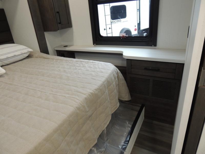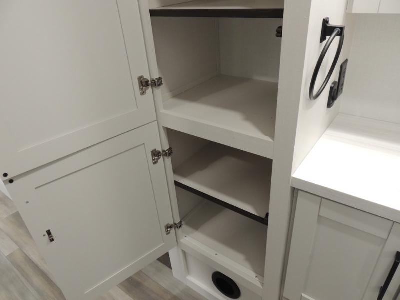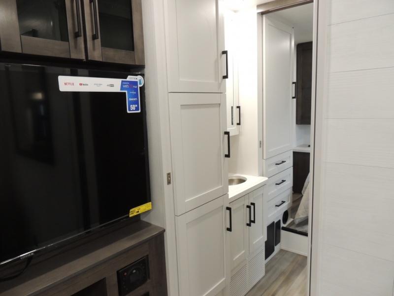 Relax inside while sitting on the sofa, at the booth dinette or on the swivel captains chairs while enjoying the fireplace and 50" TV, or unwind outside under the 18' electric awning while watching the exterior TV. After shopping in town or hiking the trails you can get cleaned up in the private toilet and shower room then brush your teeth in the bathroom sink a few steps outside the door. The private bedroom includes a space saving sliding door, a unique rear queen bed slide, plus storage. The cook will enjoy making meals using the residential-size microwave and Furrion all-in-one cooktop and oven, then storing leftovers in the 8 cu. ft. refrigerator. And the L-shaped counter with sink will come in handy.