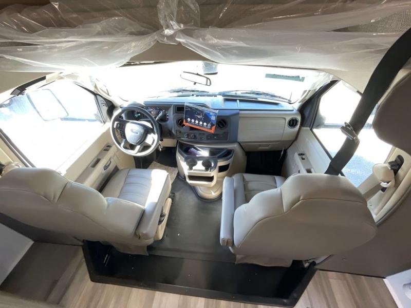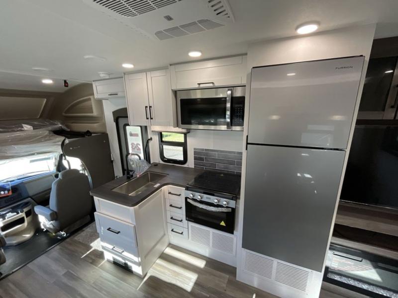With any Odyssey Class C gas motorhome by Entegra Coach, the driver will appreciate the power from the 325 HP engine, the towing capacity from the 7,500 lb. hitch, the tire pressure monitoring system, the navigation from the Sony infotainment center with Apple CarPlay and Android Auto, plus the backup and side-view cameras when parking and driving down the highway. The kitchen offers full amenities including a recessed stainless steel sink with a cutting board sink cover, LED-lit pressed countertops, a decorative backsplash, and a pop-up charging station with 110 outlet and USB plugs to keep your smart phones charged. Get ready for luxury in a Class C, choose your favorite today!