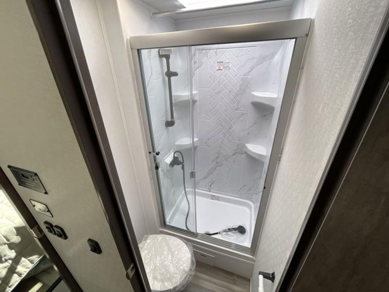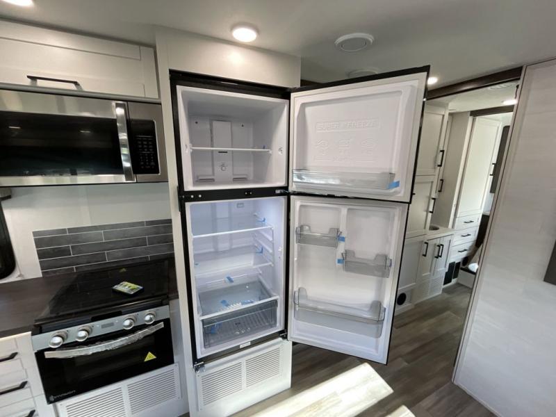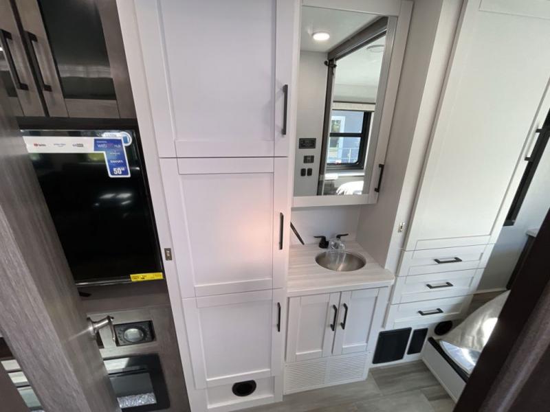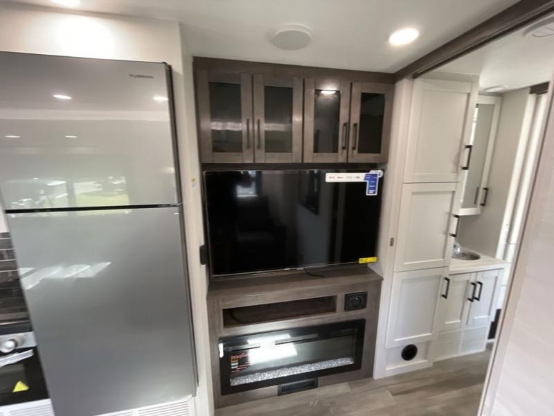 Relax inside while sitting on the sofa, at the booth dinette or on the swivel captains chairs while enjoying the fireplace and 50" TV, or unwind outside under the 18' electric awning while watching the exterior TV. After shopping in town or hiking the trails you can get cleaned up in the private toilet and shower room then brush your teeth in the bathroom sink a few steps outside the door. The private bedroom includes a space saving sliding door, a unique rear queen bed slide, plus storage. The cook will enjoy making meals using the residential-size microwave and Furrion all-in-one cooktop and oven, then storing leftovers in the 8 cu. ft. refrigerator. And the L-shaped counter with sink will come in handy.