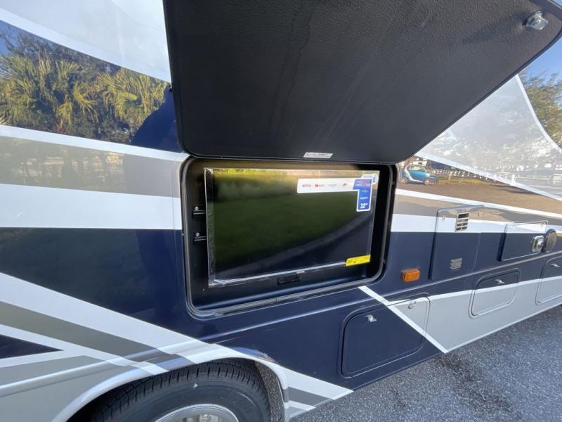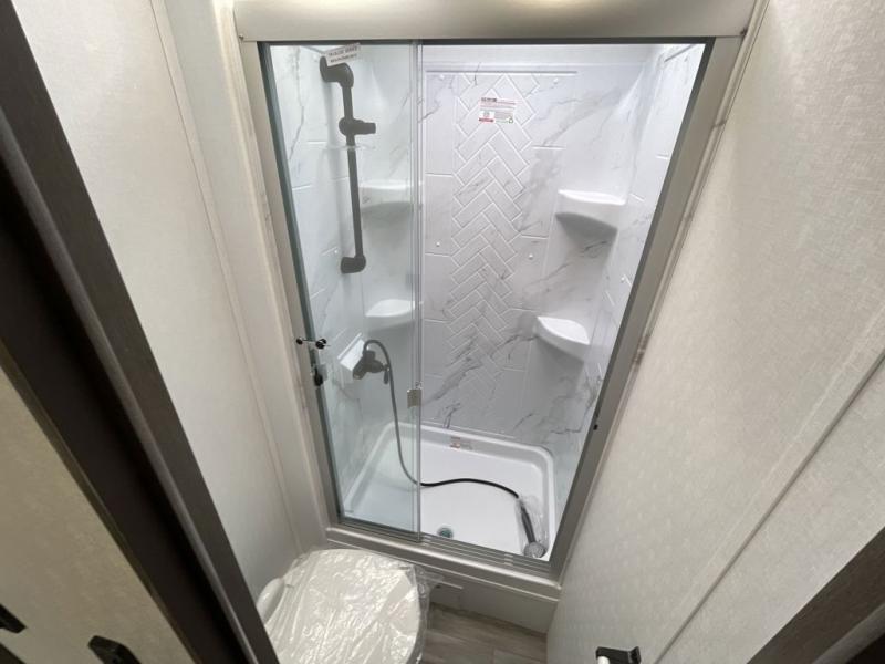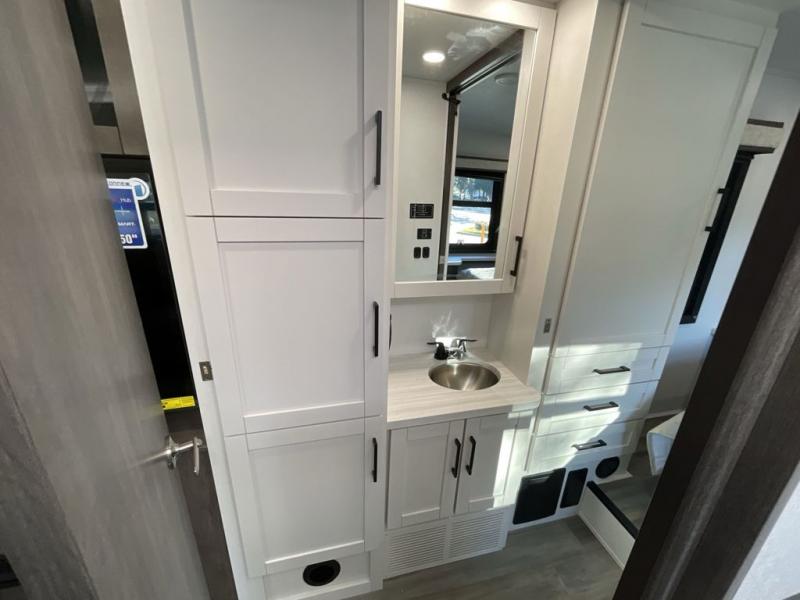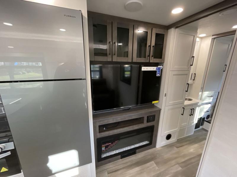 Relax inside while sitting on the sofa, at the booth dinette or on the swivel captains chairs while enjoying the fireplace and 50" TV, or unwind outside under the 18' electric awning while watching the exterior TV. After shopping in town or hiking the trails you can get cleaned up in the private toilet and shower room then brush your teeth in the bathroom sink a few steps outside the door. The private bedroom includes a space saving sliding door, a unique rear queen bed slide, plus storage. The cook will enjoy making meals using the residential-size microwave and Furrion all-in-one cooktop and oven, then storing leftovers in the 8 cu. ft. refrigerator. And the L-shaped counter with sink will come in handy.