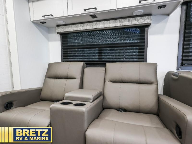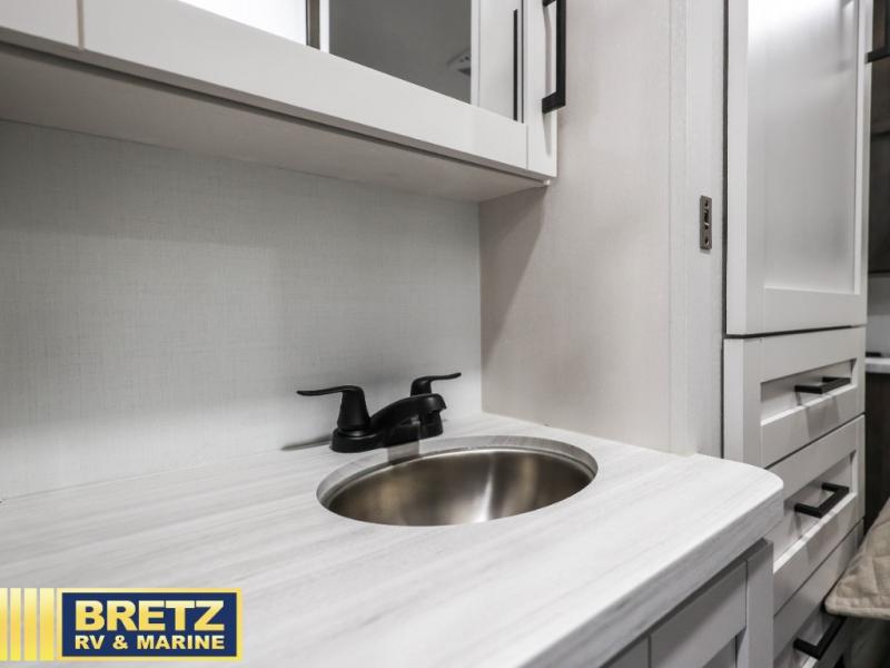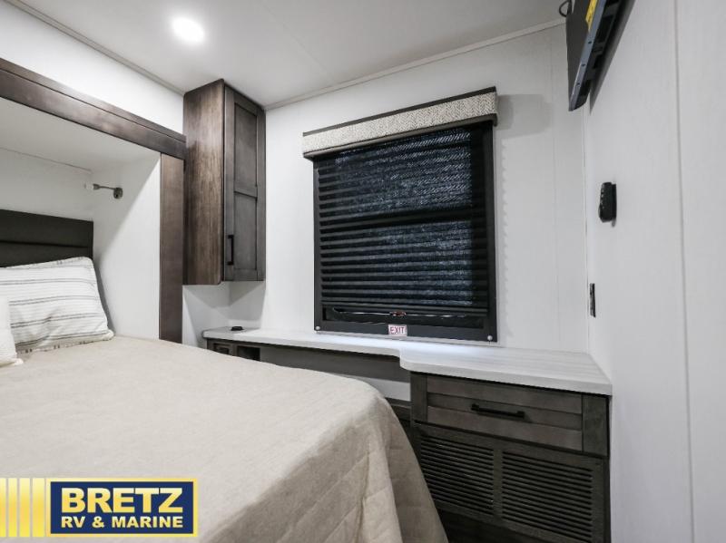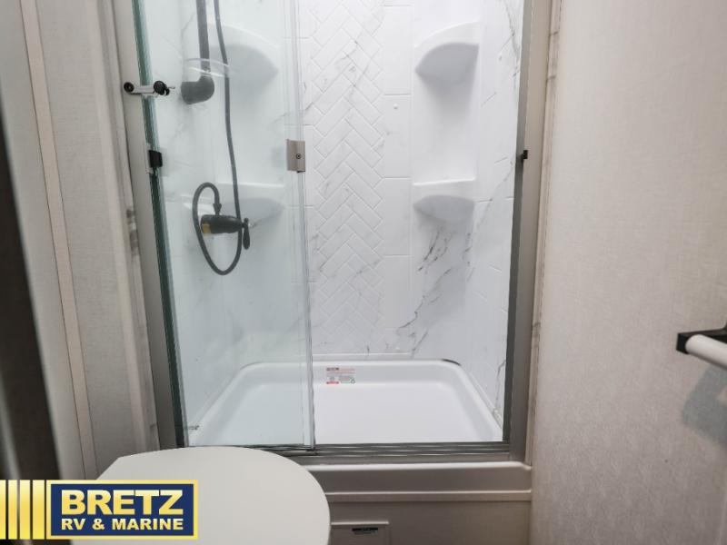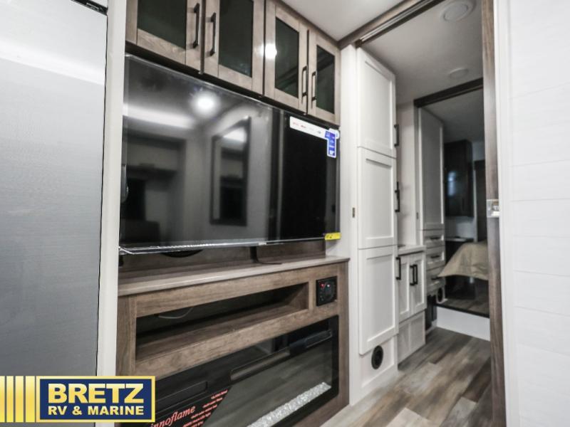Relax inside while sitting on the sofa, at the booth dinette or on the swivel captains chairs while enjoying the fireplace and 50" TV, or unwind outside under the 18' electric awning while watching the exterior TV. After shopping in town or hiking the trails you can get cleaned up in the private toilet and shower room then brush your teeth in the bathroom sink a few steps outside the door. The private bedroom includes a space saving sliding door, a unique rear queen bed slide, plus storage. The cook will enjoy making meals using the residential-size microwave and Furrion all-in-one cooktop and oven, then storing leftovers in the 8 cu. ft. refrigerator. And the L-shaped counter with sink will come in handy.