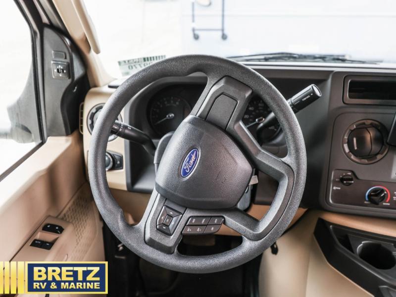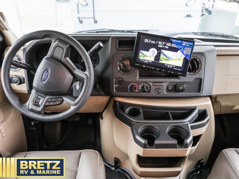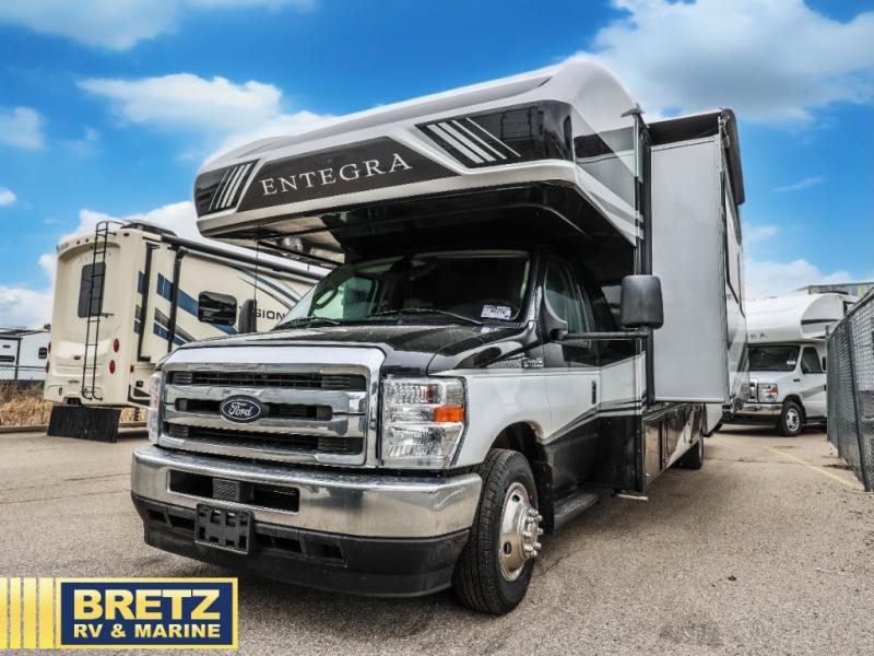 With any Odyssey Class C gas motorhome by Entegra Coach, the driver will appreciate the power from the 325 HP engine, the towing capacity from the 7,500 lb. hitch, the tire pressure monitoring system, the navigation from the Sony infotainment center with Apple CarPlay and Android Auto, plus the backup and side-view cameras when parking and driving down the highway. The kitchen offers full amenities including a recessed stainless steel sink with a cutting board sink cover, LED-lit pressed countertops, a decorative backsplash, and a pop-up charging station with 110 outlet and USB plugs to keep your smart phones charged. Get ready for luxury in a Class C, choose your favorite today!
