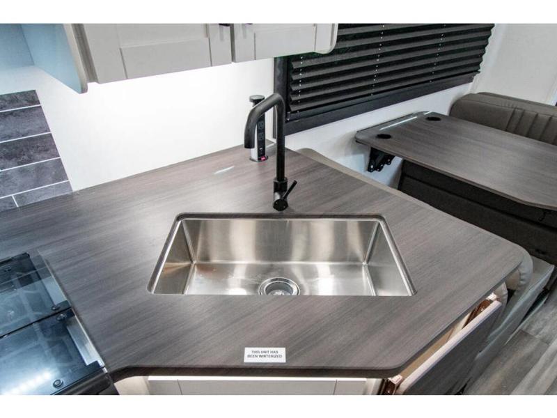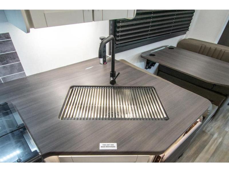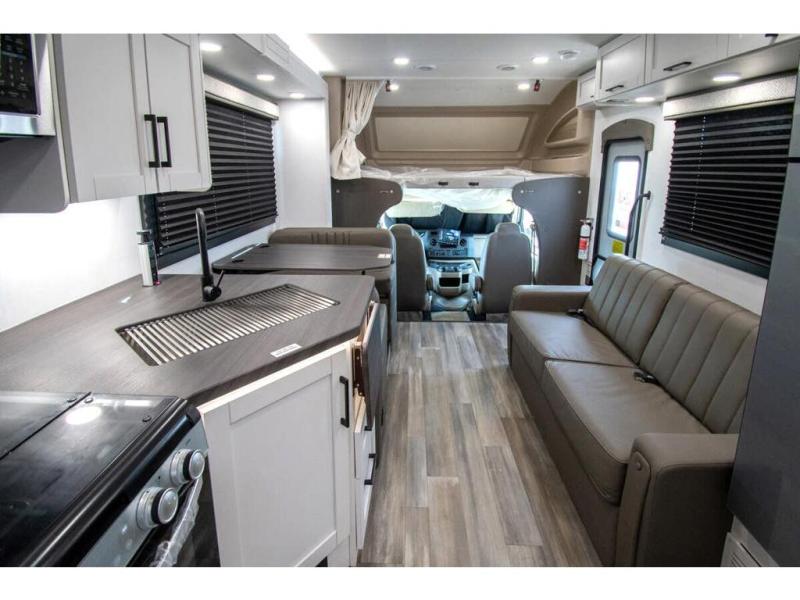 With any Odyssey Class C gas motorhome by Entegra Coach, the driver will appreciate the power from the 325 HP engine, the towing capacity from the 7,500 lb. hitch, the tire pressure monitoring system, the navigation from the Sony infotainment center with Apple CarPlay and Android Auto, plus the backup and side-view cameras when parking and driving down the highway. The kitchen offers full amenities including a recessed stainless steel sink with a cutting board sink cover, LED-lit pressed countertops, a decorative backsplash, and a pop-up charging station with 110 outlet and USB plugs to keep your smart phones charged. Get ready for luxury in a Class C, choose your favorite today!