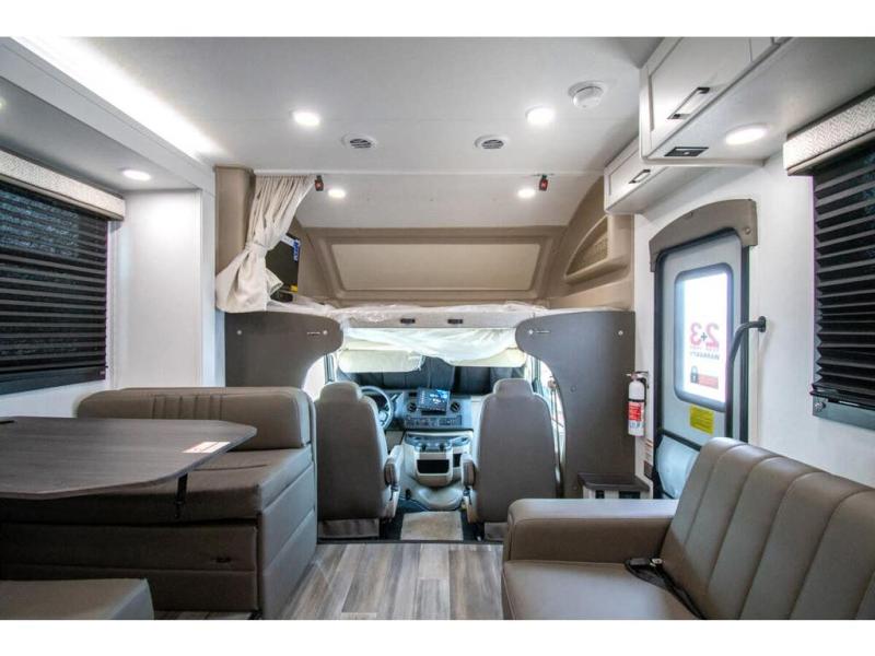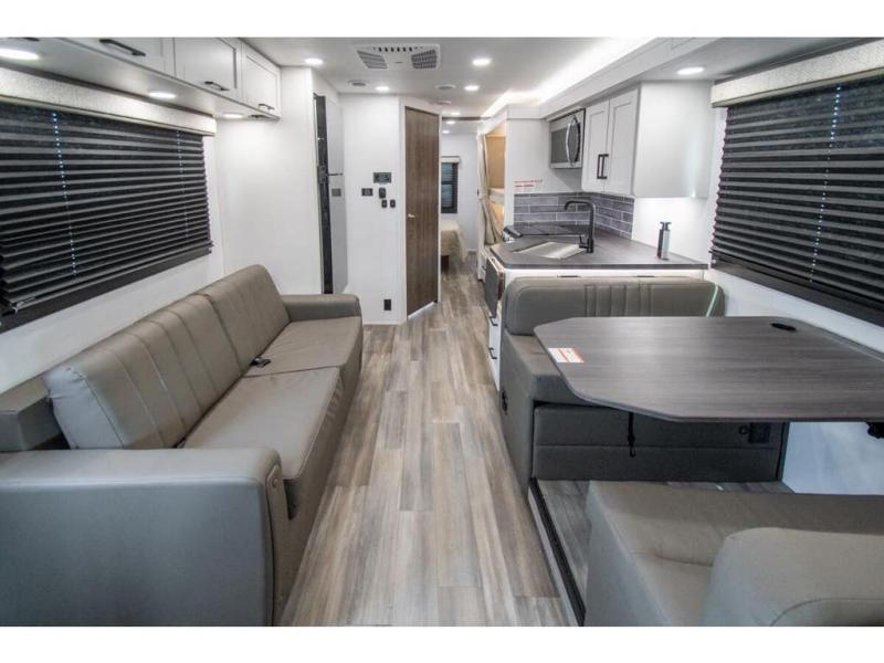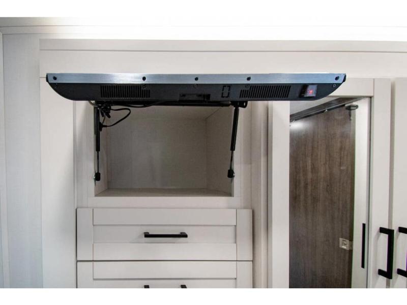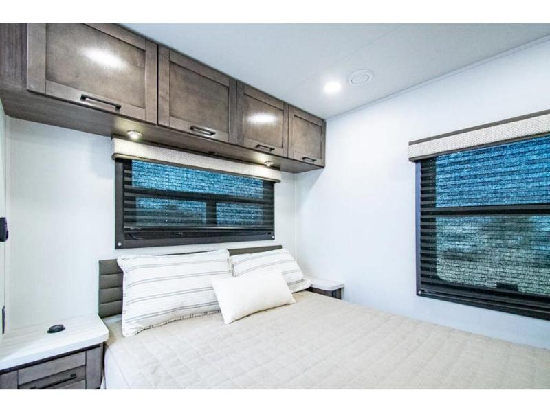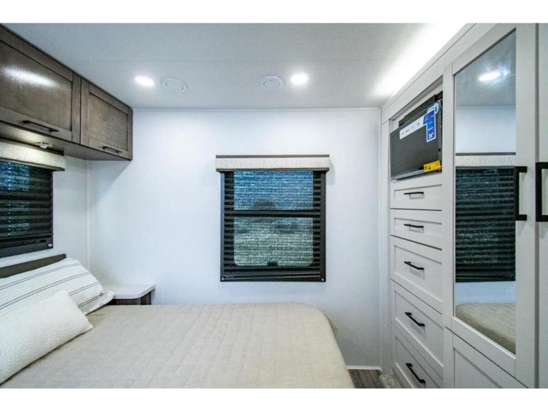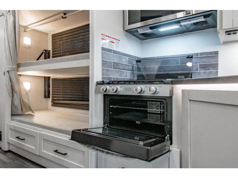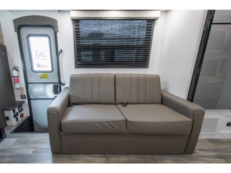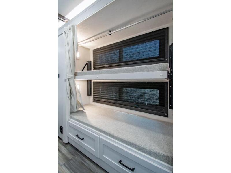 Gather your family and load up for travel games, camping games and all around comfort and luxury! The full-wall slide provides extra floor space from just behind the swivel captains chairs all the way back to the private rear bedroom with a queen bed and clothing storage. The bunk beds are across from the main entry to the bathroom, and your kids or grandkids will love this space as well as the front cab-over bunk. You even have more sleeping space provided by the booth dinette and sofa once easily set up for bedtime. And the cook will have a residential-size microwave, a Furrion all-in-one cooktop and oven, plus an 8 cu. ft. refrigerator to keep everyone fed, and the pantry will hold the snacks. Everyone can also enjoy the 18' electric awning while at the campsite either day or night thanks to the LED lights, and the exterior TV will allow you to watch the big game in the great outdoors.
