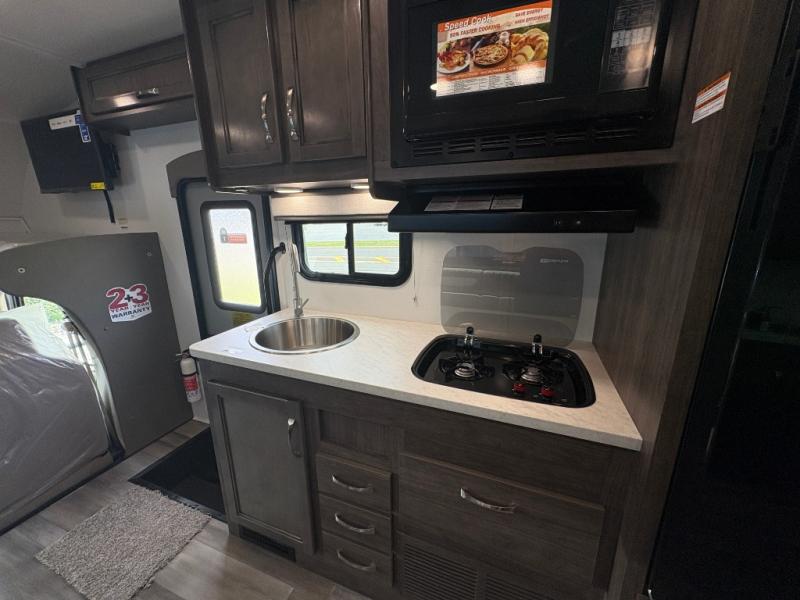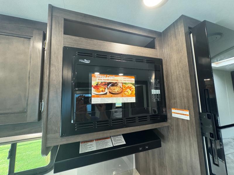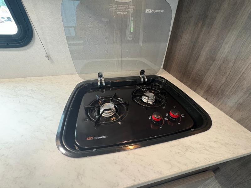 This coach will feel a little more like home with its spacious interior thanks to the U-shaped dinette slide! You can dine here, play games, and even let guests sleep here. There is additional sleeping space in the cab-over bunk and the rear corner 60" x 74" queen bed. The rear corner bath includes the 24" x 32" shower and foot flush toilet, and the stainless steel bath sink is just outside this room so two people can freshen up at once. You will find everything you need to cook meals each day, including a two burner cooktop with a flush cover, a convection microwave, plus a 10 cu. ft. 12V refrigerator to store perishables.