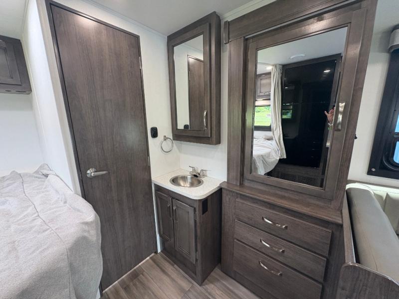 The Odyssey SE Class C gas motorhome by Entegra Coach is constructed with TuffShell vacuum-bond laminated sidewalls, a one-piece, seamless fiberglass front cap, and bead-foam insulation for added durability and strength. Whether you choose a model with a Ford E-350 chassis or Chevy 4500 chassis, you will get a durable coach made to last. The driver will also love the power steering, tilt steering wheel, and auxiliary start switch. The 7' interior ceiling height will provide plenty of space to stretch out and the high-intensity, recessed LED lights will make your space feel more like home. All of your power needs will be met with a 4,000-watt generator and 12V house battery, plus there is a 13.5K BTU A/C and 30K BTU furnace to keep you comfortable all year long. There are a couple additions you might want to add to further customize your Odyssey SE, like the optional automatic hydraulic leveling jacks and the optional 200W solar panel for some off-grid camping!