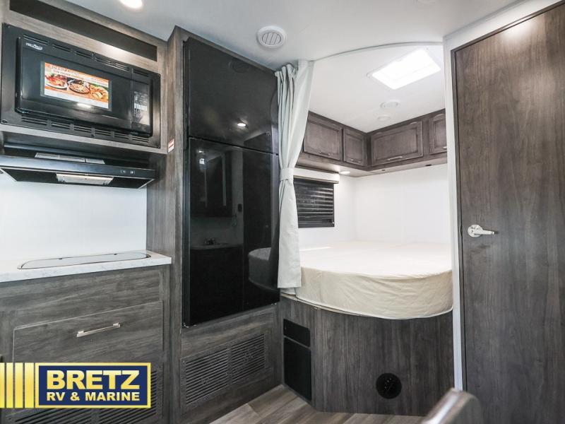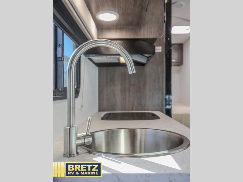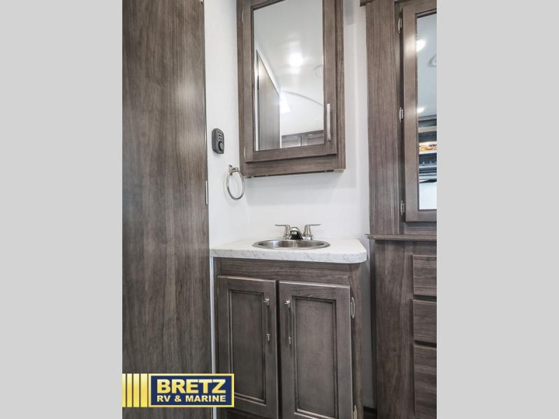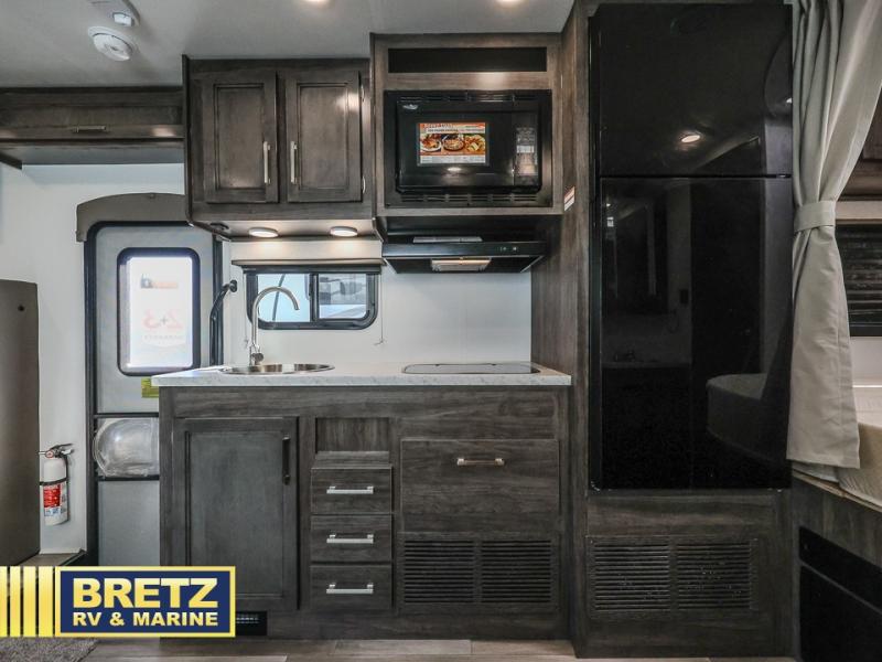 This coach will feel a little more like home with its spacious interior thanks to the U-shaped dinette slide! You can dine here, play games, and even let guests sleep here. There is additional sleeping space in the cab-over bunk and the rear corner 60" x 74" queen bed. The rear corner bath includes the 24" x 32" shower and foot flush toilet, and the stainless steel bath sink is just outside this room so two people can freshen up at once. You will find everything you need to cook meals each day, including a two burner cooktop with a flush cover, a convection microwave, plus a 10 cu. ft. 12V refrigerator to store perishables.