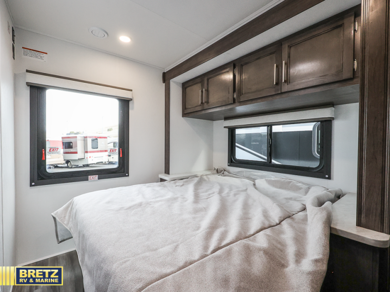 Make your trips complete in this coach that can sleep four to five each night. There is a cab-over bunk with a 750 lb. capacity for guests and an RV queen bed slide out in the rear corner bedroom. The booth dinette can be used to dine at, play games, and even sleep an additional guest or two little ones. A two burner cooktop comes standard in the kitchen, along with a convection microwave, a stainless steel sink, and a 10 cu. ft. refrigerator. You will also appreciate having a full bath on board, and the 13' electric awning outside will provide a place to relax with a cold drink!