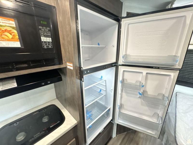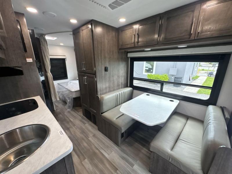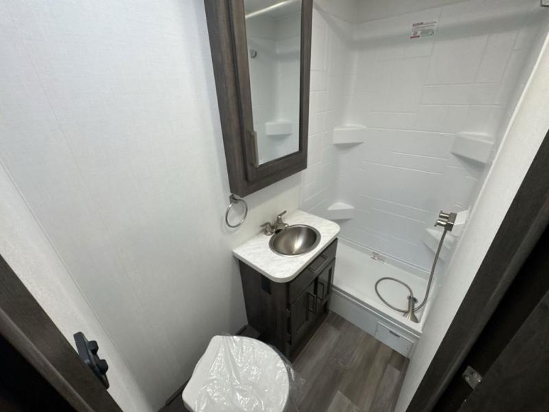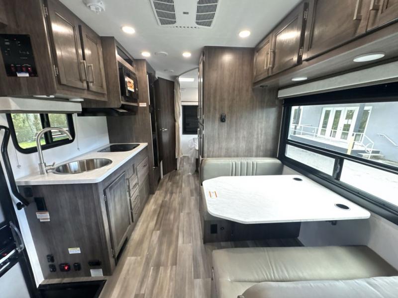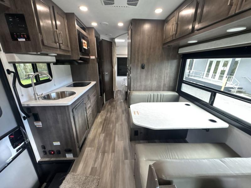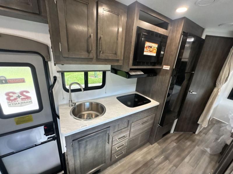 Make your trips complete in this coach that can sleep four to five each night. There is a cab-over bunk with a 750 lb. capacity for guests, and an RV queen bed slide out in the rear corner bedroom. The booth dinette can be used to dine at, play games, and even sleep an additional guest or two little ones. A two-burner cooktop comes standard in the kitchen, along with a convection microwave, a stainless-steel sink, and a 10-cu. ft. refrigerator. You will also appreciate having a full bath on board, and the 13' electric awning outside will provide a place to relax with a cold drink!