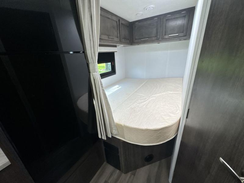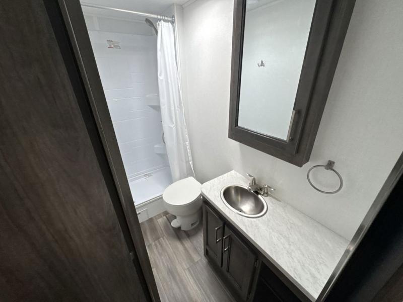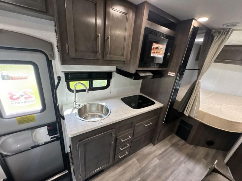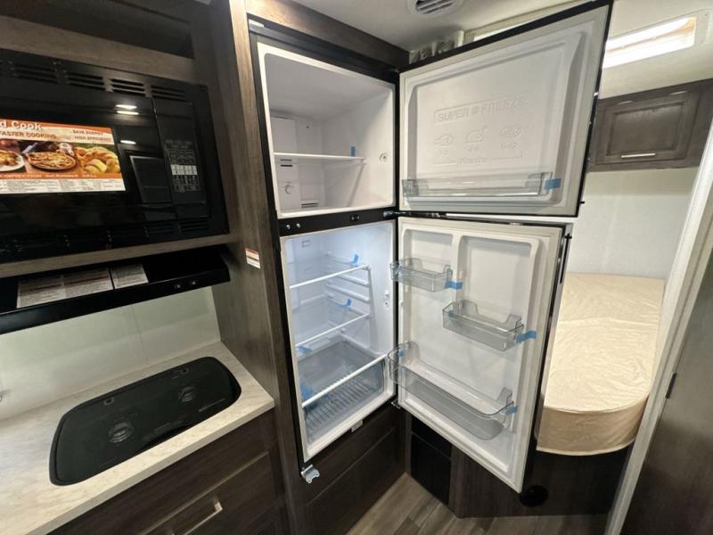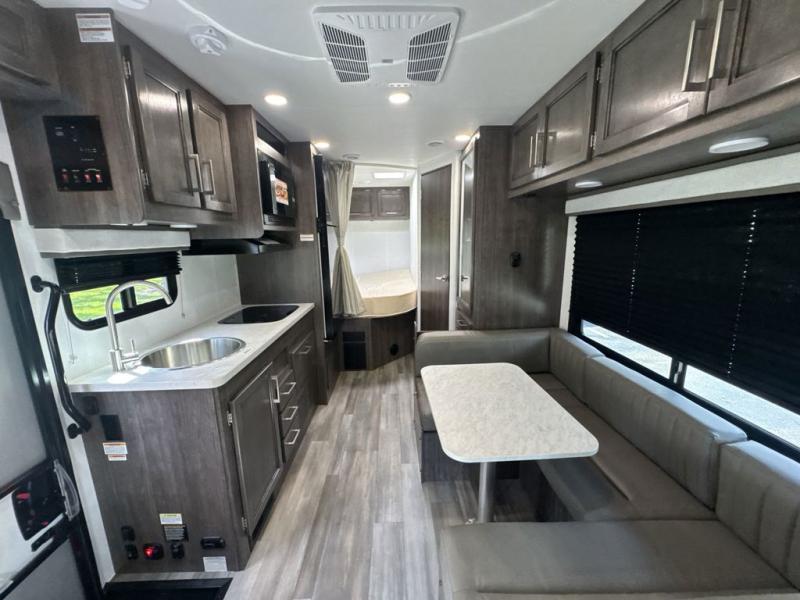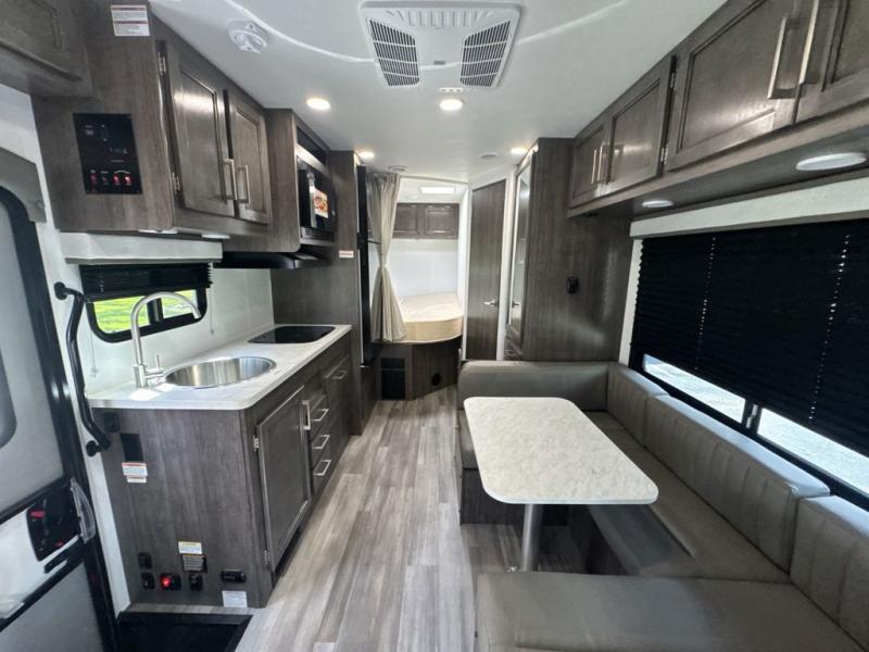This coach will feel a little more like home with a booth dinette and full bath onboard! You can dine here, play games, and even let guests sleep here. There is additional sleeping space in the cab-over bunk and the rear corner 60" x 74" queen bed. You will find everything you need to cook meals each day, including a two-burner cooktop with a flush cover, a convection microwave, plus a 10-cu. ft. 12V refrigerator to store perishables.