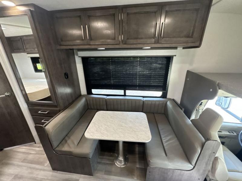 The Odyssey SE Class C gas motorhome by Entegra Coach is constructed with TuffShell vacuum-bond laminated sidewalls, a one-piece, seamless fiberglass front cap, and bead-foam insulation for added durability and strength. Whether you choose a model with a Ford E-350 chassis, Ford E-450 or Chevy 4500 chassis, you will get a durable coach made to last. The driver will also love the power steering, tilt steering wheel, and auxiliary start switch. The 7' interior ceiling height will provide plenty of space to stretch out and the high-intensity, recessed LED lights will make your space feel more like home. All of your power needs will be met with a 4,000-watt generator and 12V house battery, plus there is a 13.5K BTU A/C and 30K BTU furnace to keep you comfortable all year long. There are a couple additions you might want to add to further customize your Odyssey SE, like the optional automatic hydraulic leveling jacks and the optional 200W solar panel for some off-grid camping!