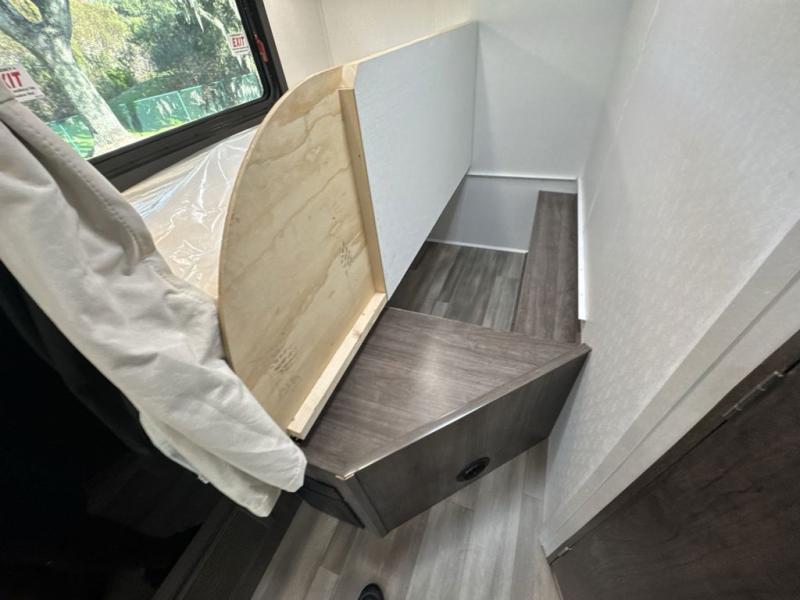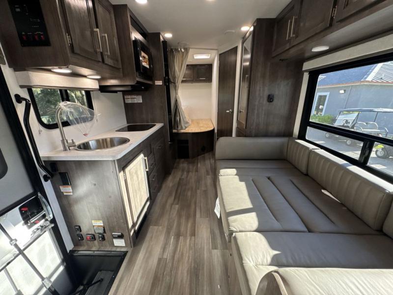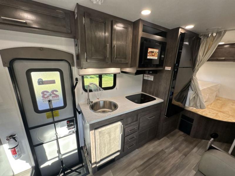 This coach will feel a little more like home with a booth dinette and full bath onboard! You can dine here, play games, and even let guests sleep here. There is additional sleeping space in the cab-over bunk and the rear corner 60" x 74" queen bed. You will find everything you need to cook meals each day, including a two-burner cooktop with a flush cover, a convection microwave, plus a 10-cu. ft. 12V refrigerator to store perishables.