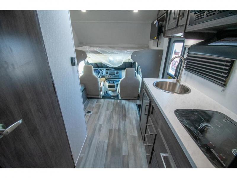 The Odyssey SE Class C gas motorhome by Entegra Coach is constructed with TuffShell vacuum-bond laminated sidewalls, a one-piece, seamless fiberglass front cap, and bead-foam insulation for added durability and strength. Whether you choose a model with a Ford E-350 chassis or Chevy 4500 chassis, you will get a durable coach made to last. The driver will also love the power steering, tilt steering wheel, and auxiliary start switch. The 7' interior ceiling height will provide plenty of space to stretch out and the high-intensity, recessed LED lights will make your space feel more like home. All of your power needs will be met with a 4,000-watt generator and 12V house battery, plus there is a 13.5K BTU A/C and 30K BTU furnace to keep you comfortable all year long. There are a couple additions you might want to add to further customize your Odyssey SE, like the optional automatic hydraulic leveling jacks and the optional 200W solar panel for some off-grid camping!
