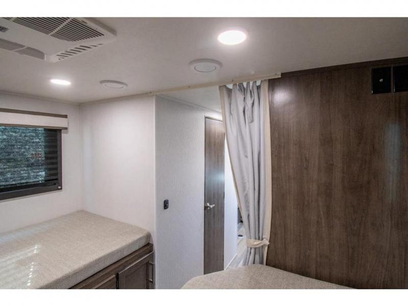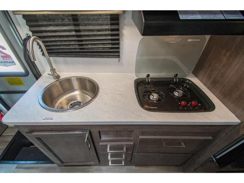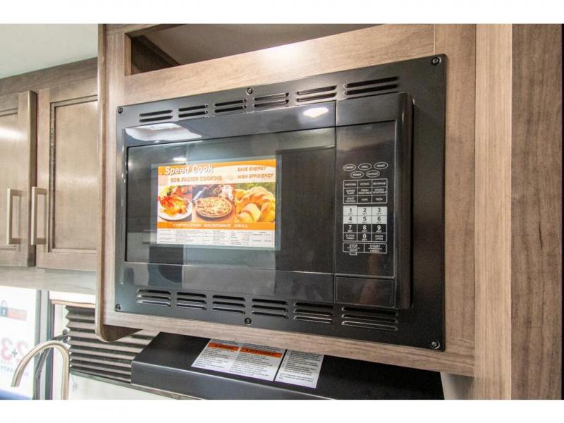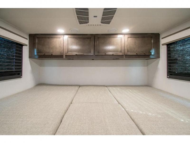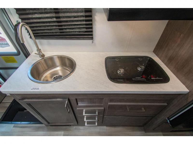 This coach is perfect for traveling with your buddy or honey since there are twin beds that convert to a king-size bed if you choose! There is a large overhead cabinet above the bed for storage, along with cabinets in the kitchen and a medicine cabinet in the bathroom. A 48" bench with a removable table provides a place to enjoy meals or you can eat outdoors under the 16' electric awning. The full kitchen includes a two burner cooktop and convection microwave to cook meals each day, plus a 10 cu. ft. 12V refrigerator for food storage.