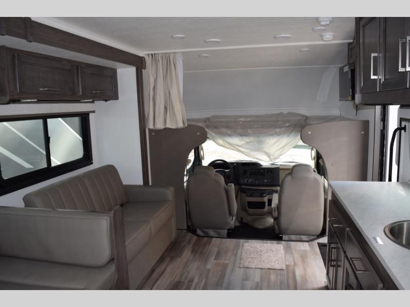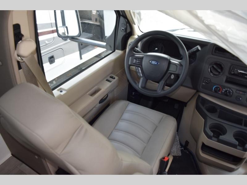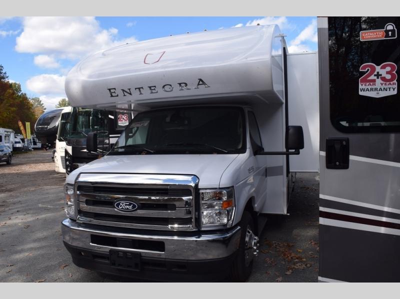 The Odyssey SE Class C gas motorhome by Entegra Coach is constructed with TuffShell vacuum-bond laminated sidewalls, a one-piece, seamless fiberglass front cap, and bead-foam insulation for added durability and strength. Whether you choose a model with a Ford E-350 chassis, Ford E-450 or Chevy 4500 chassis, you will get a durable coach made to last. The driver will also love the power steering, tilt steering wheel, and auxiliary start switch. The 7' interior ceiling height will provide plenty of space to stretch out and the high-intensity, recessed LED lights will make your space feel more like home. All of your power needs will be met with a 4,000-watt generator and 12V house battery, plus there is a 13.5K BTU A/C and 30K BTU furnace to keep you comfortable all year long. There are a couple additions you might want to add to further customize your Odyssey SE, like the optional automatic hydraulic leveling jacks and the optional 200W solar panel for some off-grid camping!