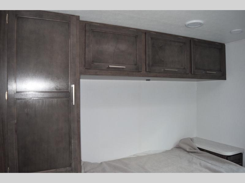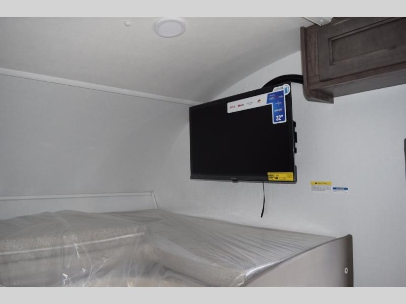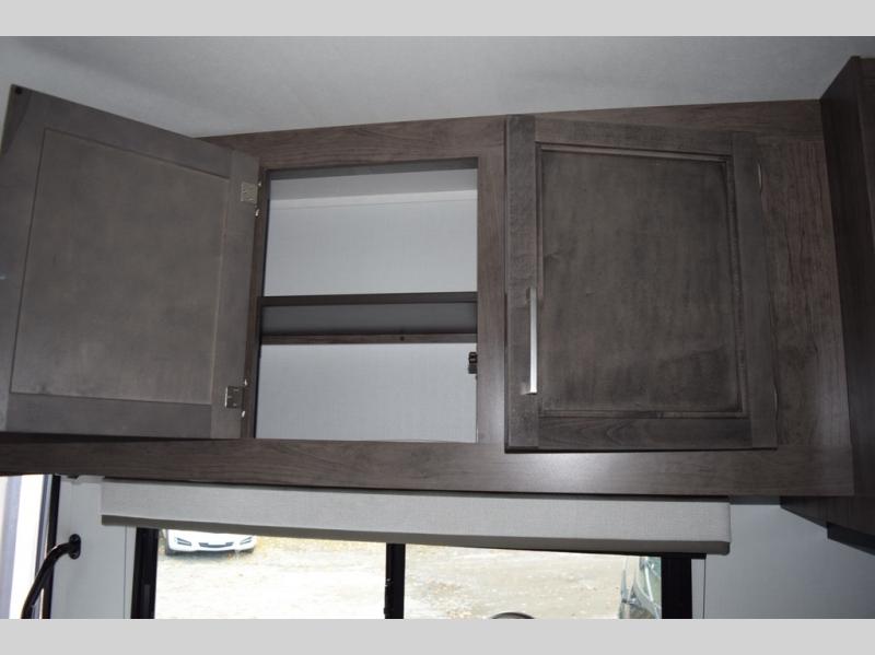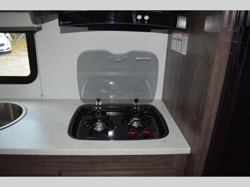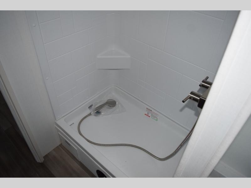 Travel in style in this spacious coach for seven to eight! Once you park at the campsite, you can start lunch on two-burner cooktop or in the convection microwave oven. There is a U-shaped dinette, jack-knife sofa, and cab-over bunk for dining, seating, and sleeping space. You'll find your own space in the rear bedroom with an RV queen bed, large wardrobe, and a privacy curtain. The 24" x 36" independent shower is right across from the private toilet and sink, allowing two people to use this space at once!
