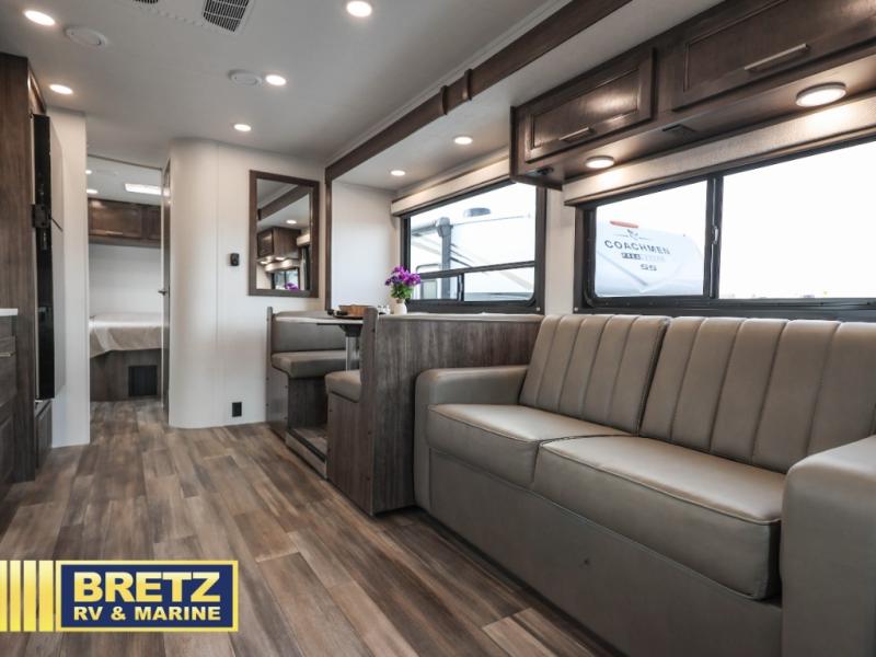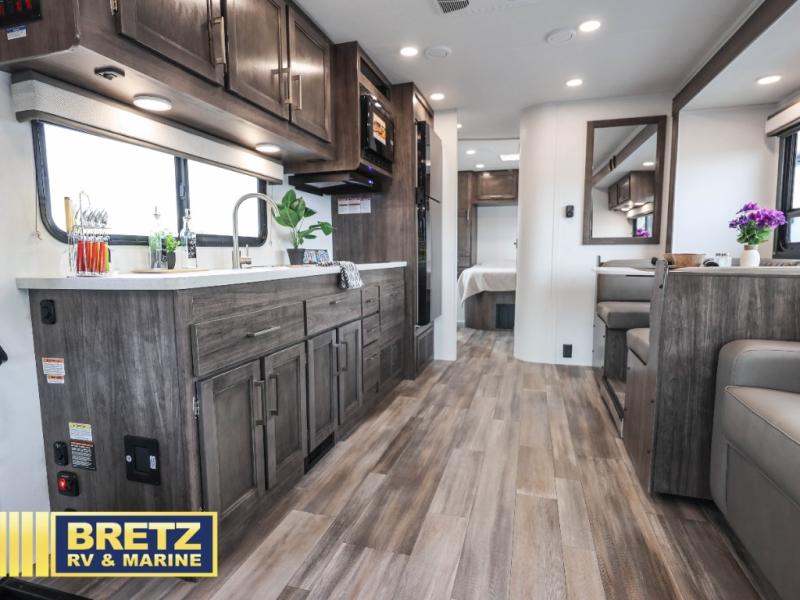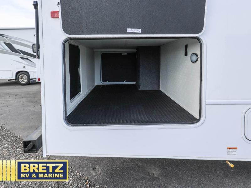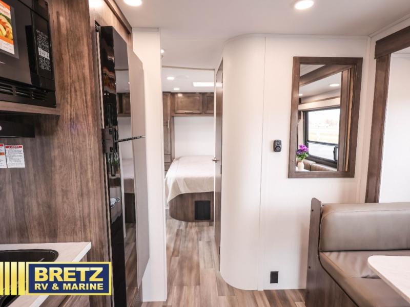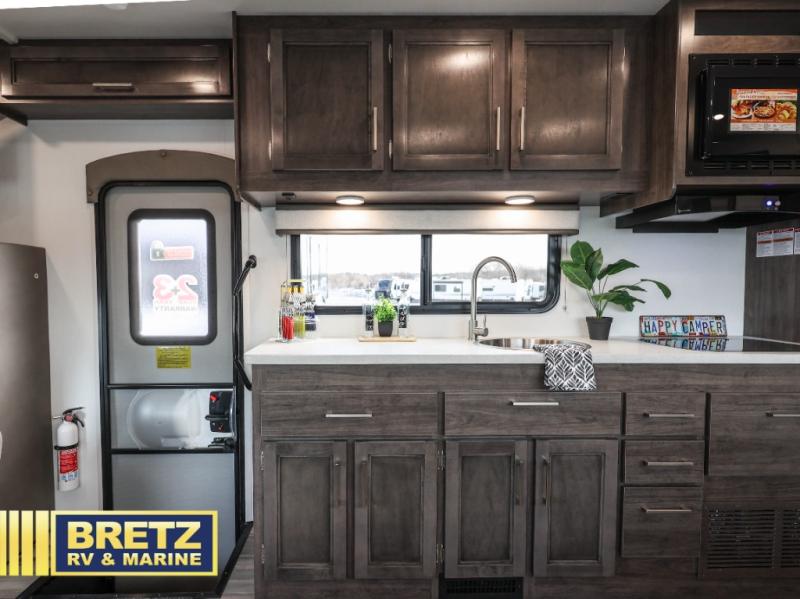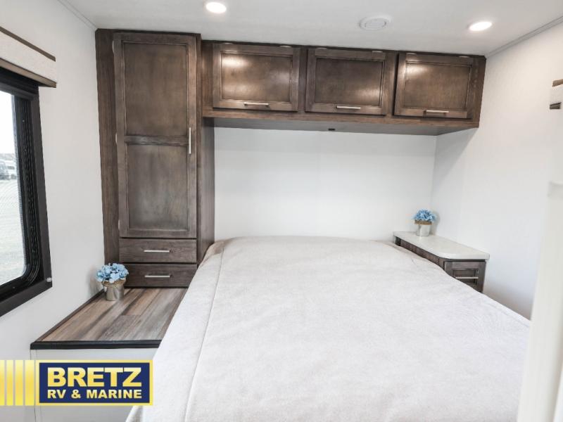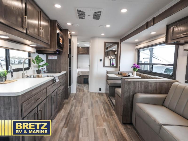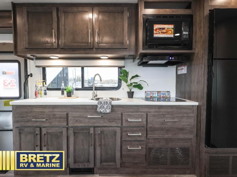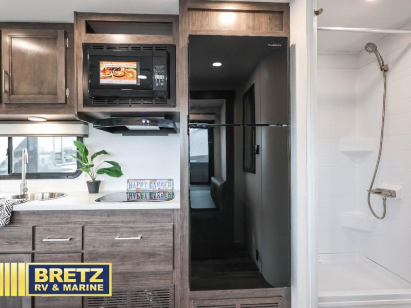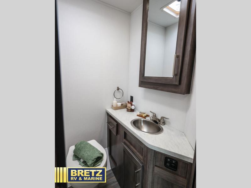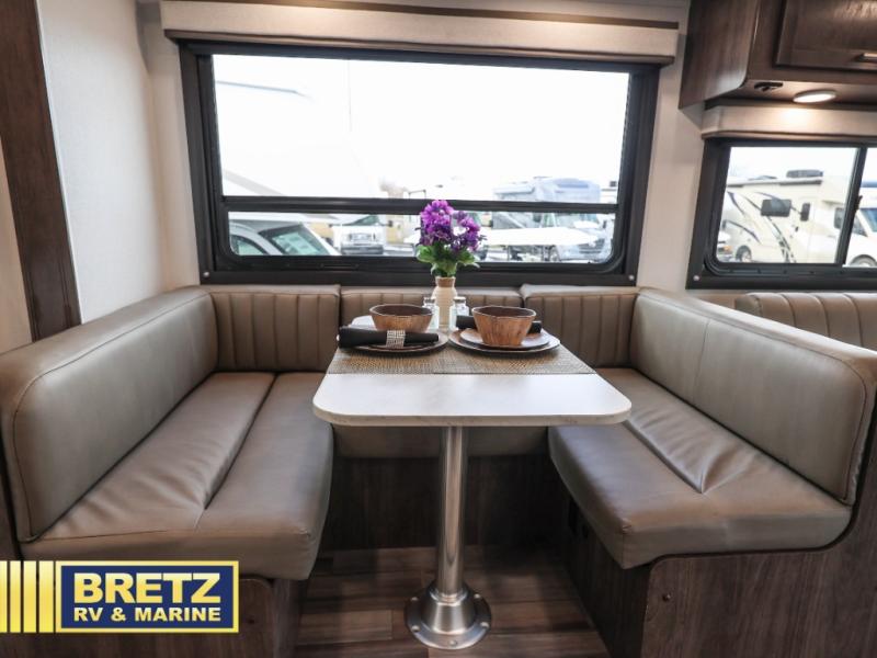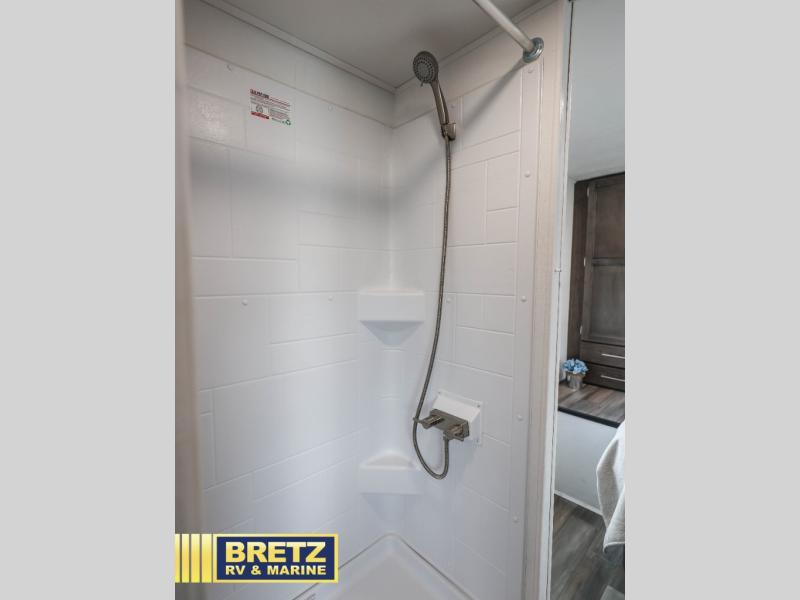 Travel in style in this spacious coach for seven to eight! Once you park at the campsite, you can start lunch on two-burner cooktop or in the convection microwave oven. There is a U-shaped dinette, jack-knife sofa, and cab-over bunk for dining, seating, and sleeping space. You'll find your own space in the rear bedroom with an RV queen bed, large wardrobe, and a privacy curtain. The 24" x 36" independent shower is right across from the private toilet and sink, allowing two people to use this space at once!