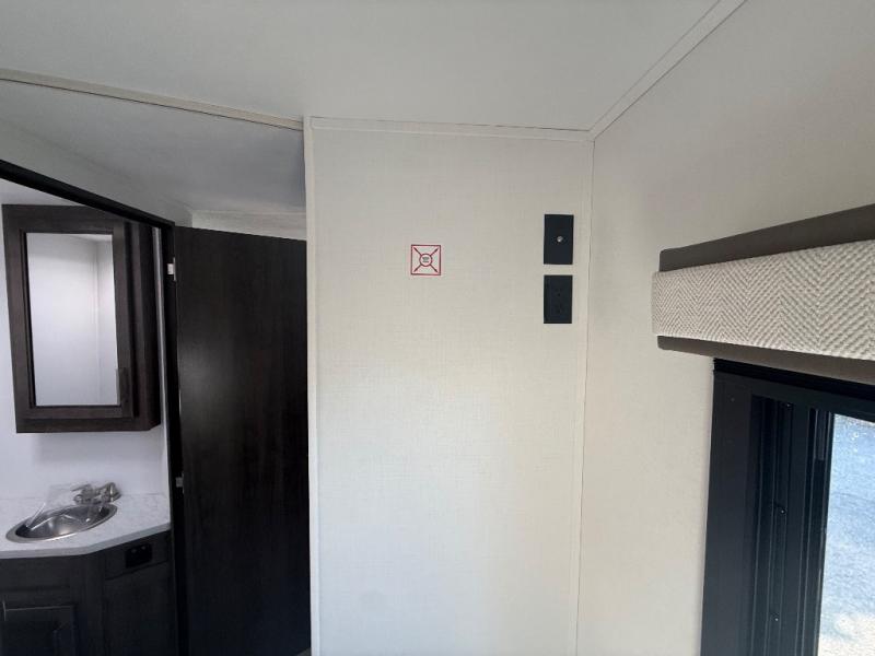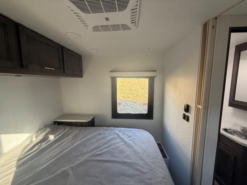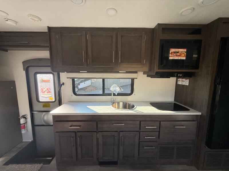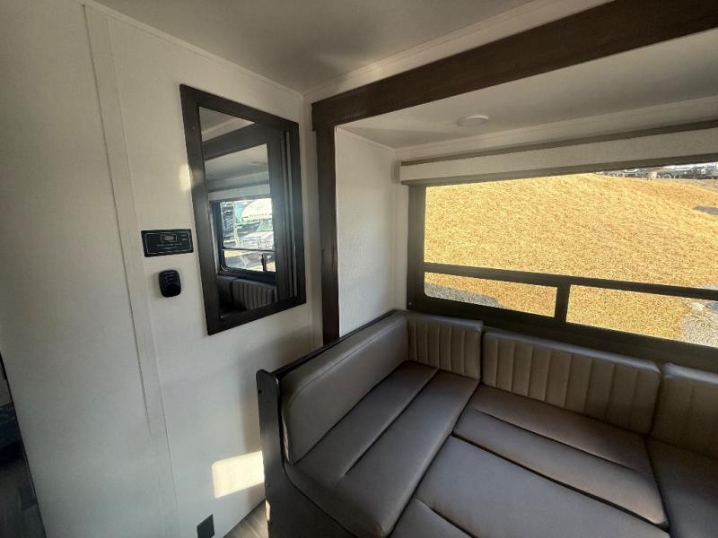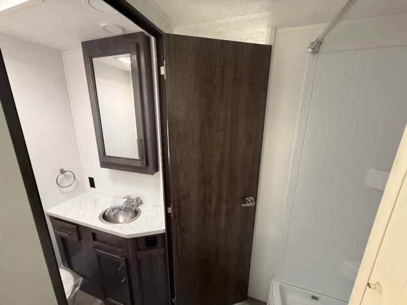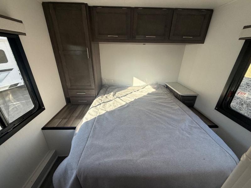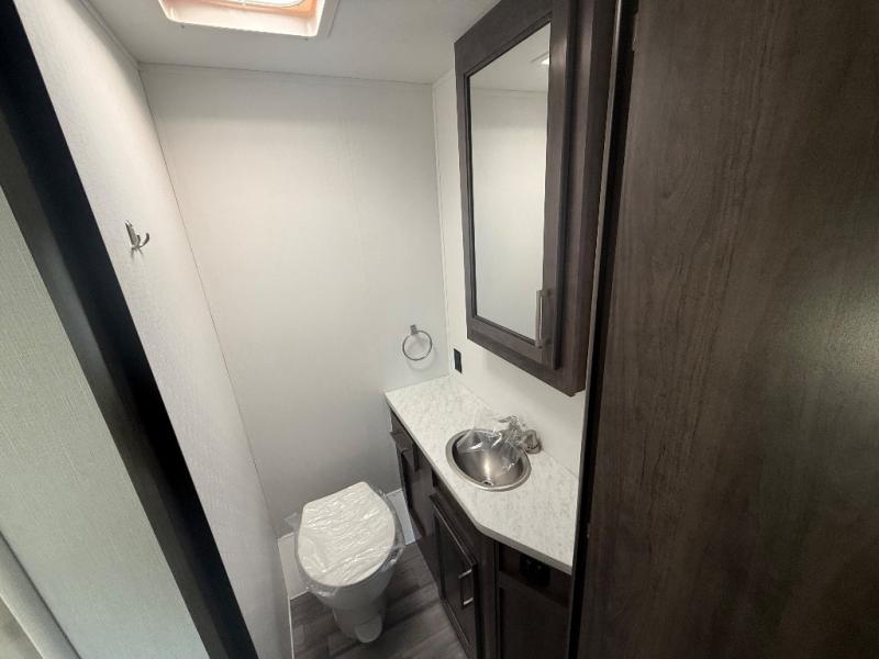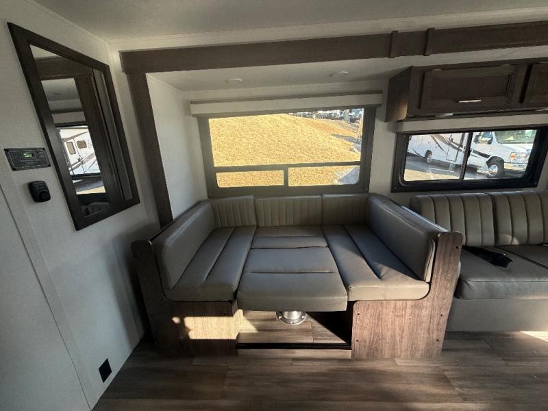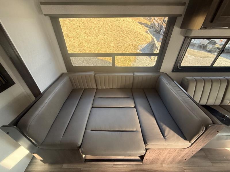 Travel in style in this spacious coach for seven to eight! Once you park at the campsite, you can start lunch on two-burner cooktop or in the convection microwave oven. There is a U-shaped dinette, jack-knife sofa, and cab-over bunk for dining, seating, and sleeping space. You'll find your own space in the rear bedroom with an RV queen bed, large wardrobe, and a privacy curtain. The 24" x 36" independent shower is right across from the private toilet and sink, allowing two people to use this space at once!