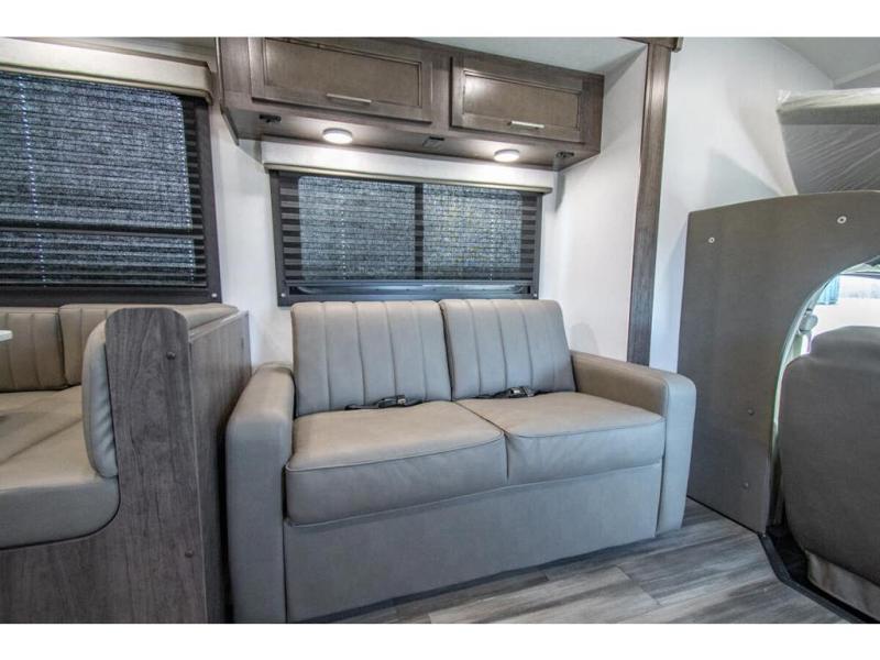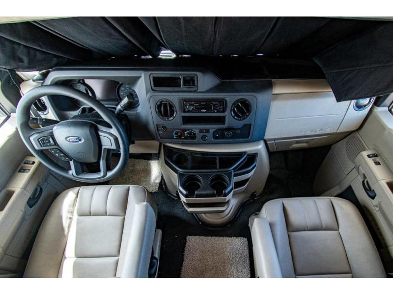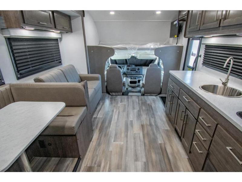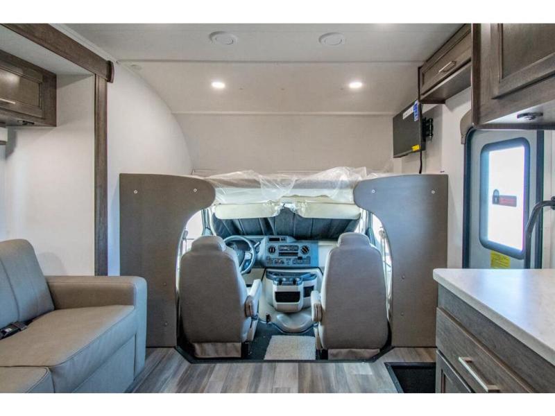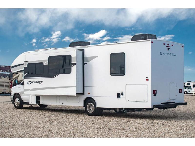 The Odyssey SE Class C gas motorhome by Entegra Coach is constructed with TuffShell vacuum-bond laminated sidewalls, a one-piece, seamless fiberglass front cap, and bead-foam insulation for added durability and strength. Whether you choose a model with a Ford E-350 chassis, Ford E-450 or Chevy 4500 chassis, you will get a durable coach made to last. The driver will also love the power steering, tilt steering wheel, and auxiliary start switch. The 7' interior ceiling height will provide plenty of space to stretch out and the high-intensity, recessed LED lights will make your space feel more like home. All of your power needs will be met with a 4,000-watt generator and 12V house battery, plus there is a 13.5K BTU A/C and 30K BTU furnace to keep you comfortable all year long. There are a couple additions you might want to add to further customize your Odyssey SE, like the optional automatic hydraulic leveling jacks and the optional 200W solar panel for some off-grid camping!