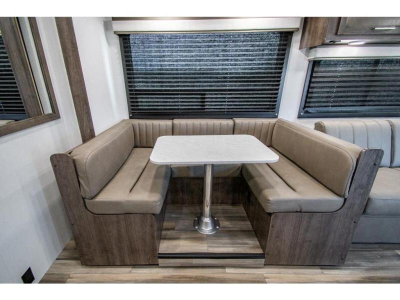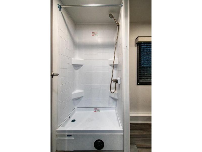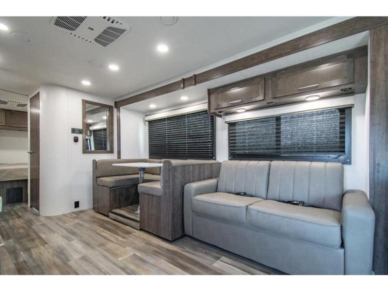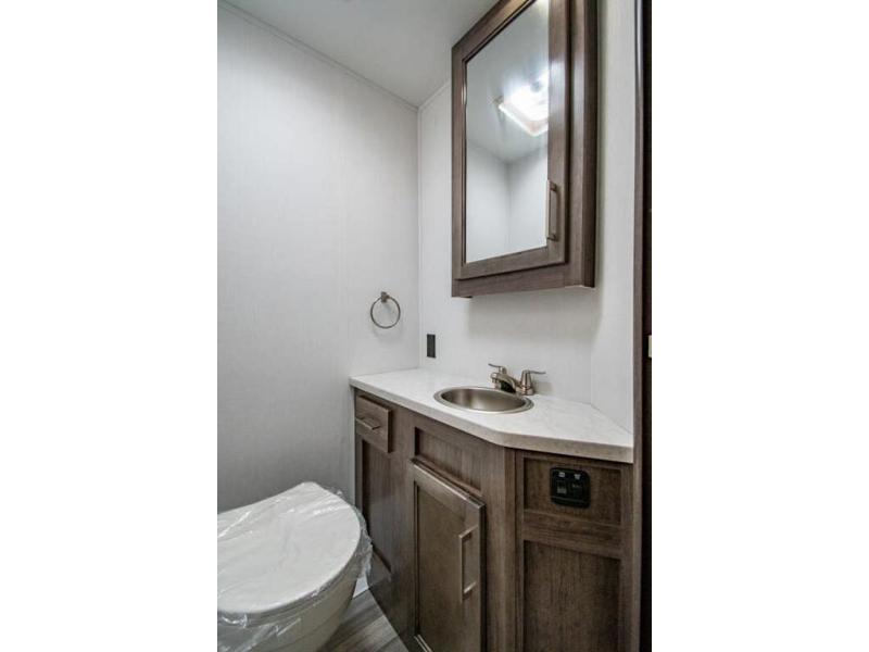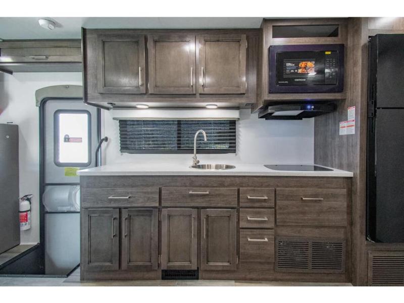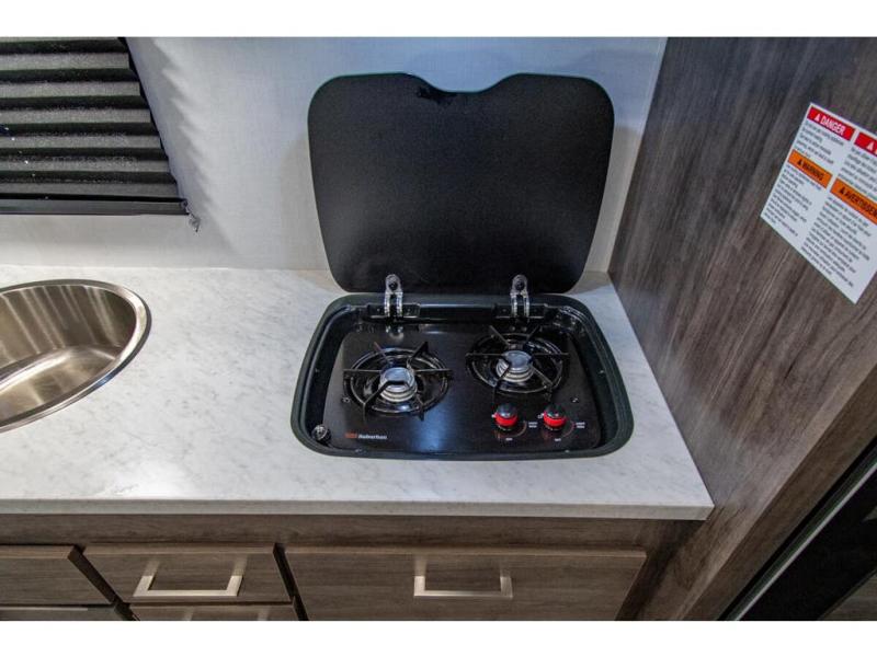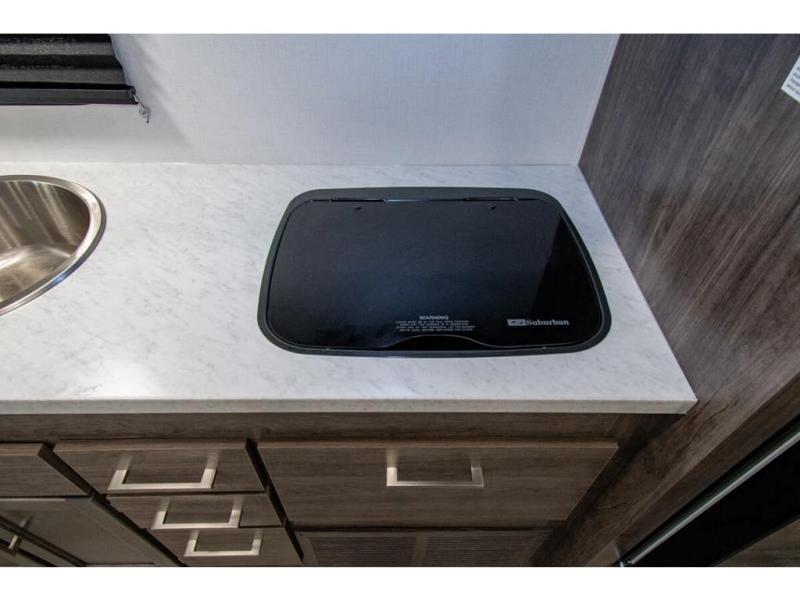 Travel in style in this spacious coach for seven to eight! Once you park at the campsite, you can start lunch on two-burner cooktop or in the convection microwave oven. There is a U-shaped dinette, jack-knife sofa, and cab-over bunk for dining, seating, and sleeping space. You'll find your own space in the rear bedroom with an RV queen bed, large wardrobe, and a privacy curtain. The 24" x 36" independent shower is right across from the private toilet and sink, allowing two people to use this space at once!