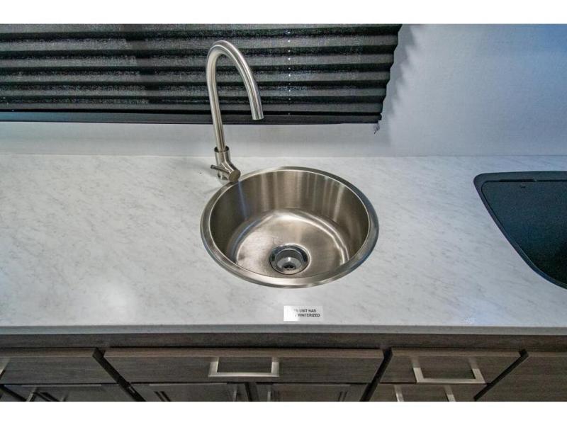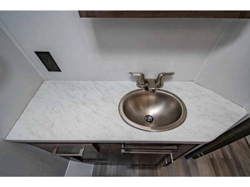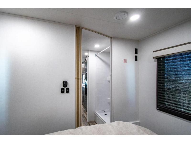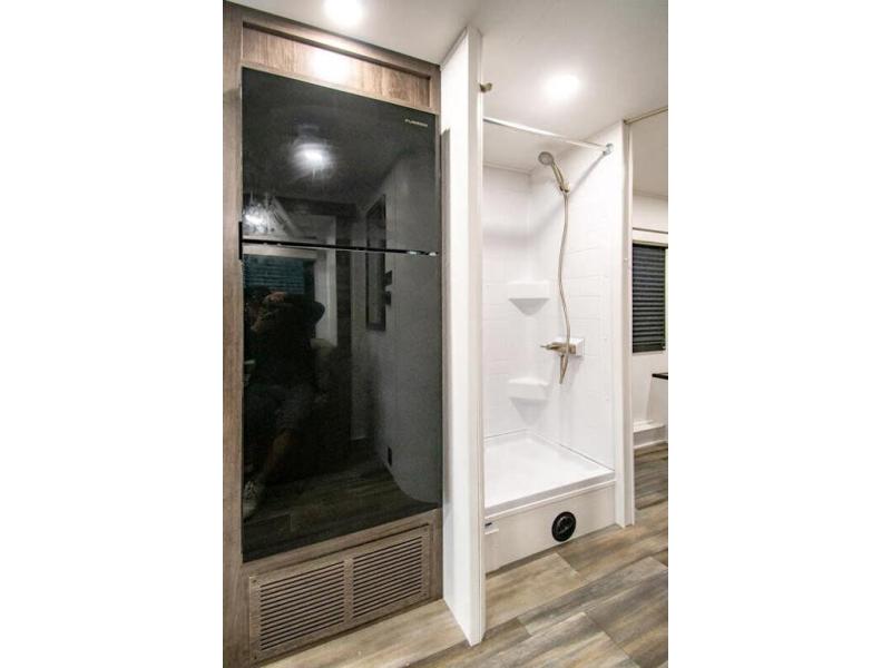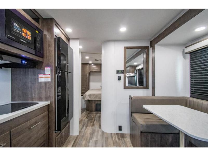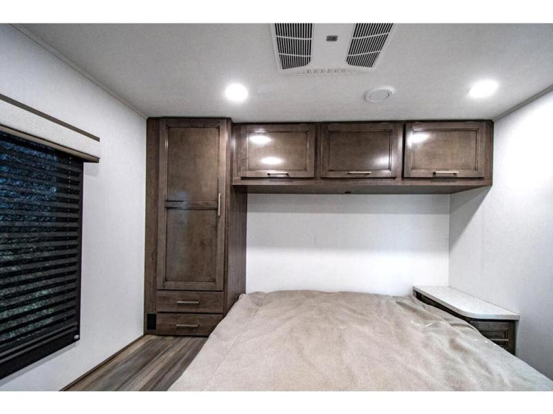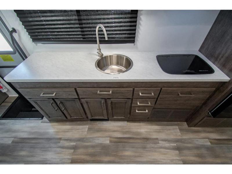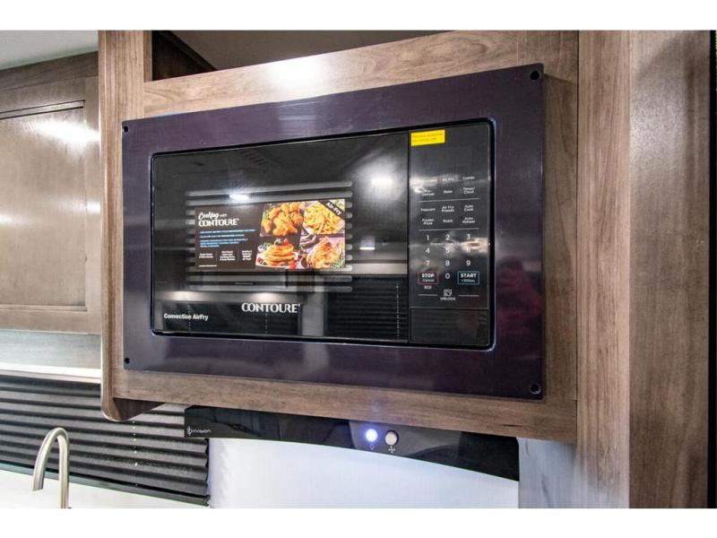 Travel in style in this spacious coach for seven to eight! Once you park at the campsite, you can start lunch on two-burner cooktop or in the convection microwave oven. There is a U-shaped dinette, jack-knife sofa, and cab-over bunk for dining, seating, and sleeping space. You'll find your own space in the rear bedroom with an RV queen bed, large wardrobe, and a privacy curtain. The 24" x 36" independent shower is right across from the private toilet and sink, allowing two people to use this space at once!