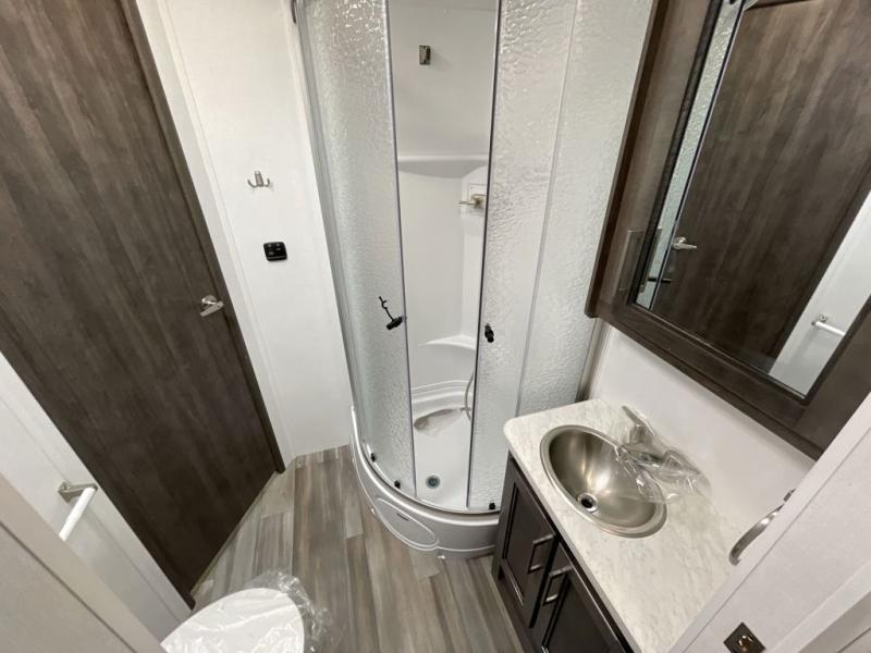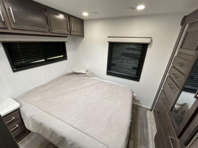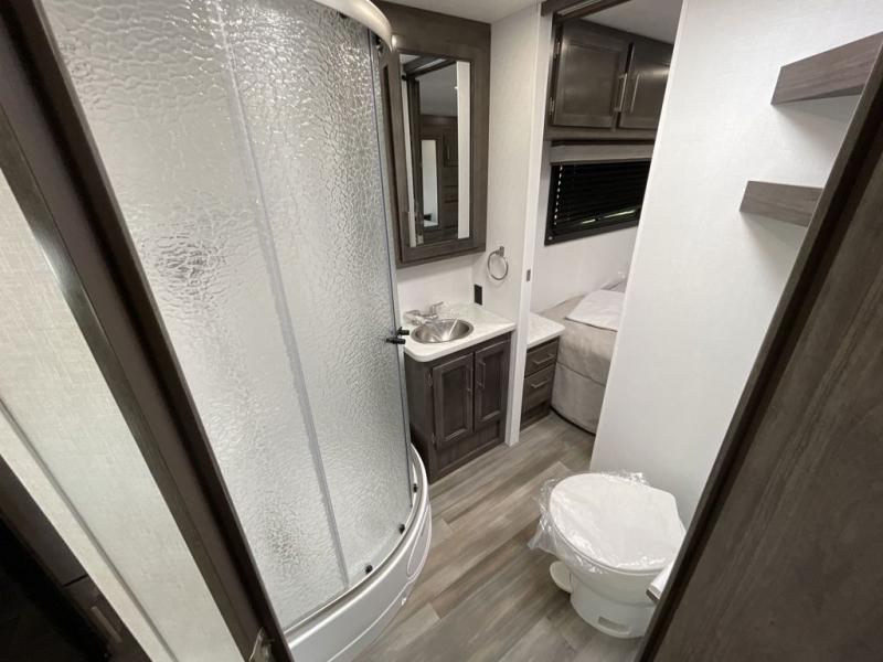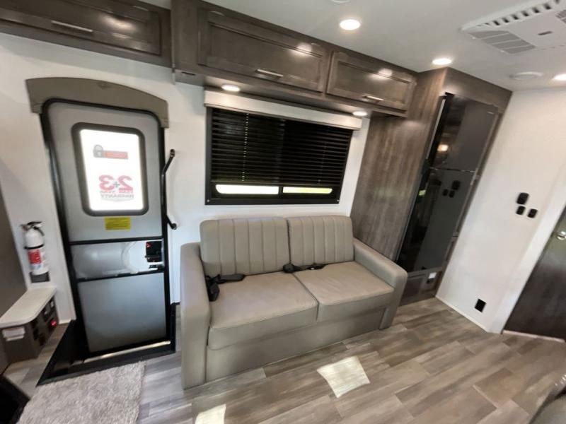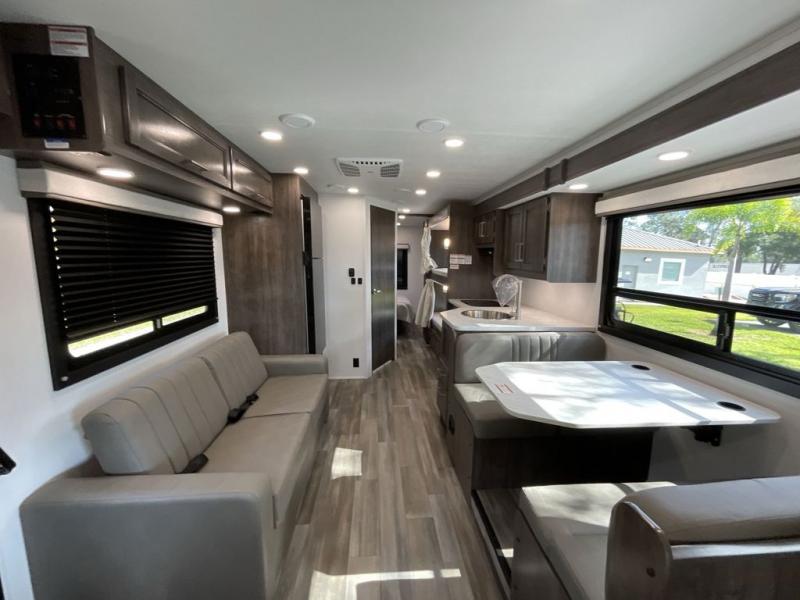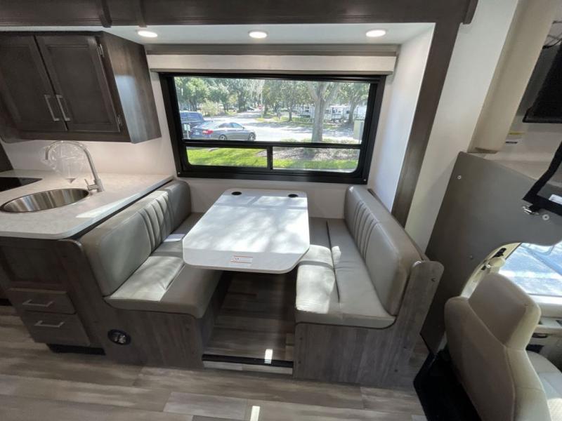 The whole family will love traveling in this motorhome! The kiddos will get a good night's rest on the set of 28" x 72" bunk beds, and you will get a good night's rest on the 60" x 74" queen bed in the rear private bedroom. You even have access to the dual entry bathroom which has a 32" radius shower to freshen up in each morning. Head to the kitchen where you can prepare your best home cooked meals on the two-burner cooktop, keep your perishables fresh in the 10-cu. ft. refrigerator, and enjoy your delicious meals at the 42" x 70" booth dinette. Relax on the 68" jack-knife sofa after a fun day at the beach, and also turn it into an extra sleeping space, plus there is a cab over bunk for a friend or two to tag along!