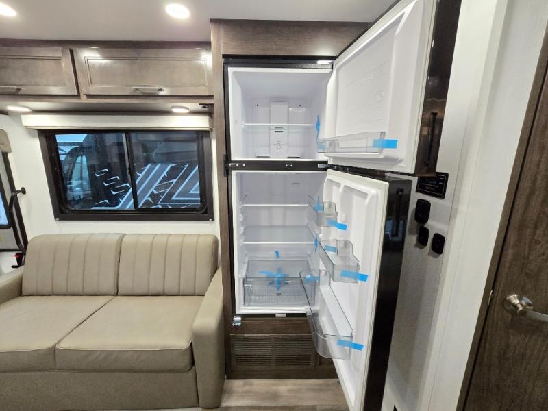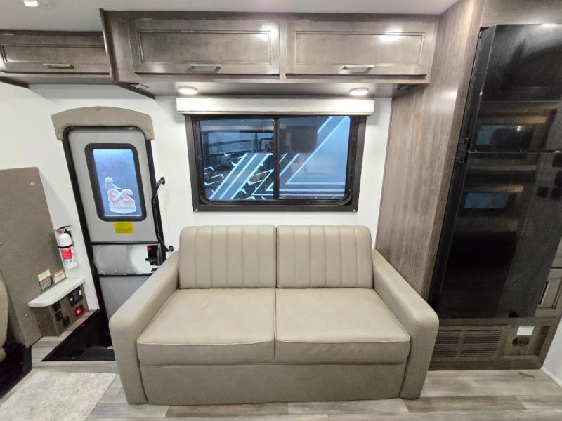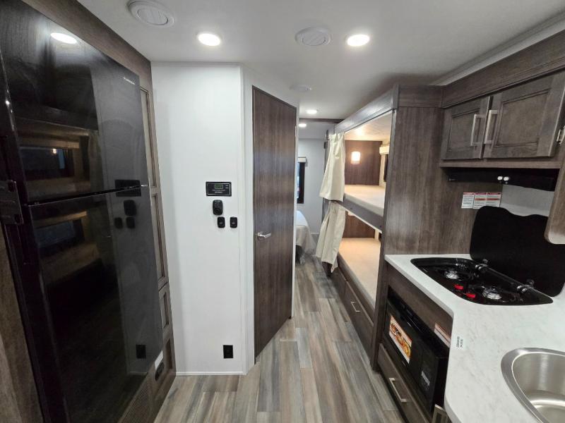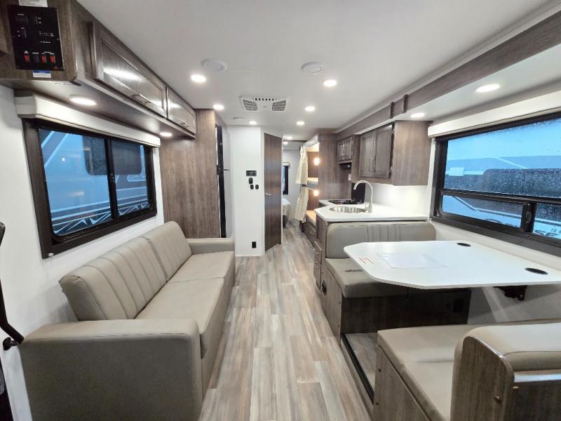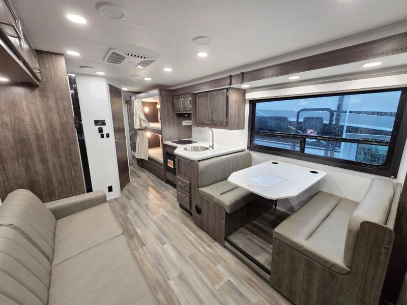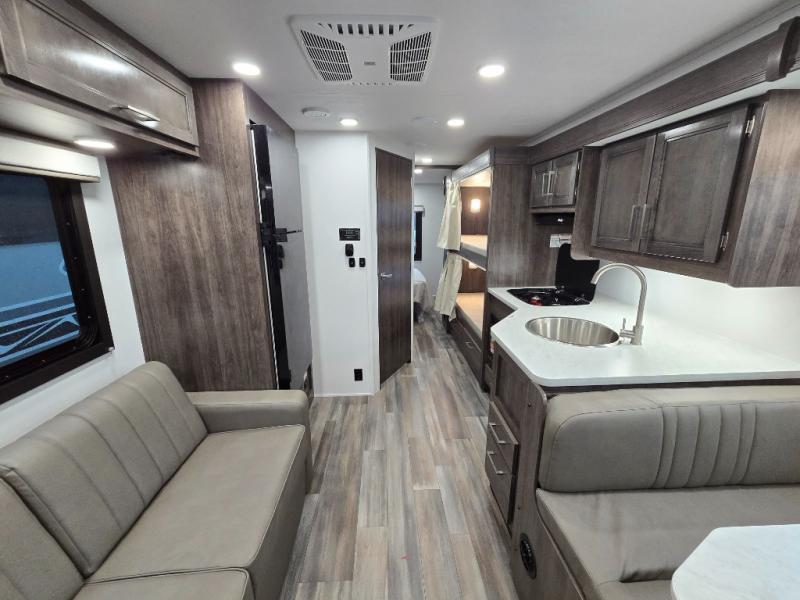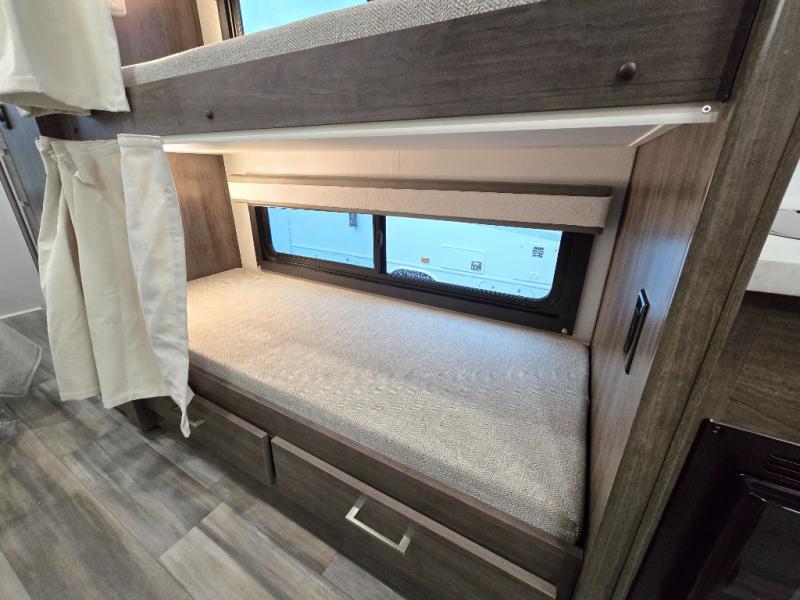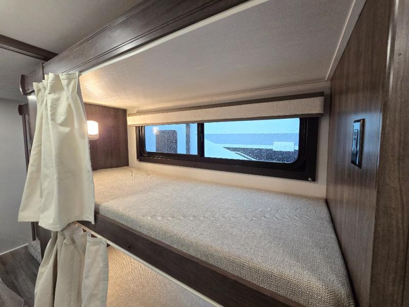The whole family will love traveling in this motorhome! The kiddos will get a good night's rest on the set of 28" x 72" bunk beds, and you will get a good night's rest on the 60" x 74" queen bed in the rear private bedroom. You even have access to the dual entry bathroom which has a 32" radius shower to freshen up in each morning. Head to the kitchen where you can prepare your best home cooked meals on the two-burner cooktop, keep your perishables fresh in the 10-cu. ft. refrigerator, and enjoy your delicious meals at the 42" x 70" booth dinette. Relax on the 68" jack-knife sofa after a fun day at the beach, and also turn it into an extra sleeping space, plus there is a cab over bunk for a friend or two to tag along!