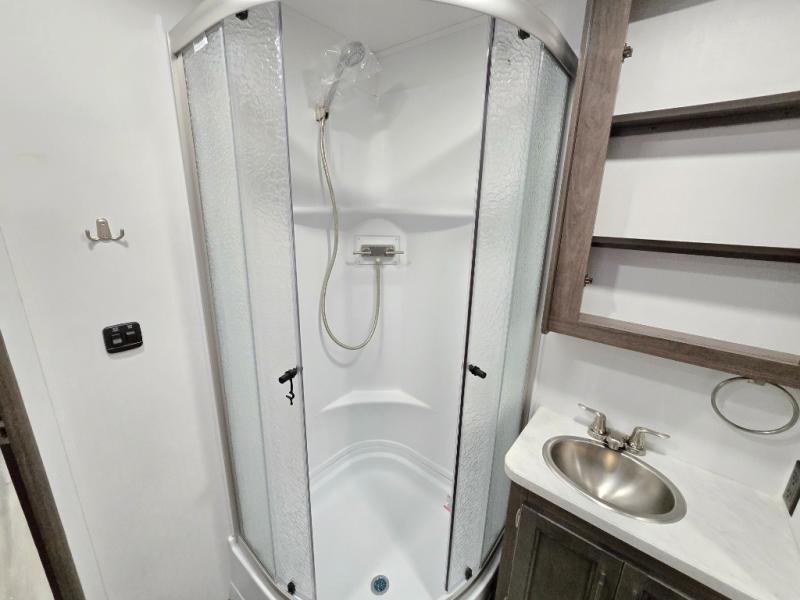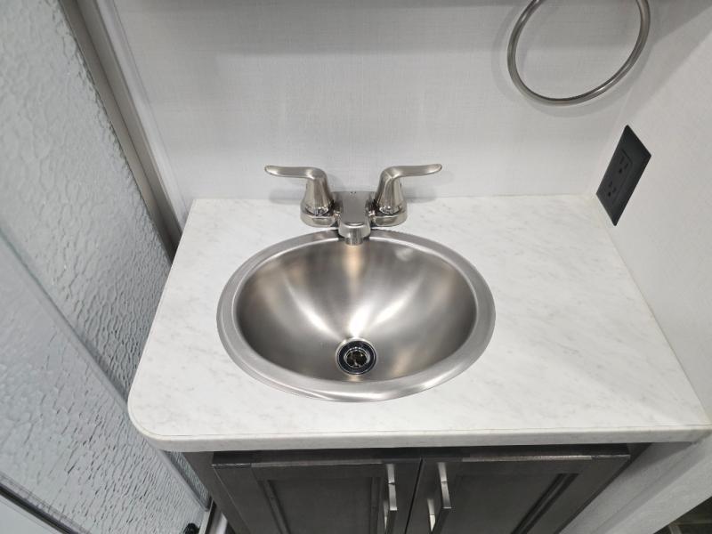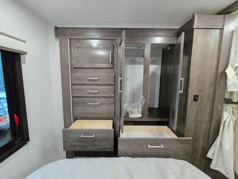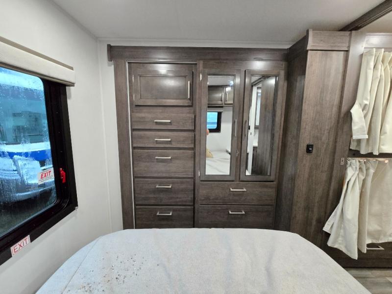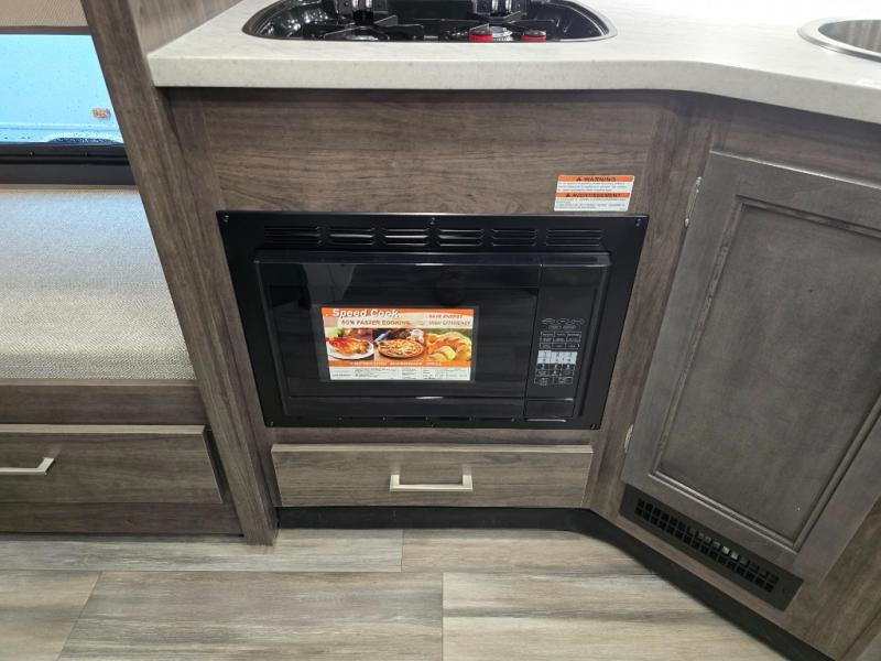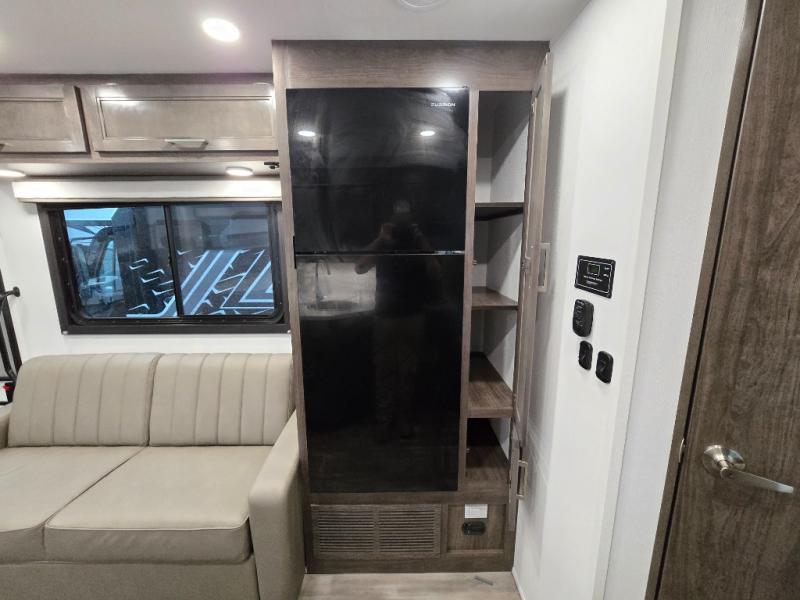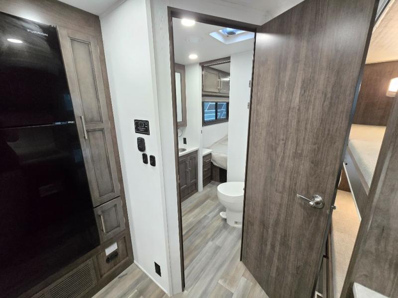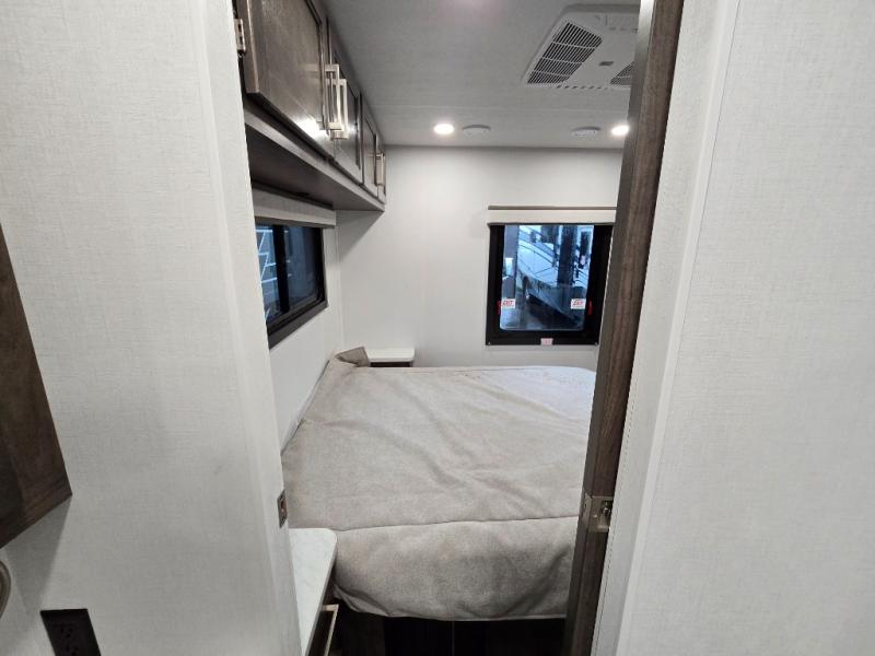 The whole family will love traveling in this motorhome! The kiddos will get a good night's rest on the set of 28" x 72" bunk beds, and you will get a good night's rest on the 60" x 74" queen bed in the rear private bedroom. You even have access to the dual entry bathroom which has a 32" radius shower to freshen up in each morning. Head to the kitchen where you can prepare your best home cooked meals on the two-burner cooktop, keep your perishables fresh in the 10-cu. ft. refrigerator, and enjoy your delicious meals at the 42" x 70" booth dinette. Relax on the 68" jack-knife sofa after a fun day at the beach, and also turn it into an extra sleeping space, plus there is a cab over bunk for a friend or two to tag along!