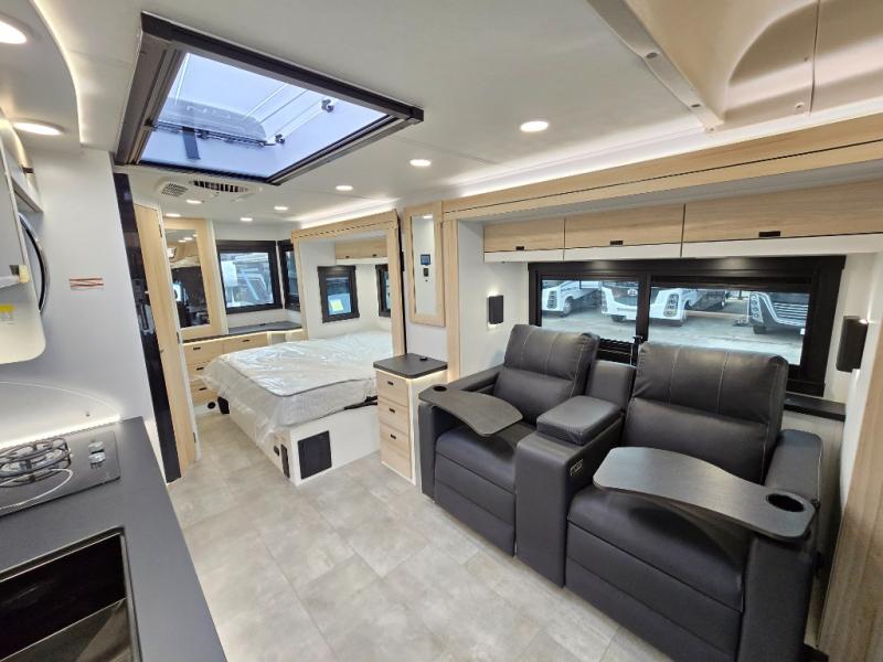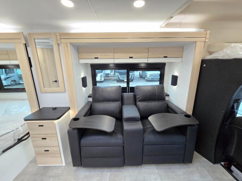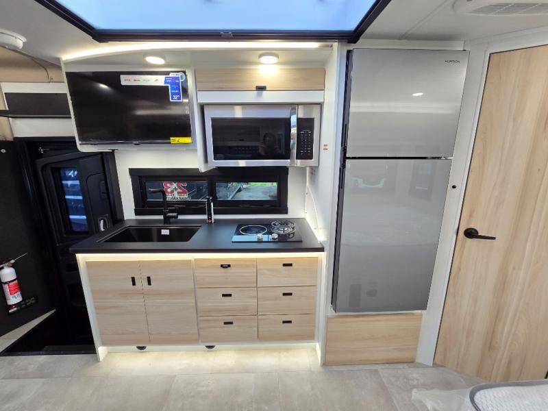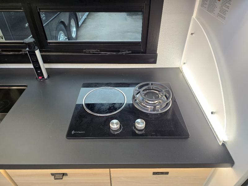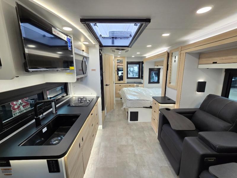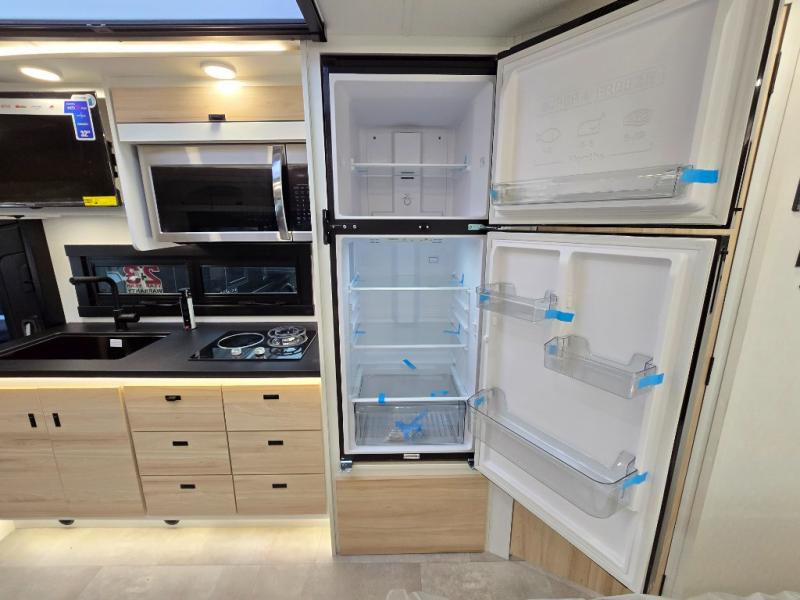You will love every minute spent in this spacious coach for four campers. The front cab-over bunk provides a place for guests to sleep, or you can choose the B+ front cap option with storage. A fully equipped kitchen includes a drop-in cooktop with one LP burner and one induction burner, a convection microwave, plus a 10-cu. ft. 12V refrigerator and pantry for food storage. The booth dinette slide will give you a place to dine together, and this can double as sleeping space for guests as well. You'll find your own bed in the rear corner bedroom with a king bed slide out, wardrobe and drawers, plus a full bath in the rear corner to easily get ready each day.