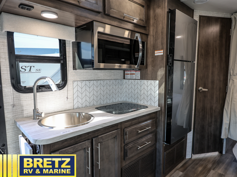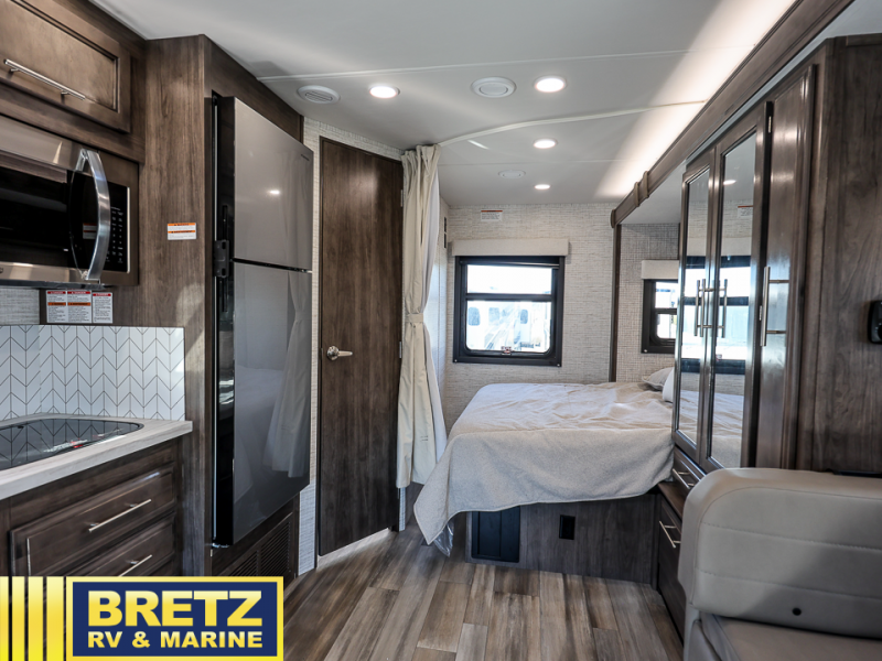 Pack your bags and head to your favorite camping destination in this cozy coach! You can sleep four to six between the RV queen bed, U-shaped dinette, and overhead bunk with a 750 lb. capacity. And if you don't need the extra sleeping space, just choose the entertainment center with overhead storage option in place of the bunk, and the theater seating option in place of the dinette! You can prepare meals each day on the two burner drop-in cooktop or in the convection microwave, and there is a 10 cu. ft. 12V refrigerator for perishables. A full bath, complete with a foot flush toilet, powered roof vent, and shower skylight will let you stay clean throughout each trip. You will also find plenty of storage space, including a wardrobe by the bed, a pantry, plus overhead cabinets!