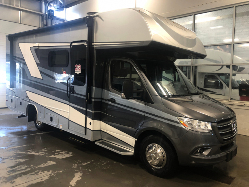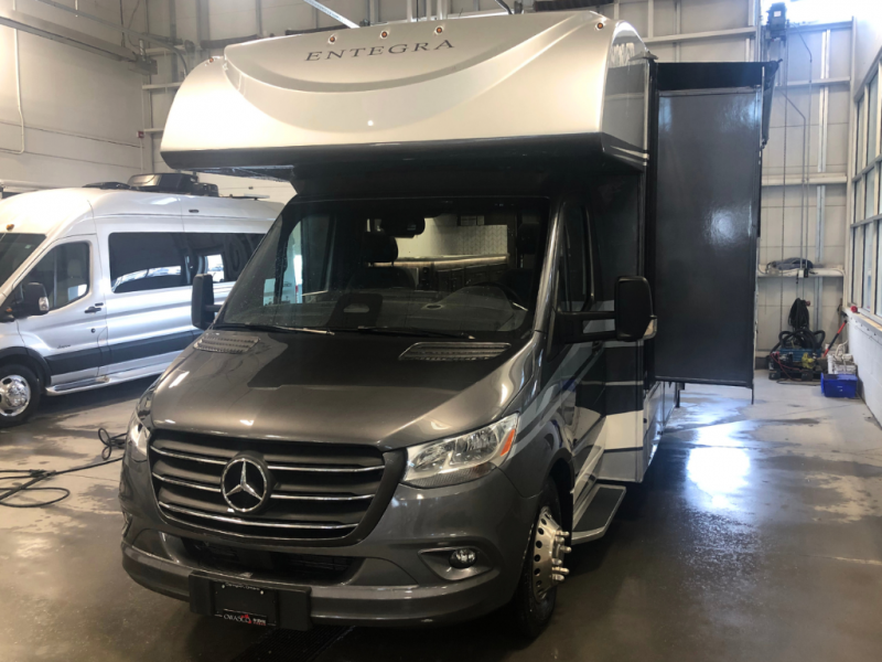 With any Qwest SE Class C diesel motorhome by Entegra Coach, you will enjoy a safe and enjoyable trip each time you take to the road! Each model sits on a durable Mercedes-Benz 3500 chassis with a 170 in. wheelbase and a 9-speed automatic transmission for an overall better driving experience. There is a one-piece, seamless fiberglass front cap to combat leaks, and the TuffShell construction will hold up over time. The driver will appreciate the 10.25" integrated Mercedes-Benz MBUX infotainment center that Apple CarPlay and Android Auto so they can navigate the road like a pro, plus there are backup and side-view cameras for easy parking. You will also appreciate an exterior utility center, an outside shower, electric stabilizer jacks, and many more exterior conveniences. Head inside to find LED-lit pressed countertops, decorative kitchen backsplash, pleated blackout shades for added privacy, and high-intensity LED ceiling lights to keep your space bright and open.