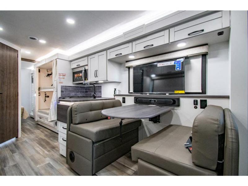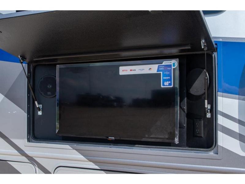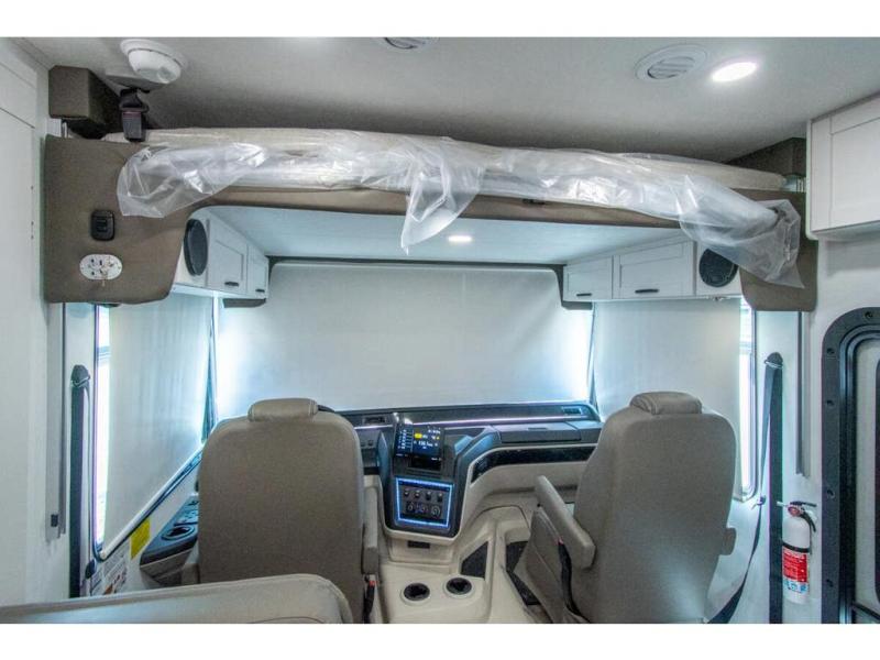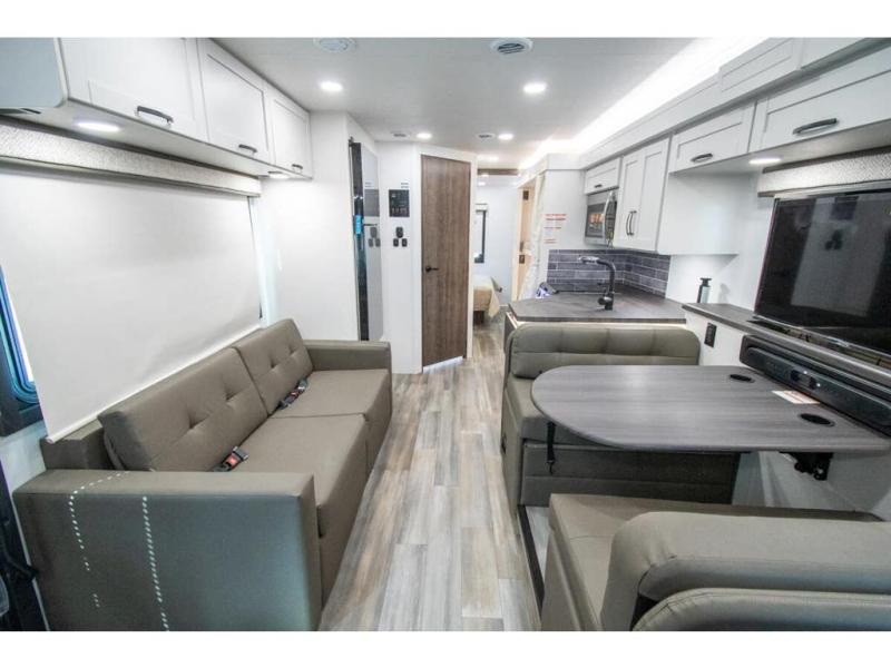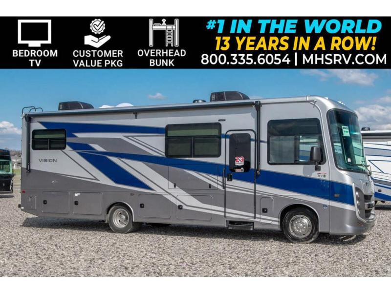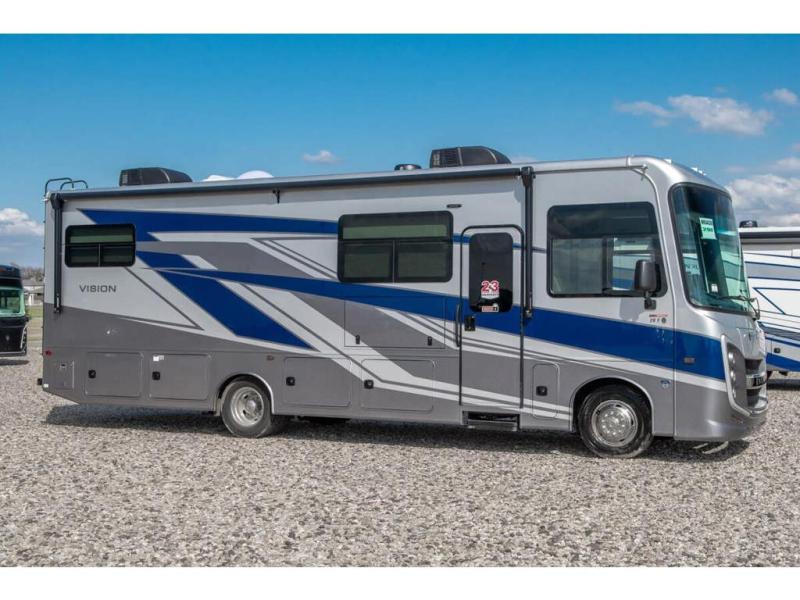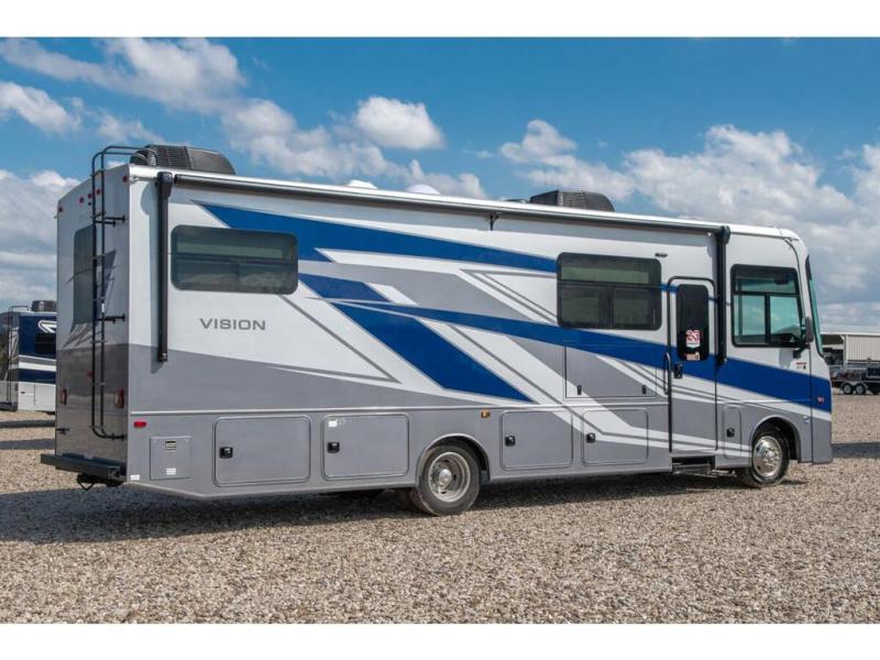 Enjoy a full weekend of excellent amenities in this Vision Class A gas motorhome! There is enough sleeping space for the whole crew with a set of 28" x 70" bunk beds, an RV queen bed, booth dinette, and 68" jack-knife sofa. If you're needing more sleeping space, just add the optional drop-down bunk above the cab! The dual-entry bathroom can be accessed from the main living area as well as the rear bedroom which adds more convenience. There is a Sony infotainment center with Apple CarPlay and Android Auto in the cockpit to help you as you drive, and you'll also find the backup and sideview cameras to be useful when you're parking. A 23' electric awning will protect you while you're outside, and the exterior LED HDTV will be perfect for movies outdoors!