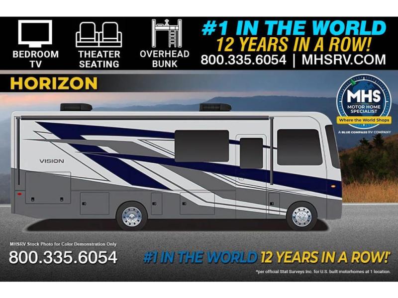 This Vision Class A gas motorhome has excellent interior living space with a full-wall slide! You'll fully enjoy the kitchen and the amenities it provides, like a residential-size microwave, a 10 cu. ft. 12V refrigerator, a Furrion all-in-one cooktop and oven, and a pantry. The 68" jack-knife sofa and booth dinette offer you lounging space after a full day of traveling, and the 39" LED HD Smart TV offers you some entertainment when you don't want to be active anymore. The exterior portion of this coach is also excellently appointed with an outdoor kitchen, exterior entertainment center with LED HD Smart TV, radio, and speakers, and a 23' electric awning with LED lights. You also have great choices of options for this coach with the optional theater seating, LED HDTV in the bedroom, or drop-down overhead cab bunk.