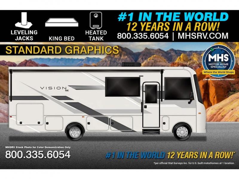 When you choose the Vision SE Class A gas motorhome by Entegra Coach, you're choosing an affordable coach packed with amenities! The Ford F53 chassis is ultra durable and the 7.3L V8 engine with 335HP will power your many adventures. There is an E-Z Drive system with a computer-balanced driveshaft, heavy-duty stabilizer bars, and more to provide you with a smooth drive, plus there is a 120 in. panoramic windshield for outstanding views as you travel. You can enjoy your coach for years to come thanks to the construction that features bead-foam insulation, a one-piece seamless crowned fiberglass roof, plus TuffShell vacuum-bond laminated sidewalls and floor. The interior will have you feeling right at home with hardwood cabinet doors and drawer fronts, a 7' ceiling height, decorative kitchen backsplash, plus a shower with decorative surround, glass door and skylight.