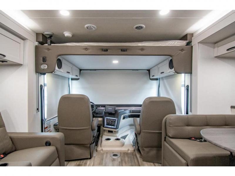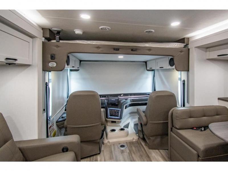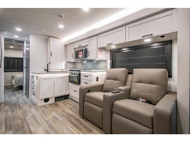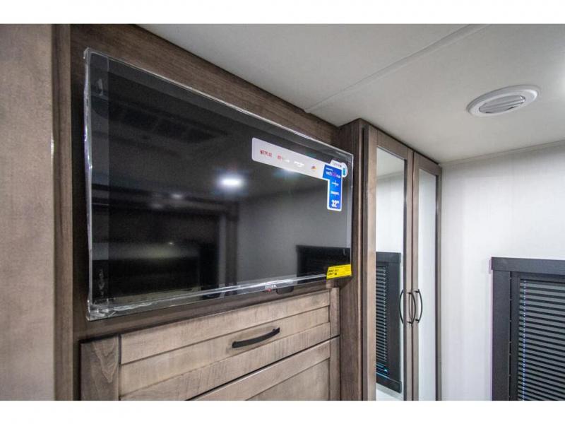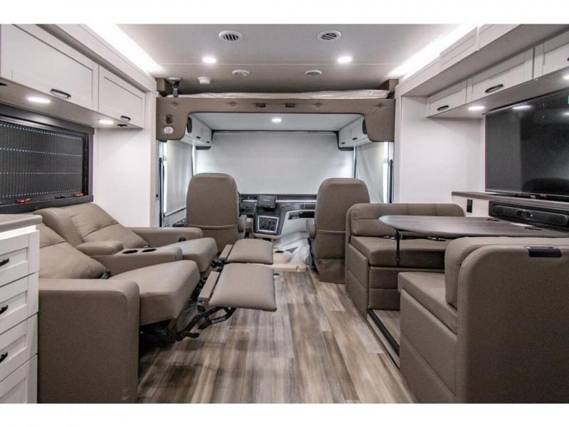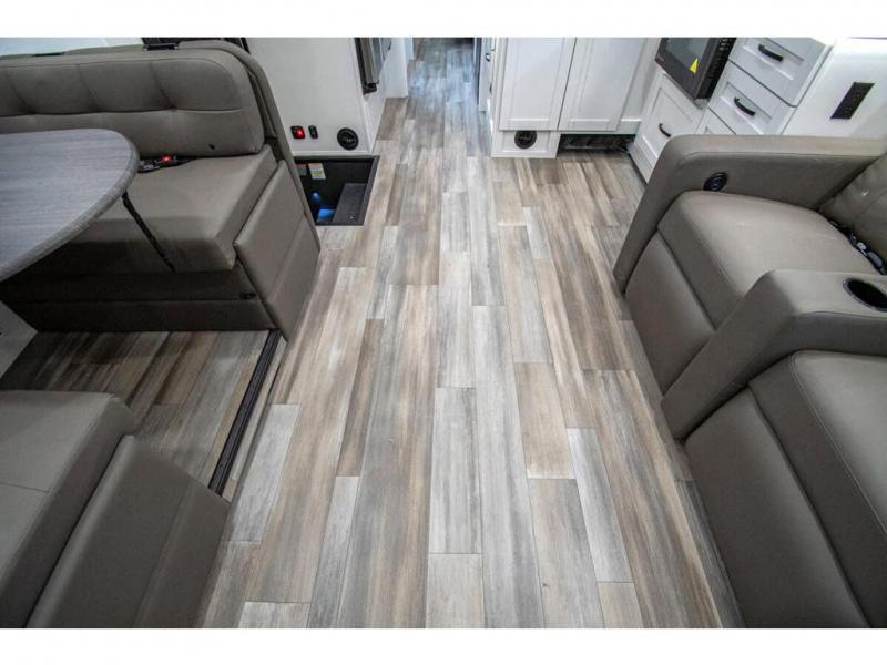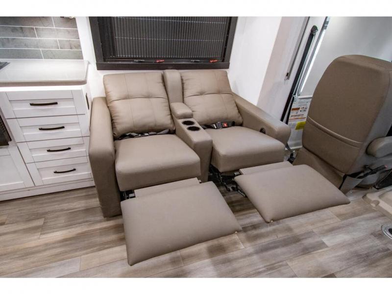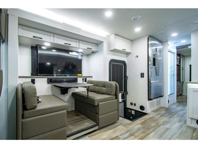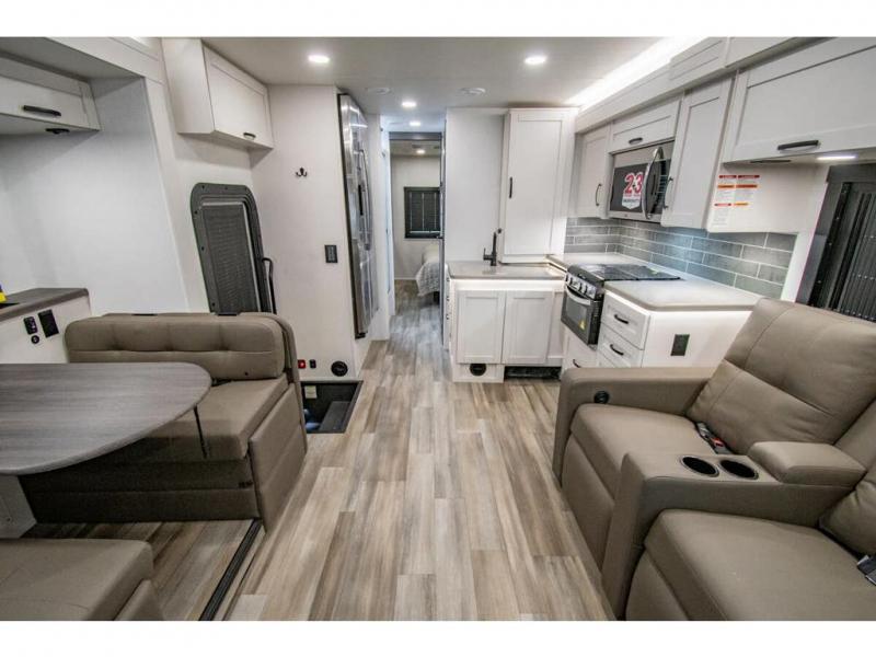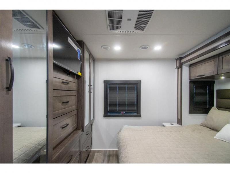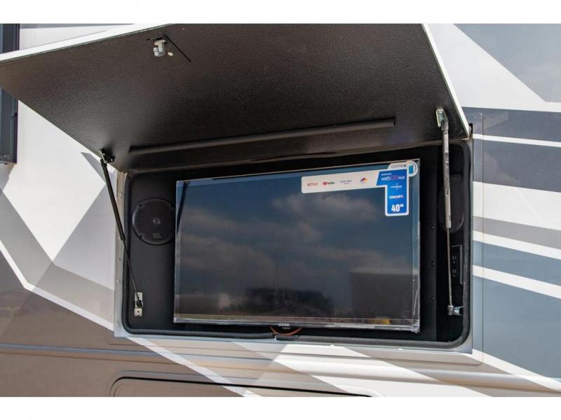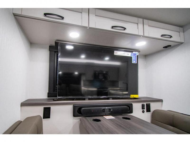 This motorhome has everything you need for a relaxing getaway! Go out alone, or invite a few extra travelers to join you and crash on the 60" tri-fold sofa or 38" x 70" booth dinette. You can even add some more sleeping space for friends or kids by choosing the drop-down overhead bunk option. It will be a piece of cake to enjoy a piece of cake thanks to the Furrion all-in-one cooktop and oven, the residential refrigerator, and the residential microwave will give you everything you need to prepare a batter and bake it. You'll also be able to stay entertained throughout each trip by using the 50" LED HD Smart TV in the living area, the LED HD Smart TV in the bedroom, and the exterior LED HD Smart TV at the outside entertainment center. Everyone can stay squeaky clean with the separated bathroom that has a 30" x 36" shower on one side and a private toilet and sink on the other side!