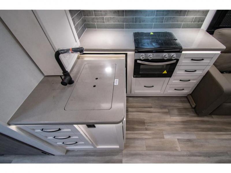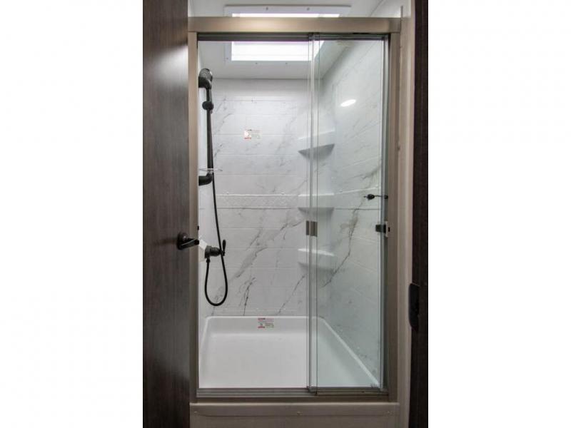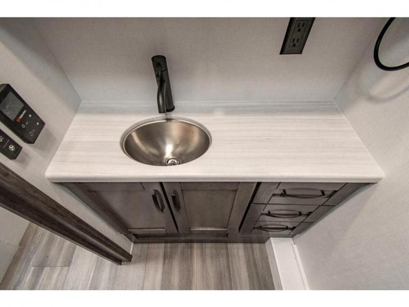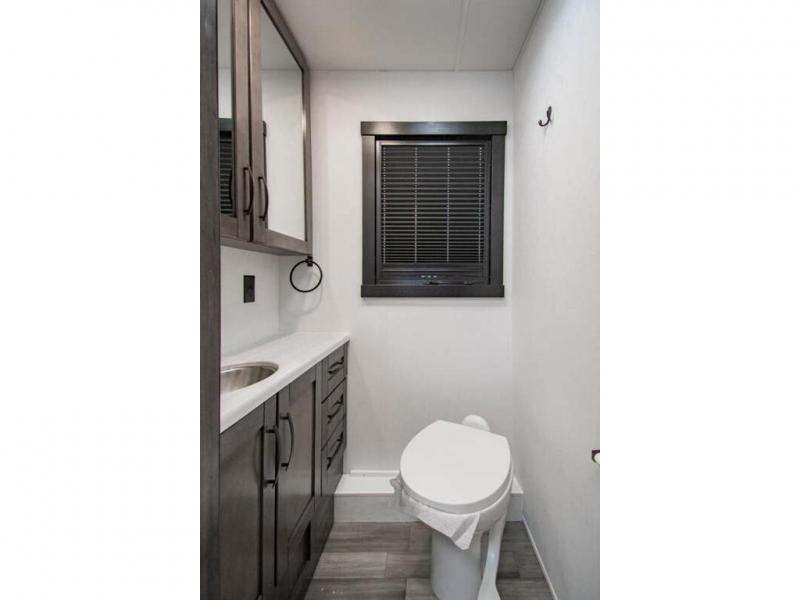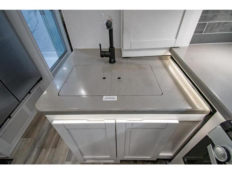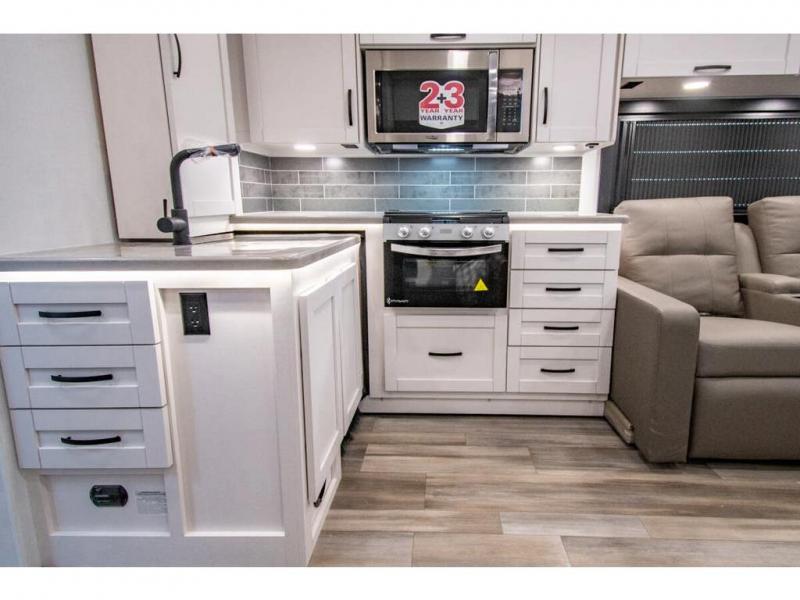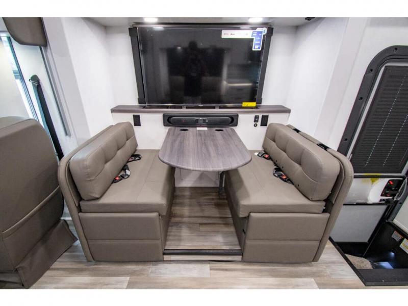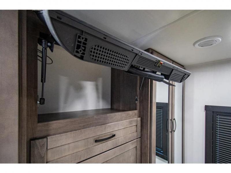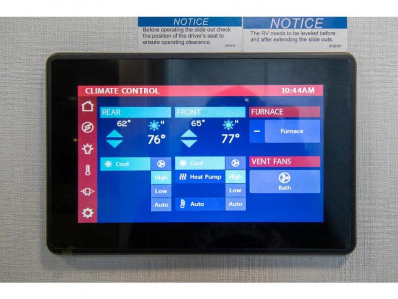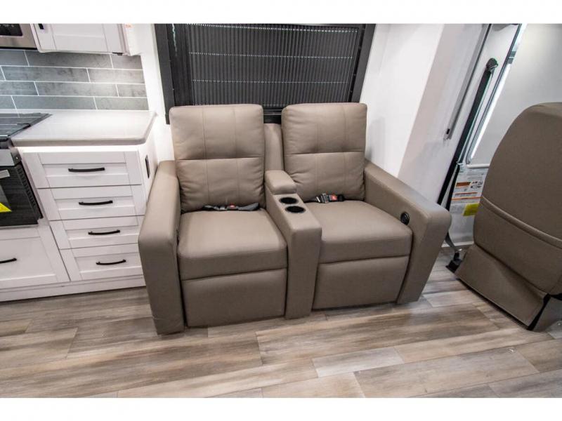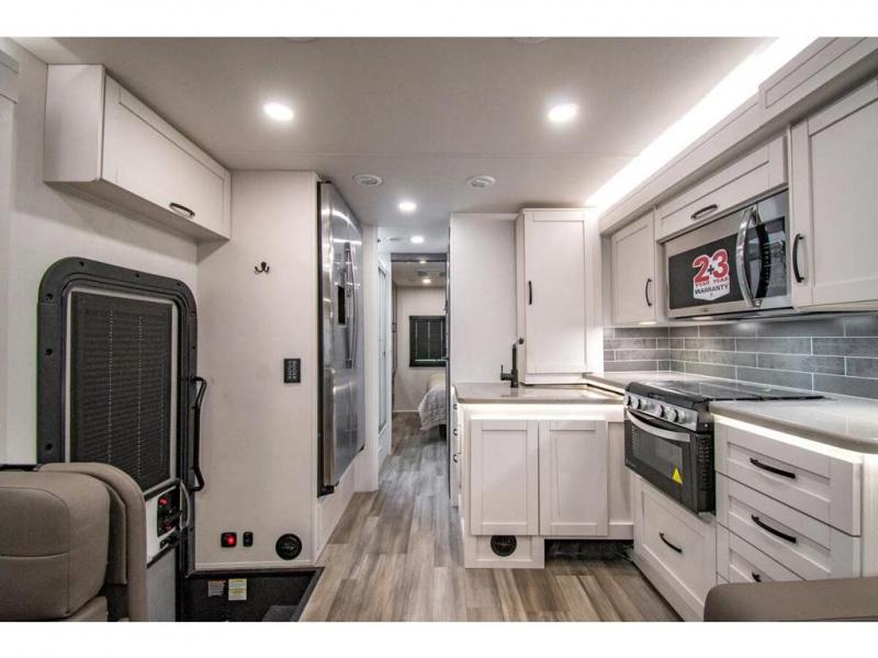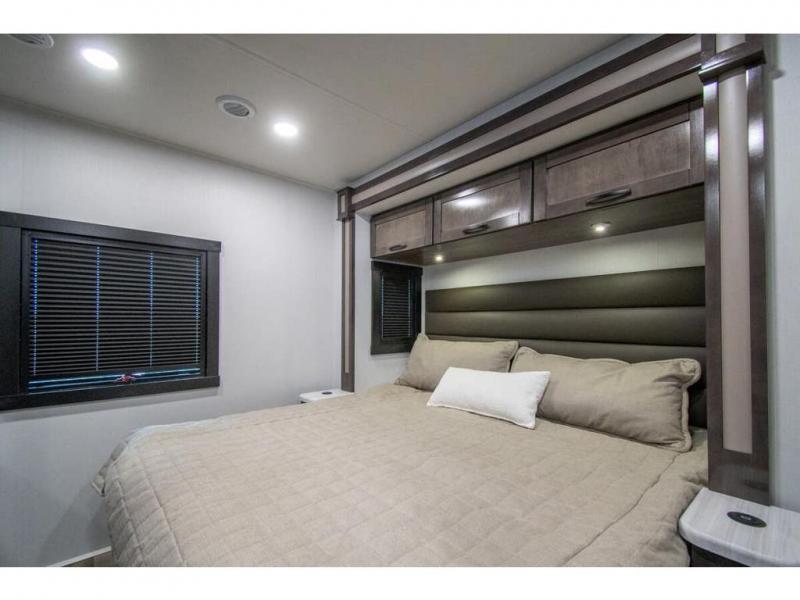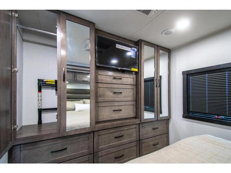 This motorhome has everything you need for a relaxing getaway! Go out alone, or invite a few extra travelers to join you and crash on the 60" tri-fold sofa or 38" x 70" booth dinette. You can even add some more sleeping space for friends or kids by choosing the drop-down overhead bunk option. It will be a piece of cake to enjoy a piece of cake thanks to the Furrion all-in-one cooktop and oven, the residential refrigerator, and the residential microwave will give you everything you need to prepare a batter and bake it. You'll also be able to stay entertained throughout each trip by using the 50" LED HD Smart TV in the living area, the LED HD Smart TV in the bedroom, and the exterior LED HD Smart TV at the outside entertainment center. Everyone can stay squeaky clean with the separated bathroom that has a 30" x 36" shower on one side and a private toilet and sink on the other side!