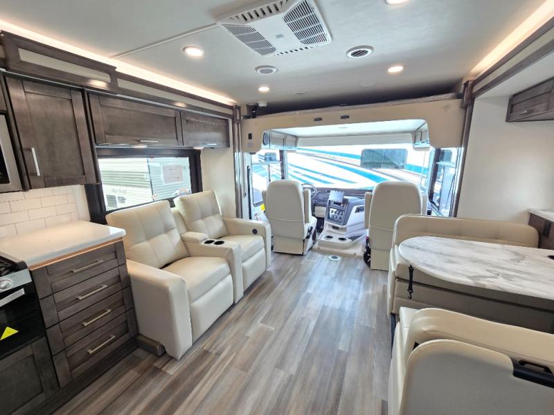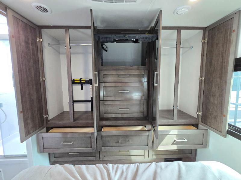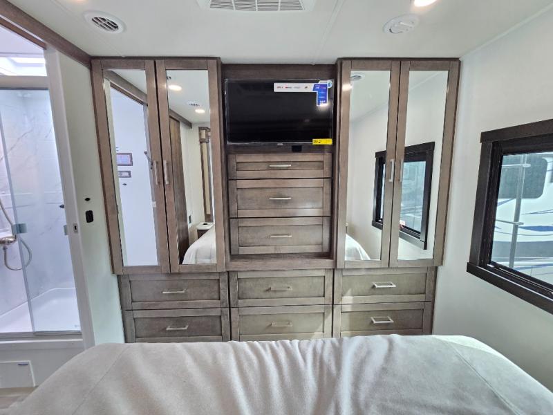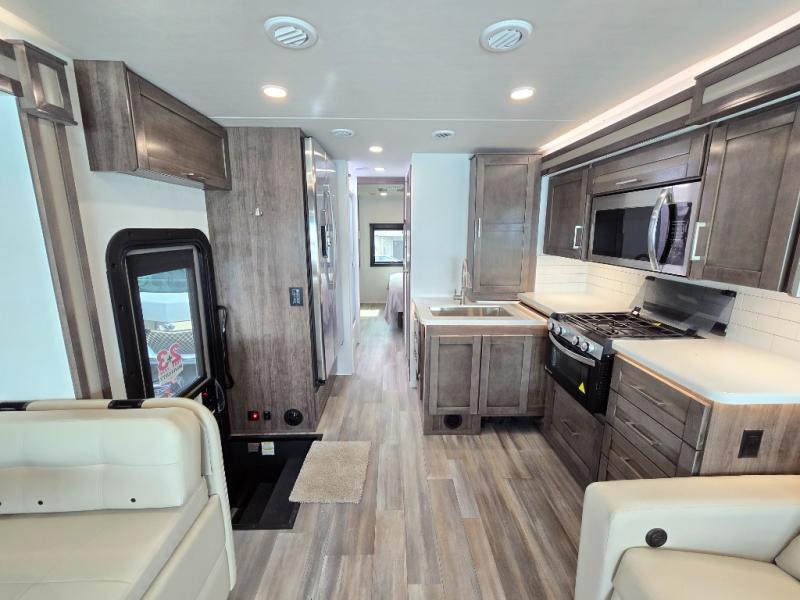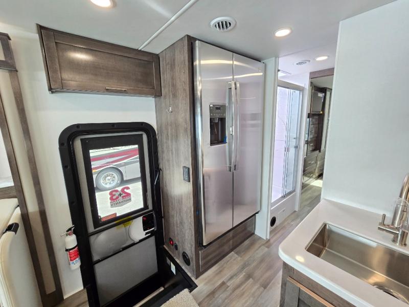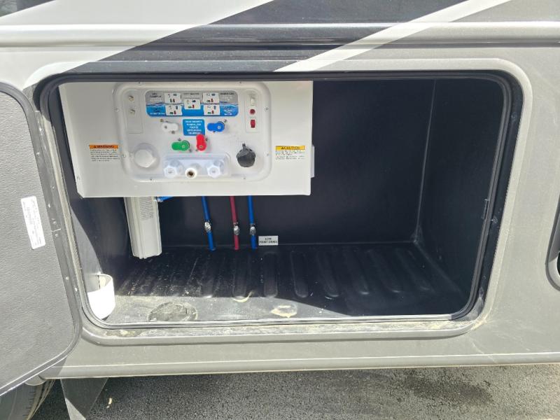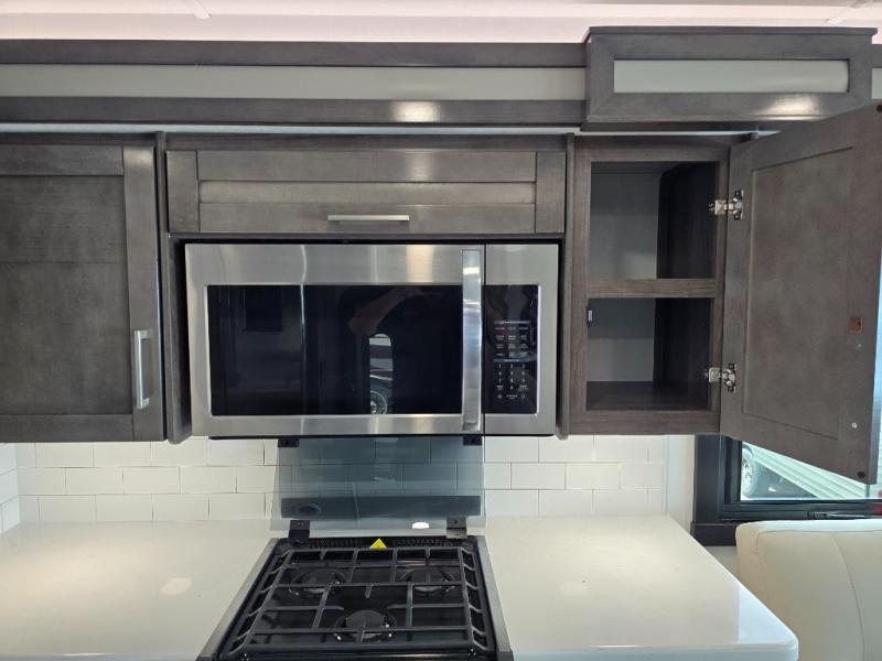 This motorhome has everything you need for a relaxing getaway! Go out alone, or invite a few extra travelers to join you and crash on the 60" tri-fold sofa or 38" x 70" booth dinette. You can even add some more sleeping space for friends or kids by choosing the drop-down overhead bunk option. It will be a piece of cake to enjoy a piece of cake thanks to the Furrion all-in-one cooktop and oven, the residential refrigerator, and the residential microwave will give you everything you need to prepare a batter and bake it. You'll also be able to stay entertained throughout each trip by using the 50" LED HD Smart TV in the living area, the LED HD Smart TV in the bedroom, and the exterior LED HD Smart TV at the outside entertainment center. Everyone can stay squeaky clean with the separated bathroom that has a 30" x 36" shower on one side and a private toilet and sink on the other side!