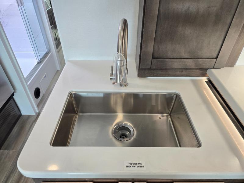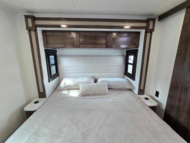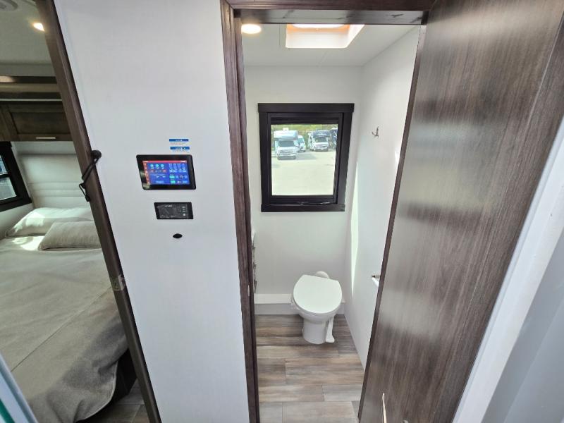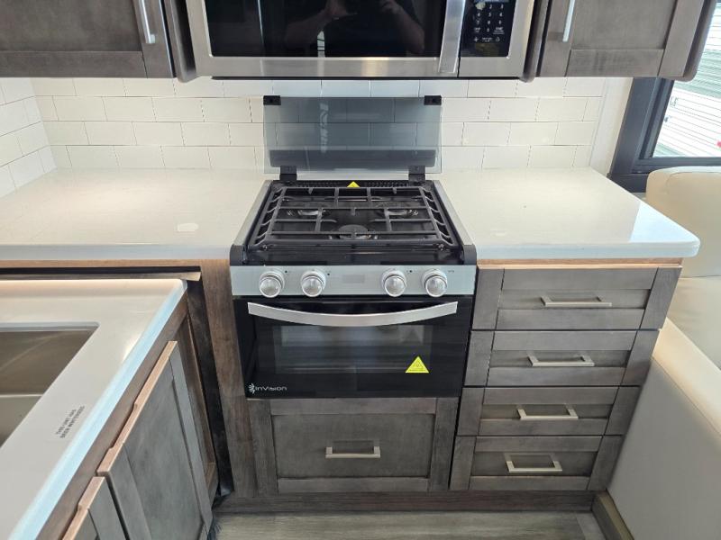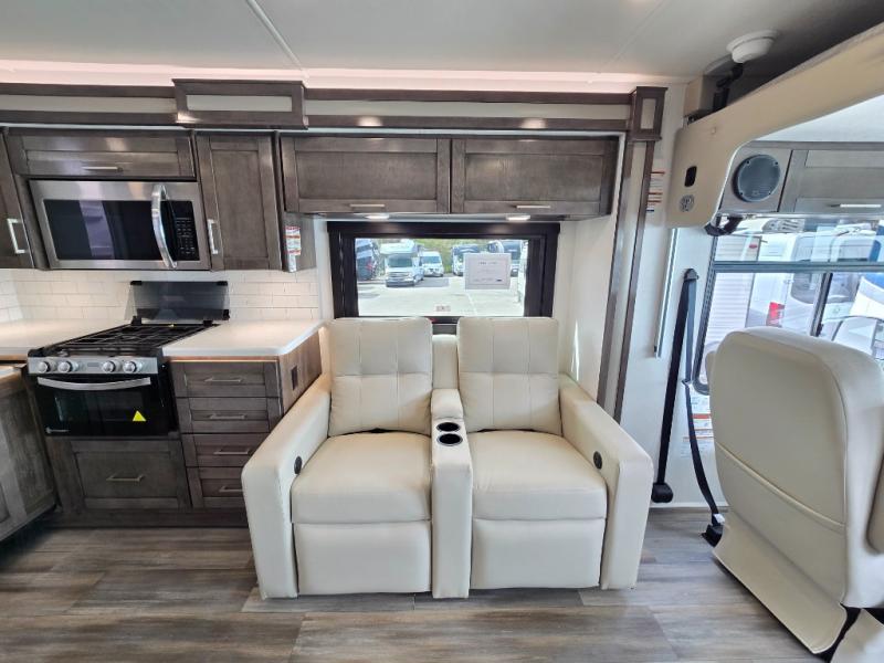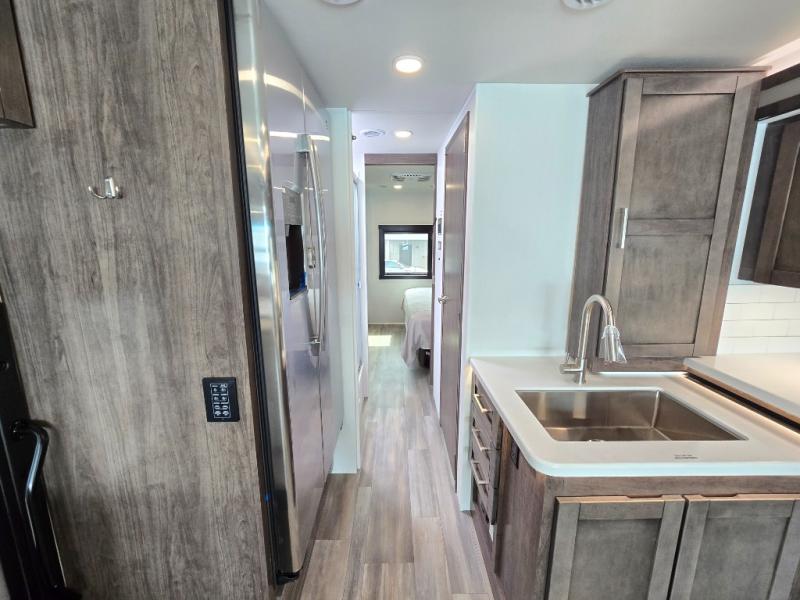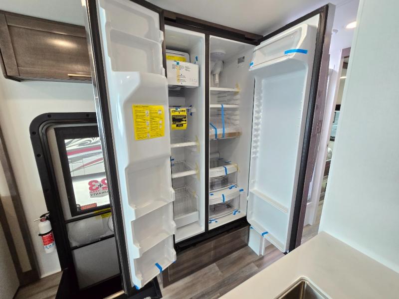 This motorhome has everything you need for a relaxing getaway! Go out alone, or invite a few extra travelers to join you and crash on the 60" tri-fold sofa or 38" x 70" booth dinette. You can even add some more sleeping space for friends or kids by choosing the drop-down overhead bunk option. It will be a piece of cake to enjoy a piece of cake thanks to the Furrion all-in-one cooktop and oven, the residential refrigerator, and the residential microwave will give you everything you need to prepare a batter and bake it. You'll also be able to stay entertained throughout each trip by using the 50" LED HD Smart TV in the living area, the LED HD Smart TV in the bedroom, and the exterior LED HD Smart TV at the outside entertainment center. Everyone can stay squeaky clean with the separated bathroom that has a 30" x 36" shower on one side and a private toilet and sink on the other side!