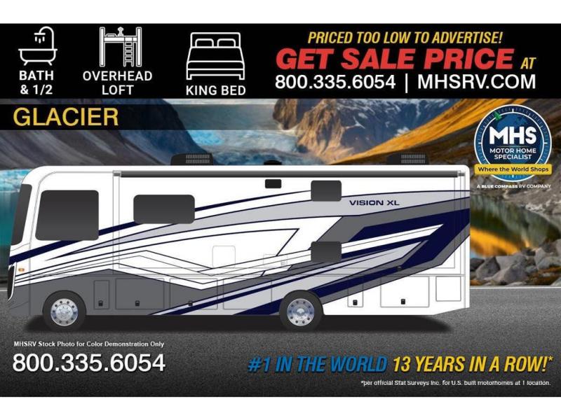 Picture yourself sitting in one of the swivel cab seats with your favorite beverage resting on the removable cockpit table in this Vision XL Class A gas motorhome! When you enter this coach, you will be greeted with a warm and comfortable living environment that has a theater sofa, hide-a-bed sofa, and 38" x 70" booth dinette for lounging, and the fireplace and 50" LED HD Smart TV will add to the coziness. For storing your favorite foods, you can use the residential refrigerator and pantry, and your dishes can be kept in the hutch or overhead cabinets. Conveniently located across from the kitchen is the half bathroom which has an area prepped for an optional washer/dryer, and the walk-around king-size bed in the master suite creates an exceptionally comfortable space to spend your nights.