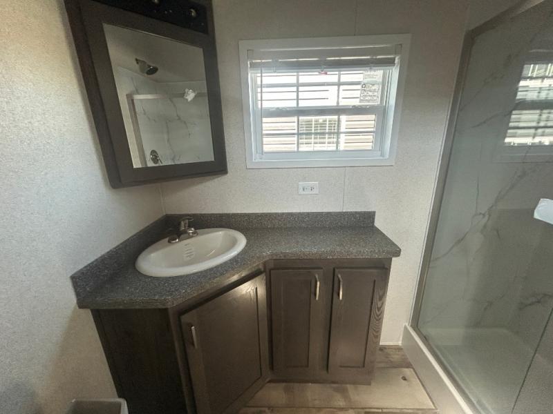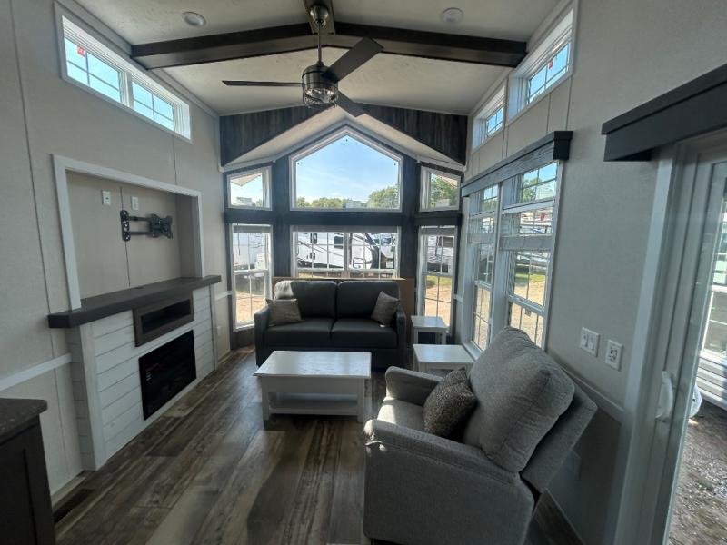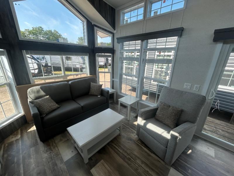 This park model is perfect for extended stays or full time living! You can relax in the front living room on the sofa and recliner, then head to the kitchen to make dinner on the four burner gas range or in the microwave. The full bath includes a one-piece spacious shower, lighted medicine cabinet and exhaust fan to keep air moving. And you'll love having your own space in the rear bedroom! You can also choose model 100185M if you are needing a loft for more sleeping space!