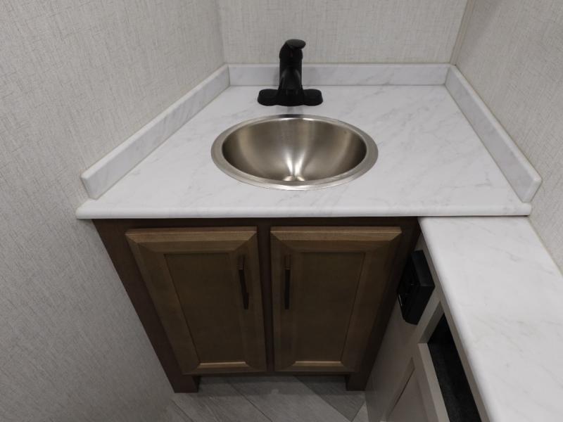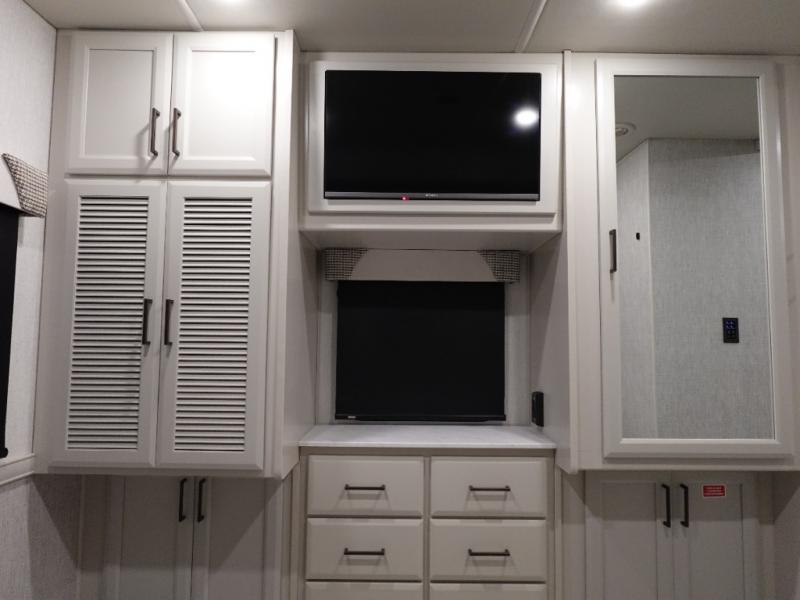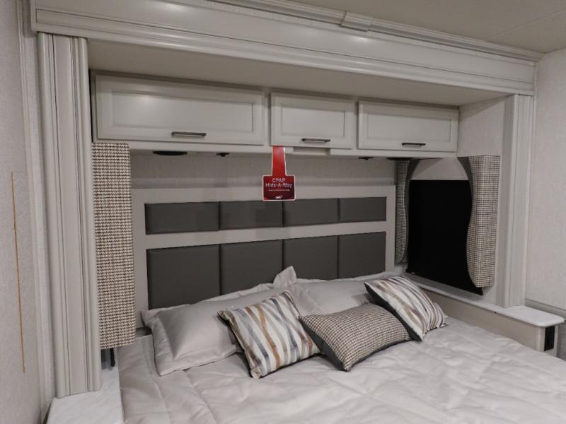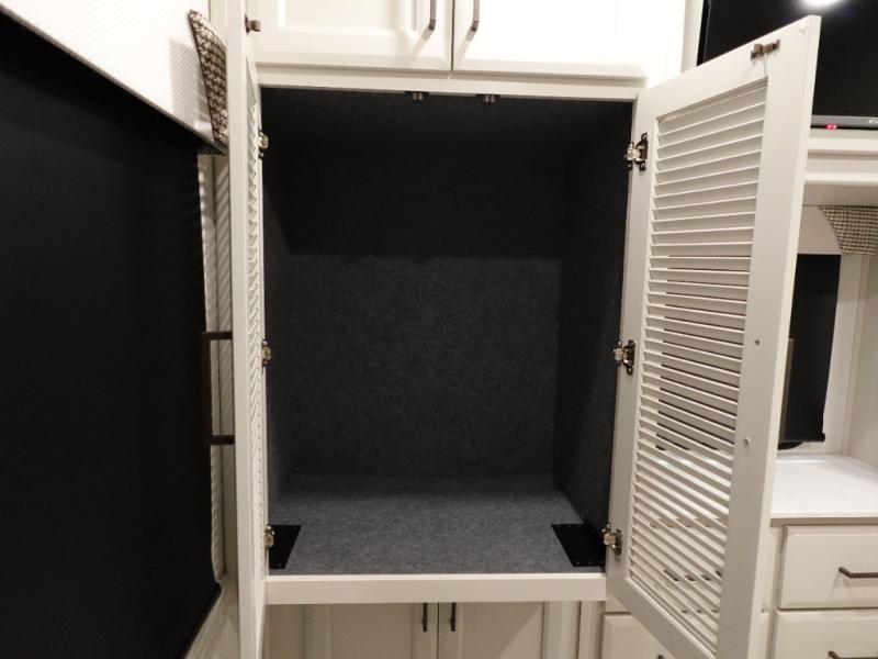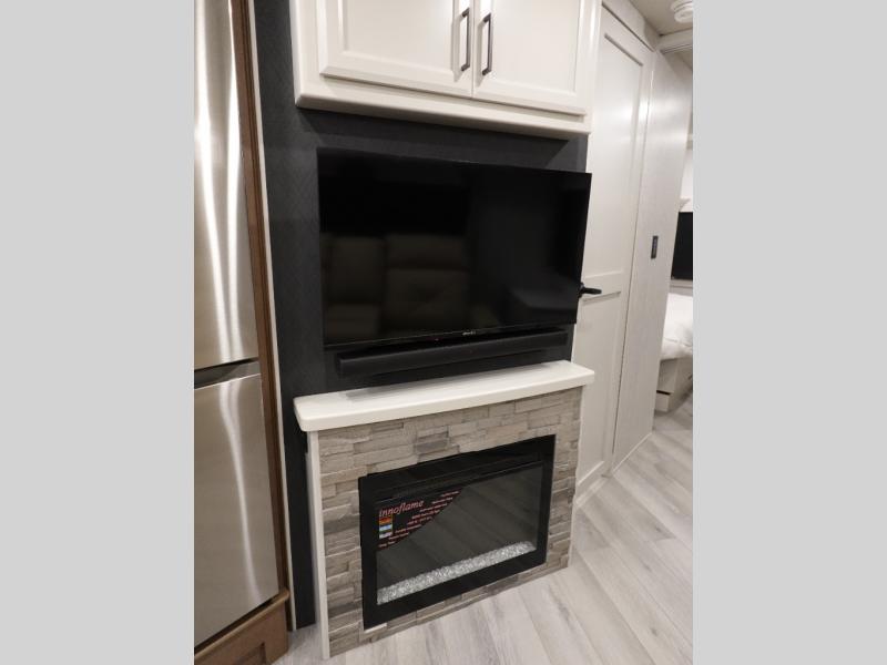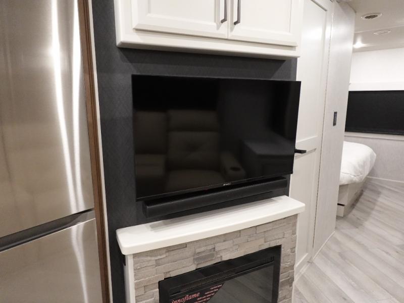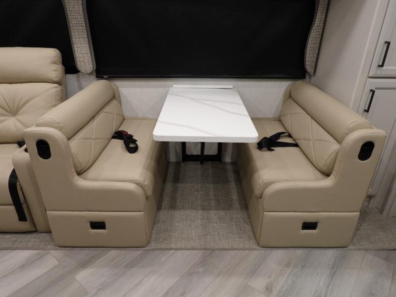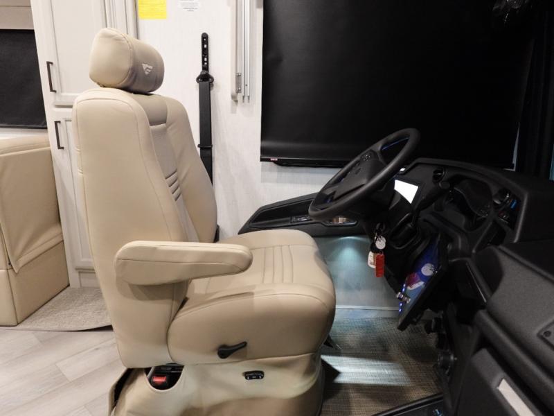 Get ready to live in this coach with all the amenities of home, yet your destination can change when you like! The rear bedroom offers a slide out king bed with CPAP storage above, plus wardrobes, a dresser and an LED TV to watch at night. The full bathroom offers a 24" x 40" shower with a seat so you can relax after shopping in town or hiking the trails. When you get hungry, the full kitchen offers a residential refrigerator, a convection microwave and pantry for all your goodies. The theater seats are across from the LED TV with a fireplace below for a great place to watch your shows, and the rest EZ dinette gives you a place to dine and even work if you need to. You can also enjoy your coffee while sitting in the driver and passenger seats that swivel with a pedestal table in between.