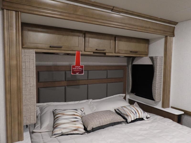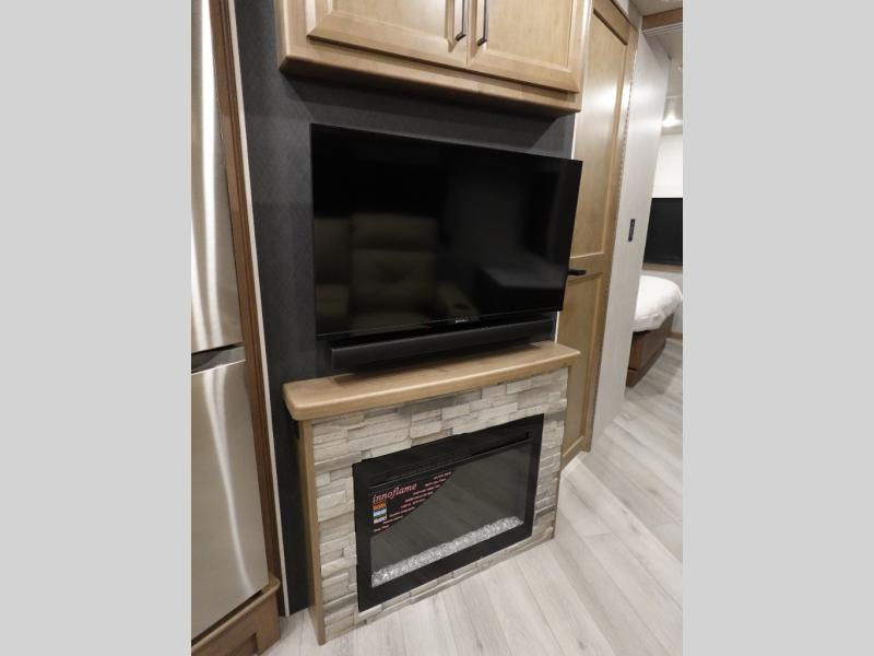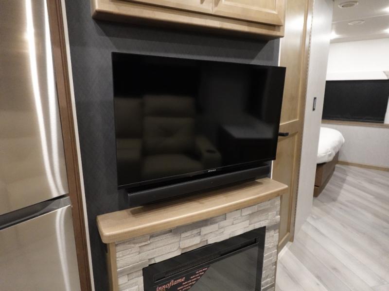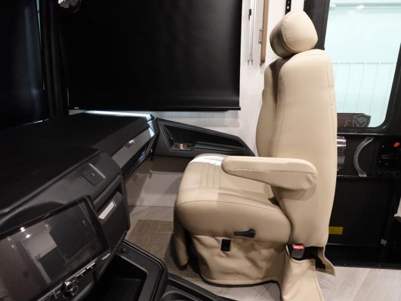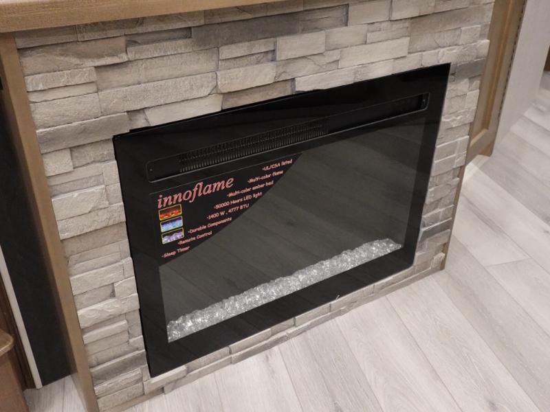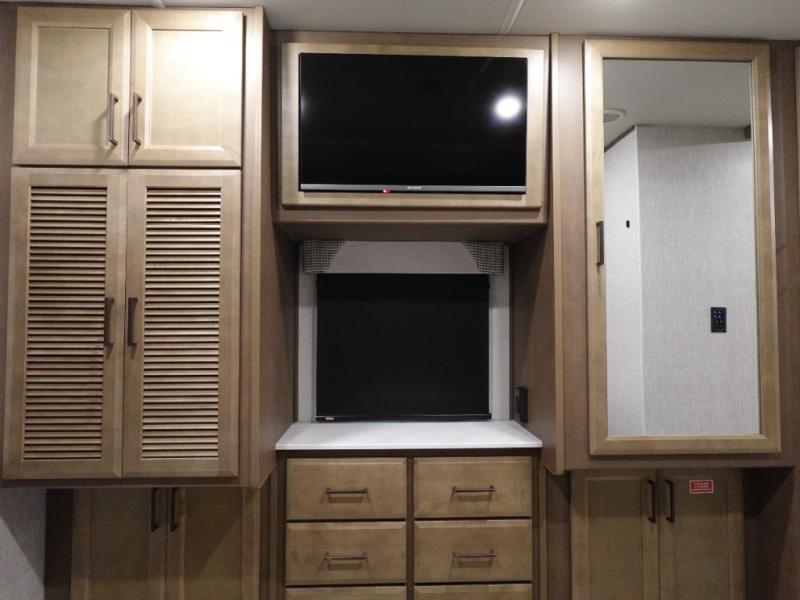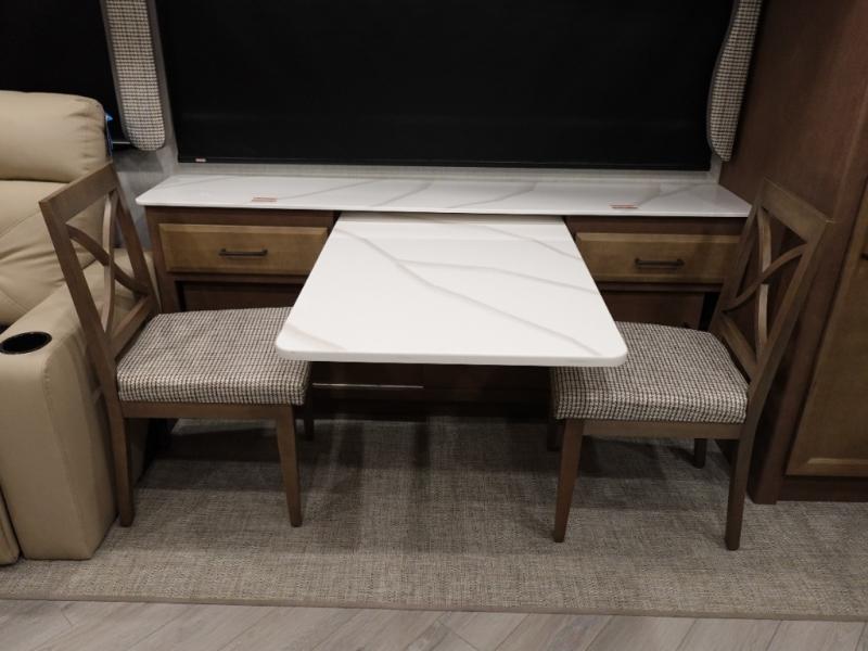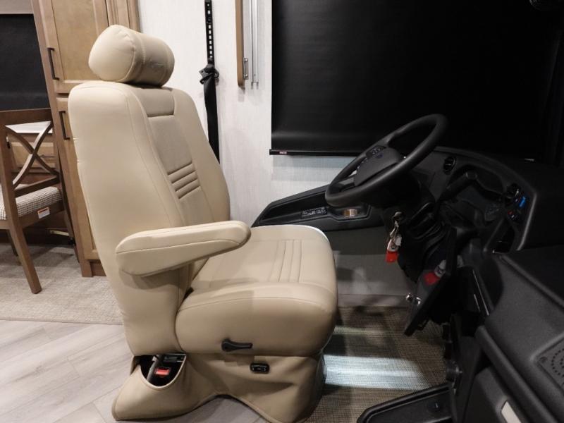 Get ready to live in this coach with all the amenities of home, yet your destination can change when you like! The rear bedroom offers a slide out king bed with CPAP storage above, plus wardrobes, a dresser and an LED TV to watch at night. The full bathroom offers a 24" x 40" shower with a seat so you can relax after shopping in town or hiking the trails. When you get hungry, the full kitchen offers a residential refrigerator, a convection microwave and pantry for all your goodies. The theater seats are across from the LED TV with a fireplace below for a great place to watch your shows, and the dinette gives you a place to dine and even work if you need to. You can also enjoy your coffee while sitting in the driver and passenger seats that swivel with a pedestal table in between.