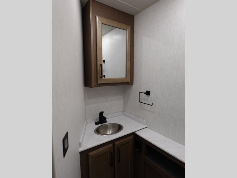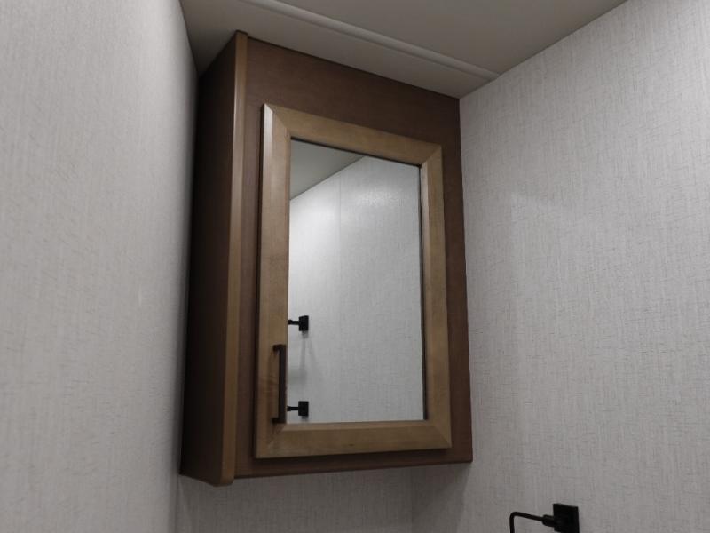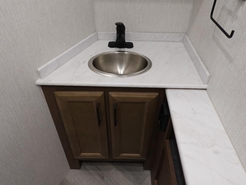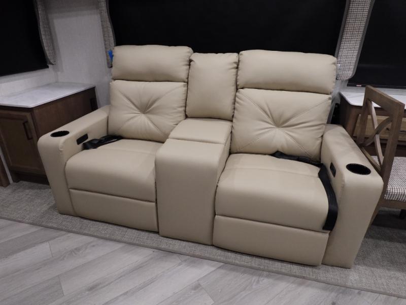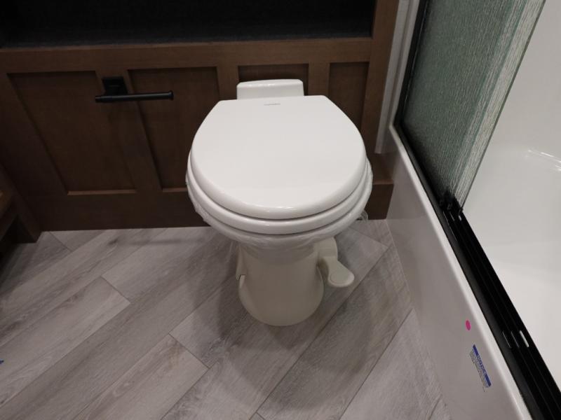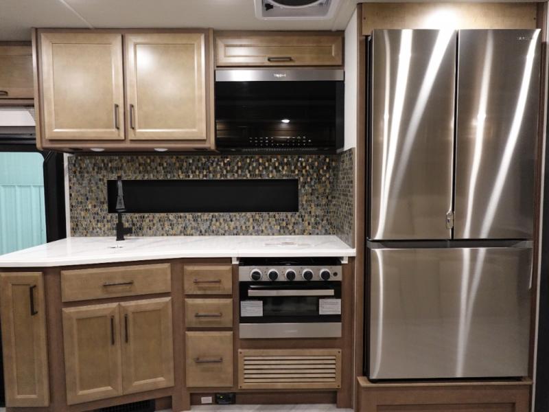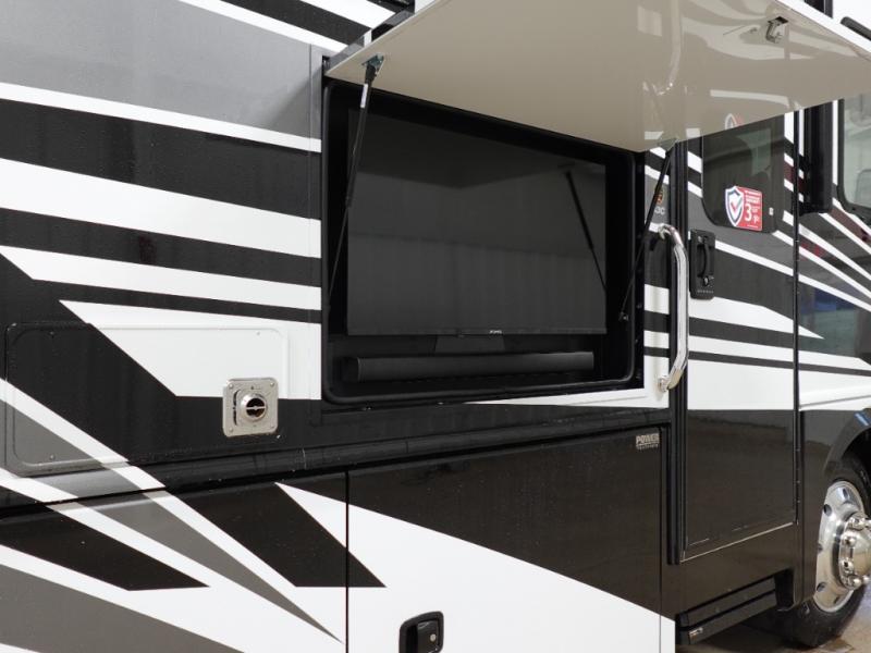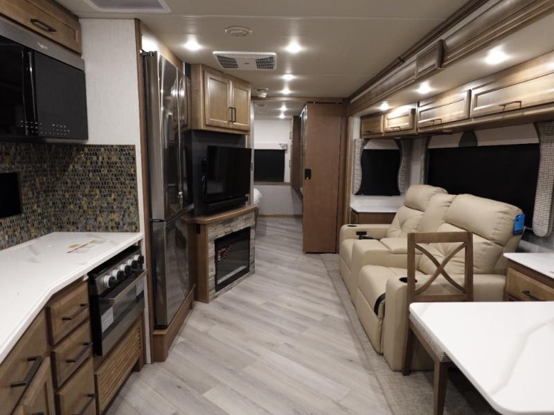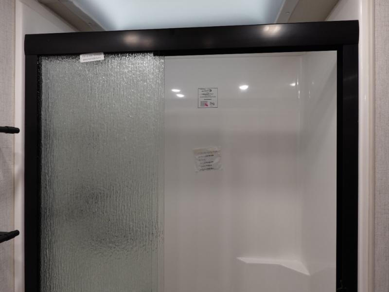 Get ready to live in this coach with all the amenities of home, yet your destination can change when you like! The rear bedroom offers a slide out king bed with CPAP storage above, plus wardrobes, a dresser and an LED TV to watch at night. The full bathroom offers a 24" x 40" shower with a seat so you can relax after shopping in town or hiking the trails. When you get hungry, the full kitchen offers a residential refrigerator, a convection microwave and pantry for all your goodies. The theater seats are across from the LED TV with a fireplace below for a great place to watch your shows, and the dinette gives you a place to dine and even work if you need to. You can also enjoy your coffee while sitting in the driver and passenger seats that swivel with a pedestal table in between.