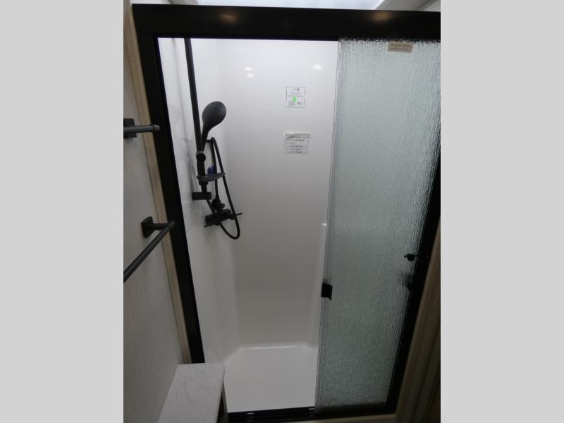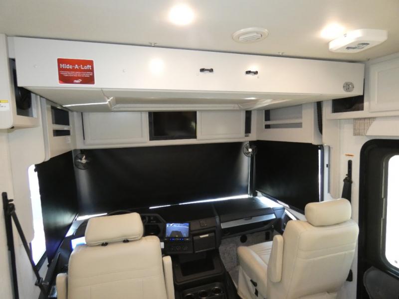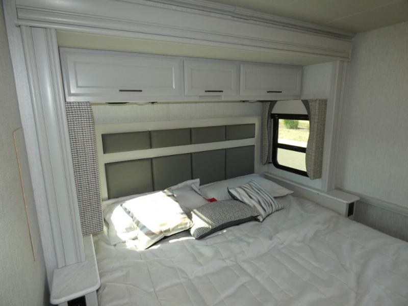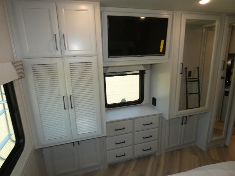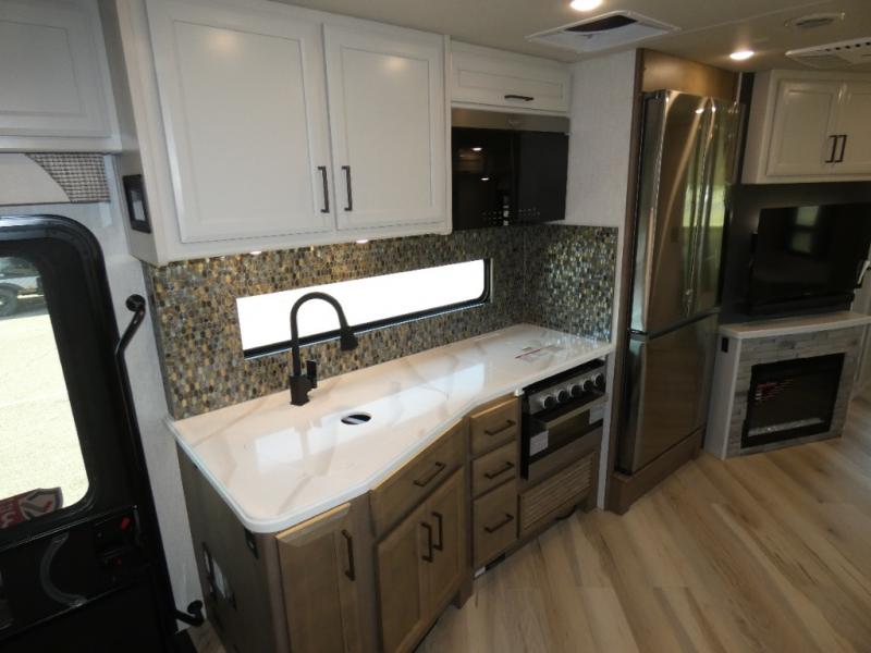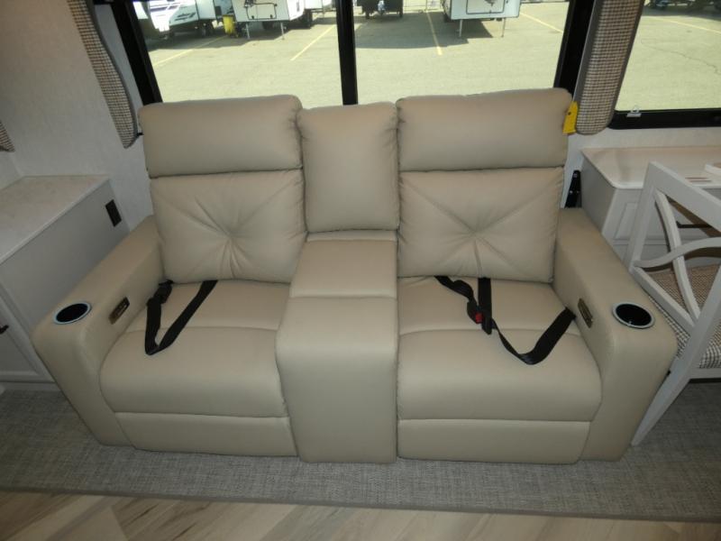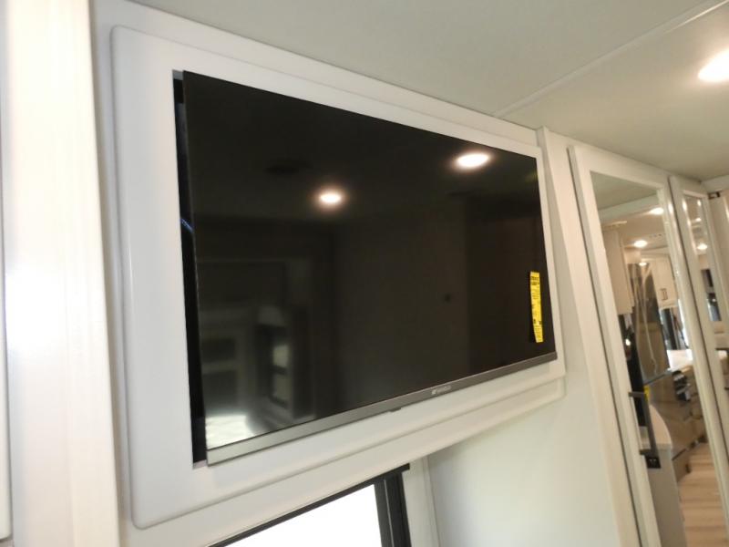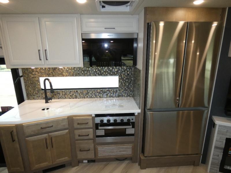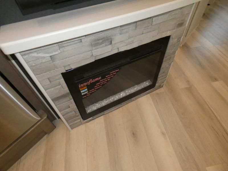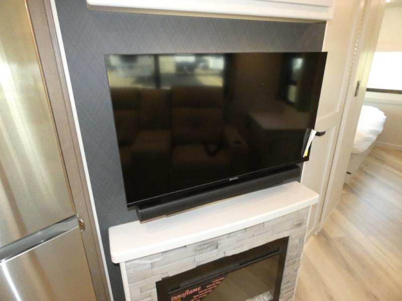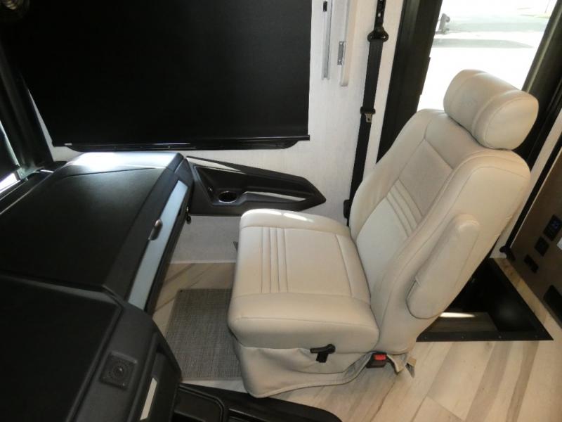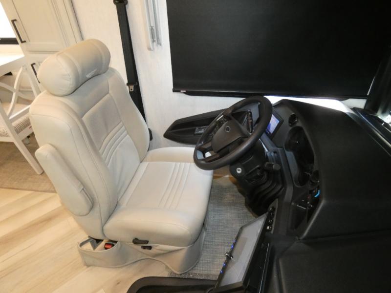 Get ready to live in this coach with all the amenities of home, yet your destination can change when you like! The rear bedroom offers a slide out king bed with CPAP storage above, plus wardrobes, a dresser and an LED TV to watch at night. The full bathroom offers a 24" x 40" shower with a seat so you can relax after shopping in town or hiking the trails. When you get hungry, the full kitchen offers a residential refrigerator, a convection microwave and pantry for all your goodies. The sofa and end table are across from the LED TV with a fireplace below for a great place to watch your shows, and the rest EZ dinette gives you a place to dine and even work if you need to. You can also enjoy your coffee while sitting in the driver and passenger seats that swivel with a pedestal table in between.