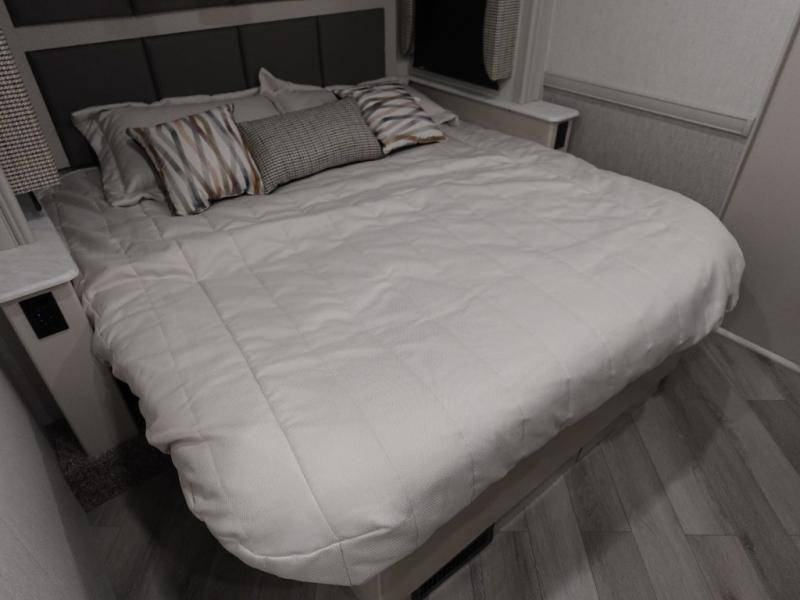When you are ready to travel the countryside, this coach will get you there in comfort with luxury and residential features that you deserve. The driver and passenger will love the automotive style dash with color monitor and workstation, plus the pedestal table in between. Your guests can use the mid-coach half bath while you have your own master suite with a king bed slide and storage, plus a full rear bathroom all to yourself.