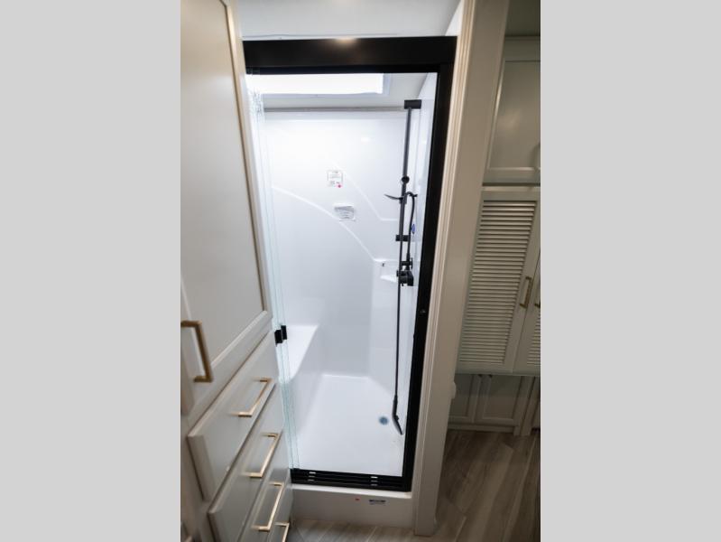 With any Bounder Class A gas motorhome by Fleetwood, you can travel in luxury and style with the power you desire to enjoy the ride as much as the destination. Beginning with the Power Platform Ford chassis, the enhanced safety features such as remote, power-heated mirrors with turn indicators and side cameras, and the color monitor for side and rear cameras, traveling is made easy. There is also an automotive one-piece windshield, a 100W solar panel, and WiFi Ranger Sky4 that come standard. A 5.5kW Onan generator will keep you powered up and you'll find plenty of storage both inside and out for personal belongings, camp gear, and more. Inside you will love the look of the durable, hand-laid Tarkett flooring, the energy efficient LED flush mount ceiling lighting, and the fiberglass shower with a glass door. Choose a Bounder Class A gas coach to discover even more stand-out features!