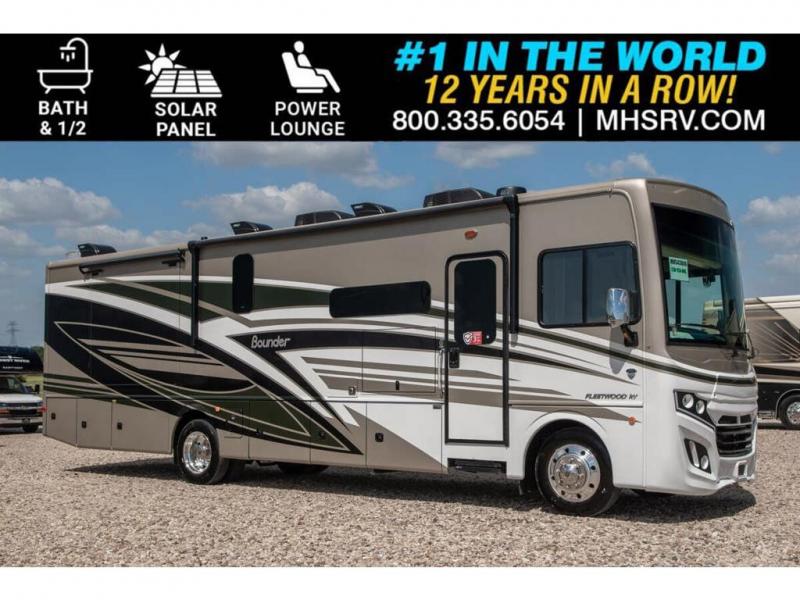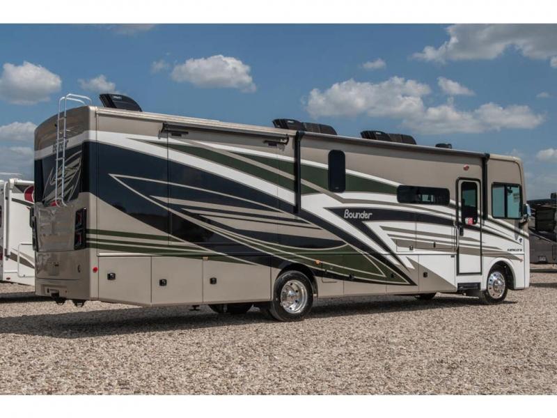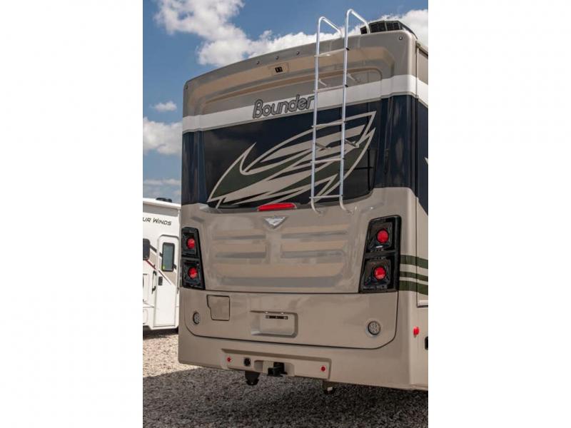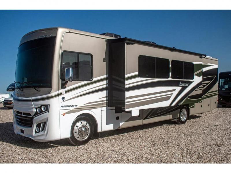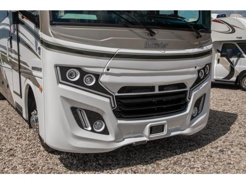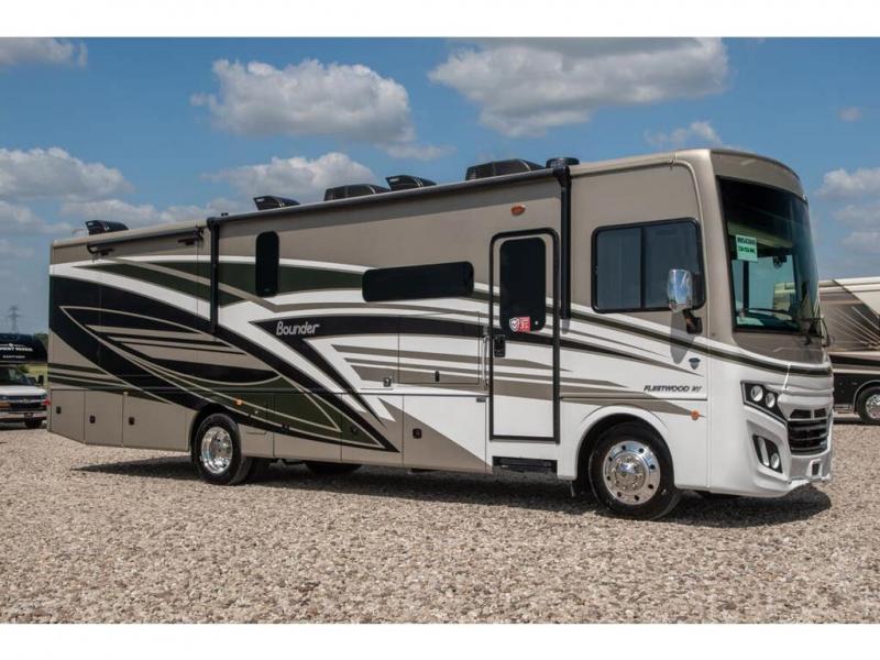 With any Bounder Class A gas motorhome by Fleetwood, you can travel in luxury and style with the power you desire to enjoy the ride as much as the destination. Beginning with the Power Platform Ford chassis, the enhanced safety features such as remote, power-heated mirrors with turn indicators and side cameras, and the color monitor for side and rear cameras, traveling is made easy. There is also an automotive one-piece windshield, a 100W solar panel, and WiFi Ranger Sky4 that come standard. A 5.5kW Onan generator will keep you powered up and you'll find plenty of storage both inside and out for personal belongings, camp gear, and more. Inside you will love the look of the durable, hand-laid Tarkett flooring, the energy efficient LED flush mount ceiling lighting, and the fiberglass shower with a glass door. Choose a Bounder Class A gas coach to discover even more stand-out features!