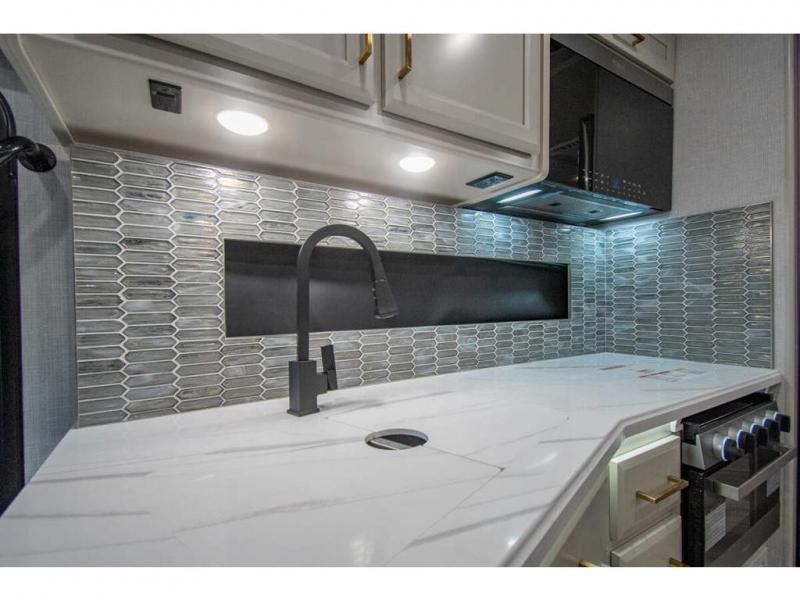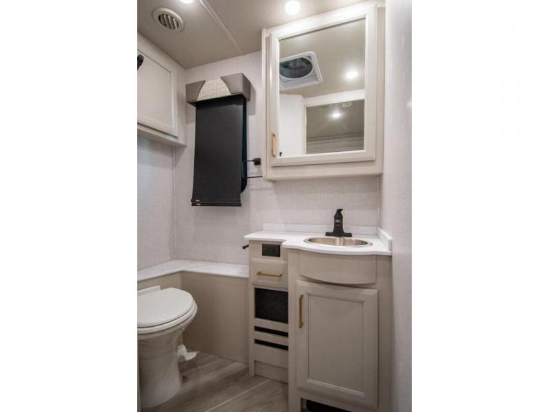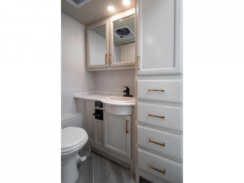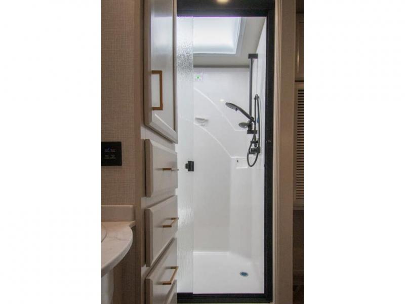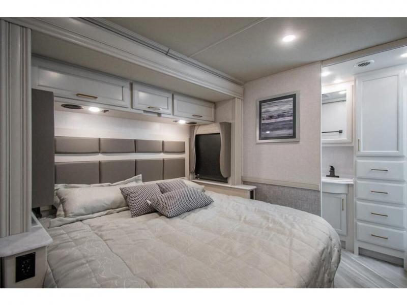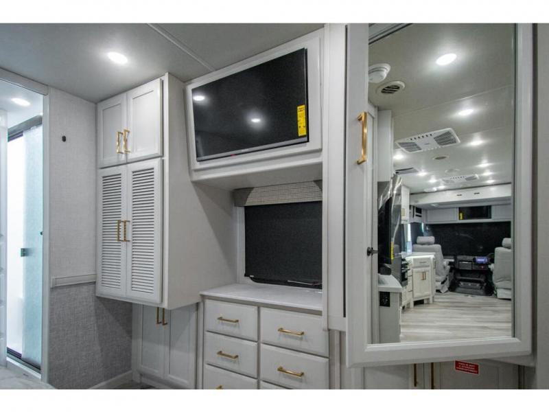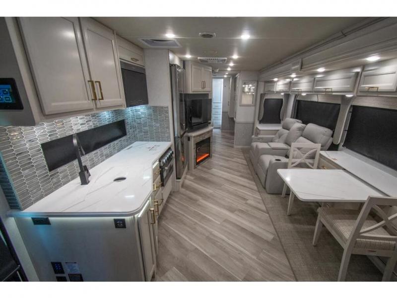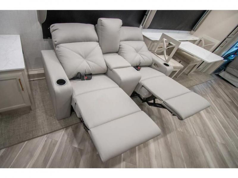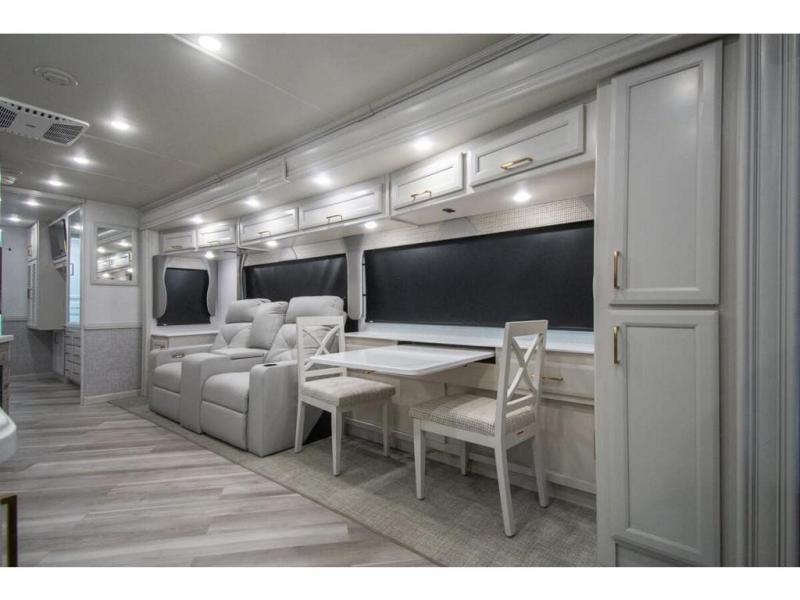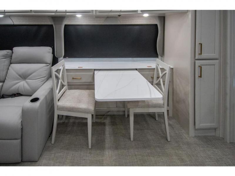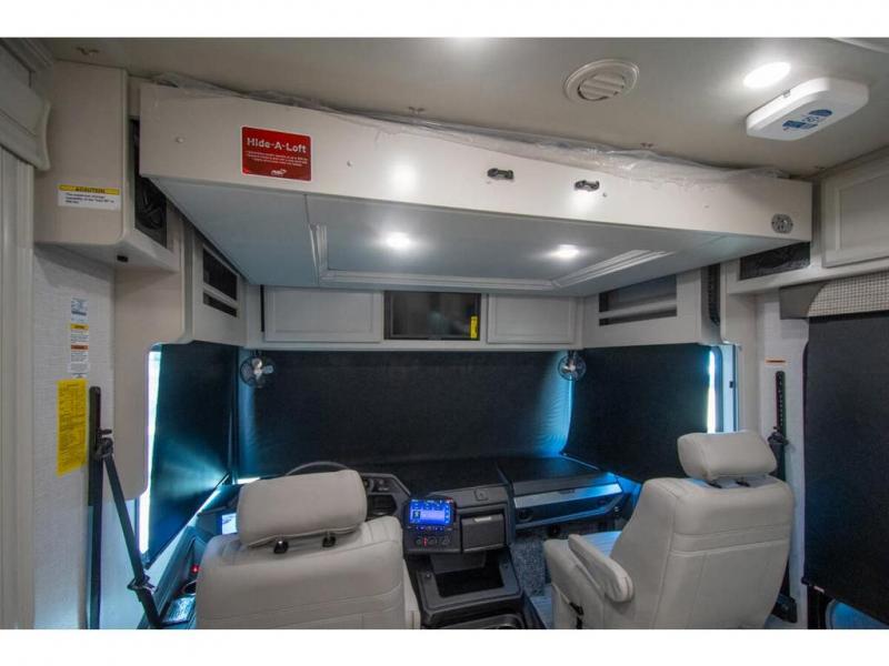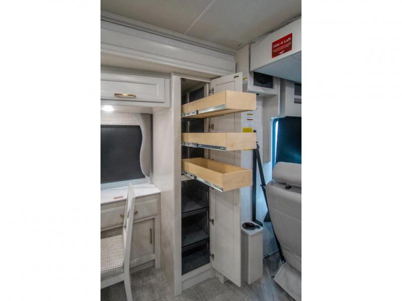 When you are ready to travel the countryside, this coach will get you there in comfort with luxury and residential features that you deserve. The driver and passenger will love the automotive style dash with color monitor and workstation, plus the pedestal table in between. Once you have setup for the evening, you might enjoy reclining back in the chairs or sitting on the jackknife sofa that offers guests a place to stay the night, along with the rest EZ dinette and the optional Hide-A-Loft power overhead bunk if you added that feature. Your guests can use the mid-coach half bath while you have your own master suite with a king bed slide and storage, plus a full rear bathroom all to yourself.