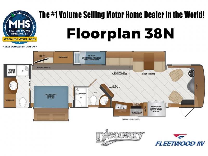 MSRP $520,214. All New 2026 Fleetwood Discovery 38N 2 Full Bath Bunk Model RV for sale at Motor Home Specialist; the #1 Volume Selling Motor Home Dealership in the World. This RV is approximately 38 feet 8 inch in length and features all-new exterior graphics and paint colors, washer/dryer, king bed, residential refrigerator, fireplace, 3 slides, a large living area, Vacu-Bonded floors, walls and ceilings with powerlock system, the Exclusive Freedom Bridge® w/Freightliner® Custom Chassis XCM, tire pressure monitoring system, heated fresh water and holding tank compartments, Molded-Fiberglass one-piece roof, fiberglass rear cap, slideout awning toppers above all slideouts, automatic hydraulic leveling jacks, automatic entrance steps, full bay slide tray, 7-way round tow connection, front and rear mud flaps, automotive one piece bonded windshield, floor heat, porcelain tile flooring, 2000W pure sine inverter, whole coach water filtration system, Aqua-hot, auto gen start, central vacuum system, full extension drawer guides, and keyless entry. This well appointed RV also features the optional dishwasher, motion power lounge, drop down queen loft, technology package, L-shaped dinette, third roof AC, black out wheels and FCCC brakesync. **Unit Not California CARB Compliant and Cannot be Registered in California**. Shop a huge selection of diesel pusher motorhomes all at 1 location! Choose from Thor Motor Coach Palazzo – Riviera – Aria – Fleetwood Discovery – Frontier – Holiday Rambler Endeavor – Nautica – Entegra Coach Reatta – Aspire and more. We also buy and sell quality pre-owned models such Newmar Mountain Aire – Dutch Star – New Aire – Ventana – Kountry Star – Northern Star - Allegro Bus – Phaeton – Allegro Red – Byway – Allegro Breeze – Winnebago Journey – Forza – Coachmen Sportscoach – Thor Venetian – Tuscany and much more. Visit MHSRV.com for our complete line-up and the sale prices that have made us the #1 volume selling motor home dealership in the world 12 years in a row! For additional details on this unit and our entire inventory including brochures, window sticker, videos, photos, reviews & testimonials as well as additional information about Motor Home Specialist and our manufacturers please visit us at MHSRV.com or call 800-335-6054. At Motor Home Specialist, we DO NOT charge any prep or orientation fees like you will find at other dealerships. All sale prices include a 200-point inspection, interior & exterior wash, detail service and a fully automated high-pressure rain booth test and coach wash that is a standout service unlike that of any other in the industry. You will also receive a thorough coach orientation with an MHSRV technician, a night stay in our delivery park featuring landscaped and covered pads with full hook-ups and much more! Read Thousands upon Thousands of 5-Star Reviews at MHSRV.com and See What They Had to Say About Their Experience at Motor Home Specialist. WHY PAY MORE? WHY SETTLE FOR LESS?