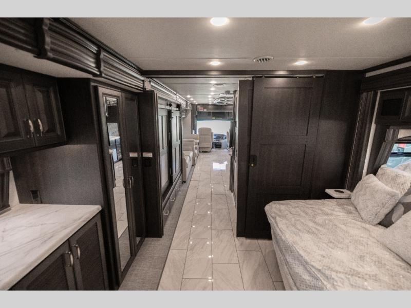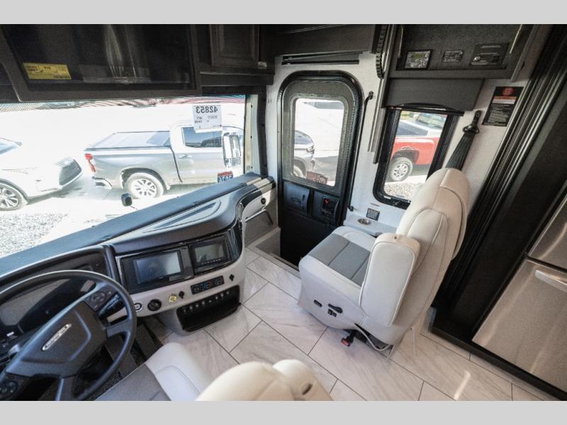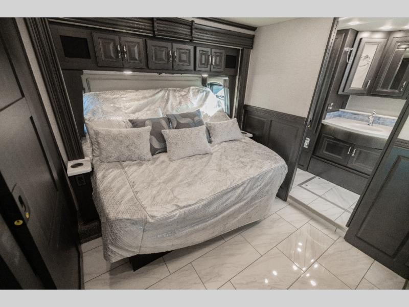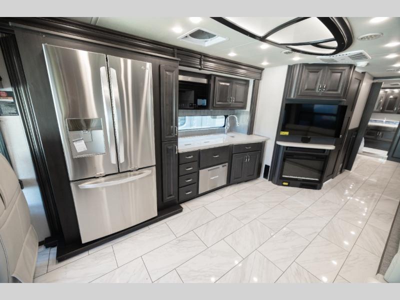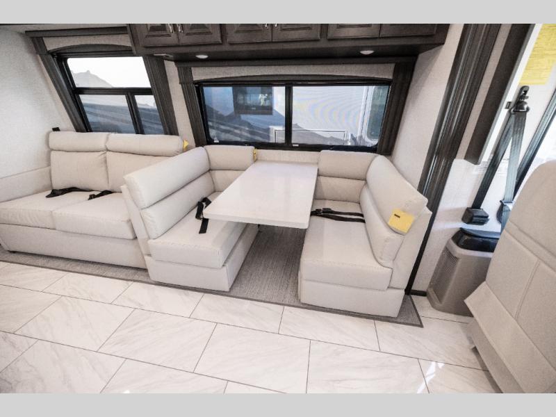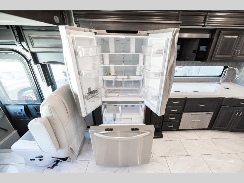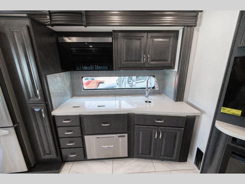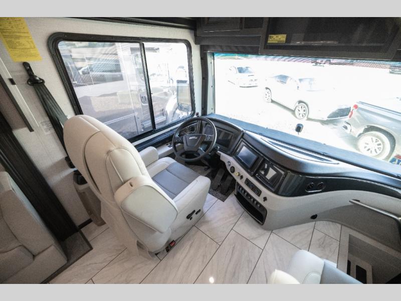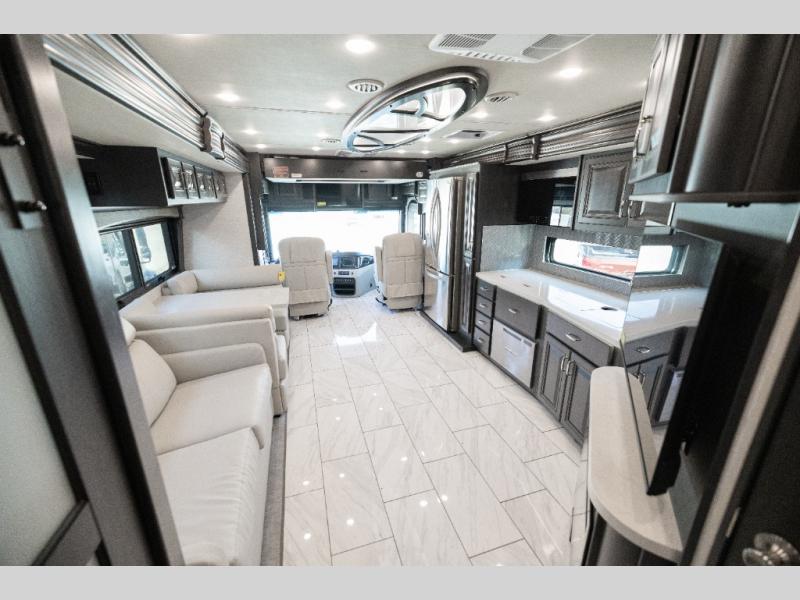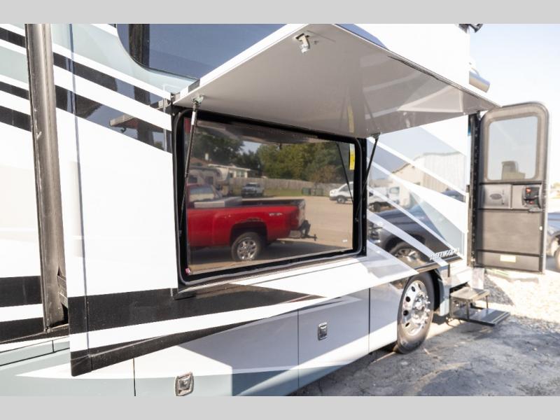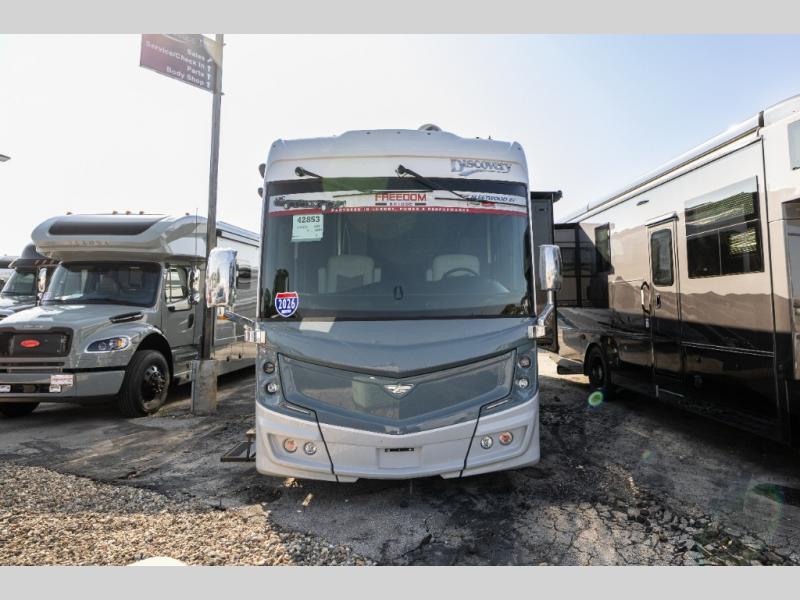 With any Fleetwood Discovery Class A diesel motorhome, the Freedom Bridge custom chassis, the V-Ride rear suspension, and the Cummins B6.7 engine offer a smooth and enjoyable ride to all your destinations. The construction also includes the Powerlock System with interlocking floor, walls and roof, heated fresh water and holding tank compartments, and a full coverage heavy duty undercoating. The interior cabin includes an LED OptiView instrument panel, an air suspension deflation system, and a 10.2" stereo touch screen with lots of functions making traveling easier. And you will love the style of the interior decor and cabinetry, energy efficient LED flush mount ceiling lighting, polished solid surface galley countertop with lighting, residential features throughout, and all the entertainment. Choose to travel and live better in a Discovery!